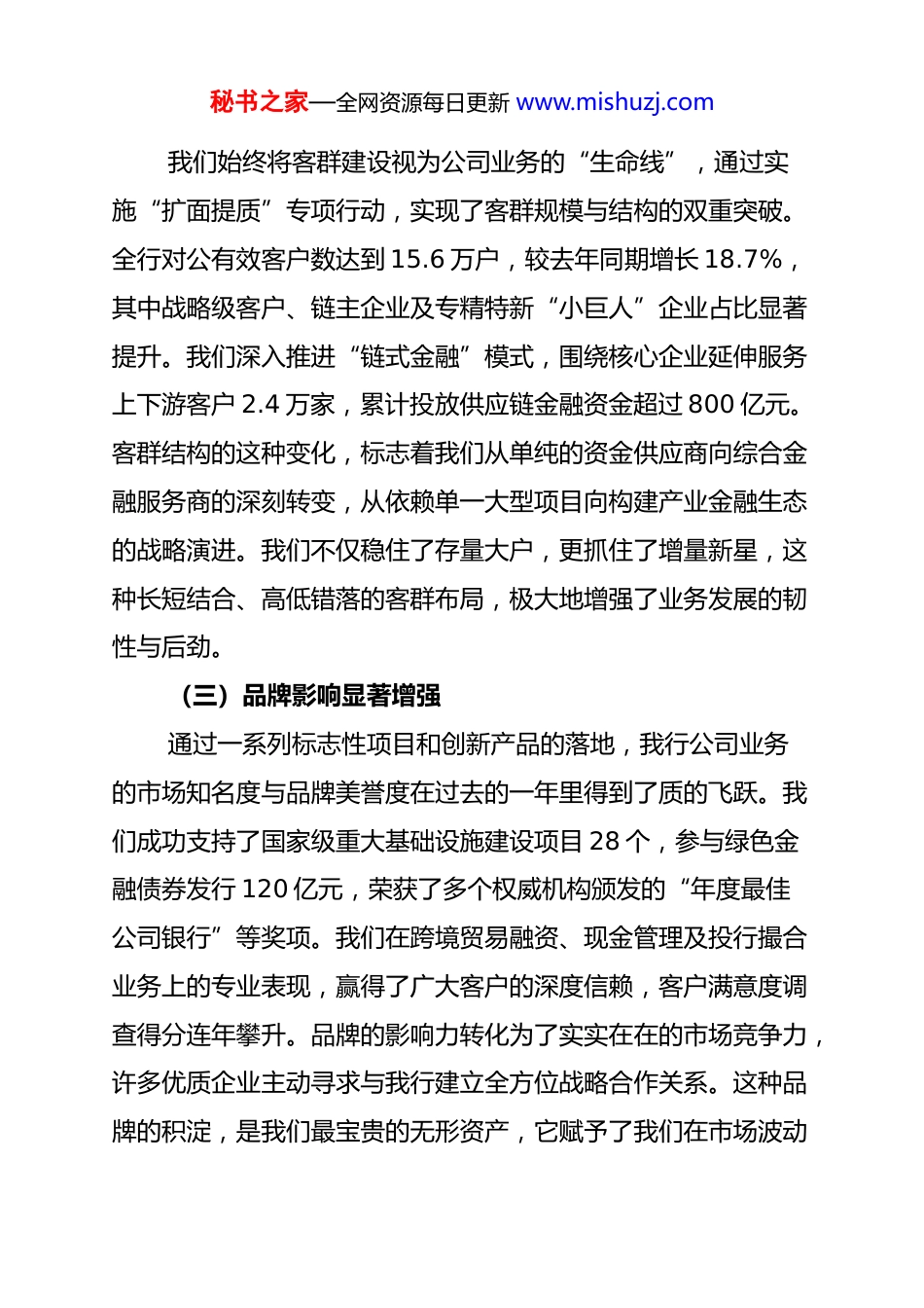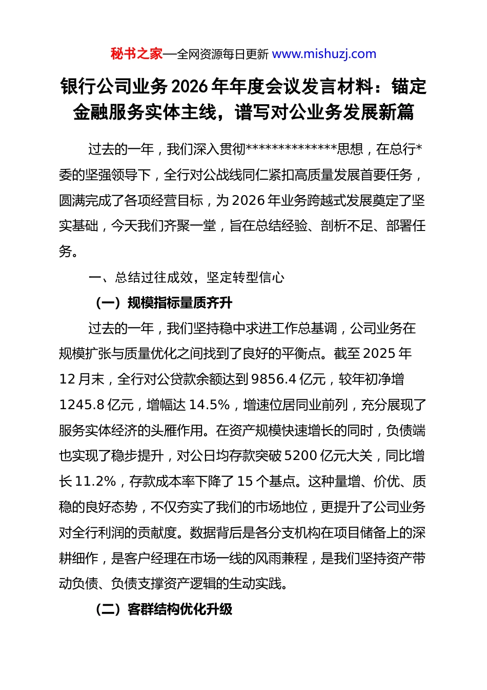 秘书之家—全网资源每日更新 www.mishuzj.com银行公司业务 2026 年年度会议发言材料:锚定金融服务实体主线,谱写对公业务发展新篇过去的一年,我们深入贯彻**************思想,在总行*委的坚强领导下,全行对公战线同仁紧扣高质量发展首要任务,圆满完成了各项经营目标,为 2026 年业务跨越式发展奠定了坚实基础,今天我们齐聚一堂,旨在总结经验、剖析不足、部署任务。一、总结过往成效,坚定转型信心(一)规模指标量质齐升过去的一年,我们坚持稳中求进工作总基调,公司业务在规模扩张与质量优化之间找到了良好的平衡点。截至 2025 年12 月末,全行对公贷款余额达到 9856.4 亿元,较年初净增1245.8 亿元,增幅达 14.5%,增速位居同业前列,充分展现了服务实体经济的头雁作用。在资产规模快速增长的同时,负债端也实现了稳步提升,对公日均存款突破 5200 亿元大关,同比增长 11.2%,存款成本率下降了 15 个基点。这种量增、价优、质稳的良好态势,不仅夯实了我们的市场地位,更提升了公司业务对全行利润的贡献度。数据背后是各分支机构在项目储备上的深耕细作,是客户经理在市场一线的风雨兼程,是我们坚持资产带动负债、负债支撑资产逻辑的生动实践。(二)客群结构优化升级秘书之家—全网资源每日更新 www.mishuzj.com我们始终将客群建设视为公司业务的“生命线”,通过实施“扩面提质”专项行动,实现了客群规模与结构的双重突破。全行对公有效客户数达到 15.6 万户,较去年同期增长 18.7%,其中战略级客户、链主企业及专精特新“小巨人”企业占比显著提升。我们深入推进“链式金融”模式,围绕核心企业延伸服务上下游客户 2.4 万家,累计投放供应链金融资金超过 800 亿元。客群结构的这种变化,标志着我们从单纯的资金供应商向综合金融服务商的深刻转变,从依赖单一大型项目向构建产业金融生态的战略演进。我们不仅稳住了存量大户,更抓住了增量新星,这种长短结合、高低错落的客群布局,极大地增强了业务发展的韧性与后劲。(三)品牌影响显著增强通过一系列标志性项目和创新产品的落地,我行公司业务的市场知名度与品牌美誉度在过去的一年里得到了质的飞跃。我们成功支持了国家级重大基础设施建设项目 28 个,参与绿色金融债券发行 120 亿元,荣获了多个权威机构颁发的“年度最佳公司银行”等奖项。我们在跨境贸易融资、现金管理及投行撮合业务上的专业表现,赢得了广大客户的深度信赖,客户满意度调查得分连年攀升。品牌的影响力转化为了实实在在的市场竞争力,许多优质企业主动寻求与我行建立全方位战略合作关系。这种品牌的积淀,是我们最宝贵的无形资产,它赋予了我们在市场波动秘书之家—全网资源每日更新 www.mishuzj.com中保持战略定力的底气,也为我们在 2026 年开辟新领域、占领新高地提供了强有力的信誉保障。二、剖析当前短板,增强忧患意识(一)创新驱动仍显不足尽管我们在传统业务领域保持了优势,但在面对新质生产力带来的金融需求变化时,产品创新的响应速度和精准度仍显滞后。目前,我们的业务结构中,传统抵押类贷款占比依然较高,而基于知识产权、数据要素、碳权等新型权利质押的创新产品尚未形成规模效应。部分分支机构仍存在“路径依赖”,倾向于在成熟市场中低水平竞争,而不愿在未知领域探索突破。在数字化金融产品的迭代上,用户体验仍有提升空间,系统间的交互逻辑有时无法完全契合企业的生产经营场景。这种创新能力的短板,如果不能尽快补齐,将使我们在未来更加激烈的差异化竞争中处于不利地位,甚至可能丧失对新兴产业的话语权。(二)风控手段有待提升在金融科技迅猛发展的背景下,我们的风险管理理念和手段尚未完全跟上业务数字化的步伐。当前对公业务的风险识别仍较多依赖于财务报表和线下尽调,利用大数据进行实时动态监测的能力还有待加强,预警信号的敏感度和准确性存在“时滞”现象。在处理复杂产业金融风险时,我们缺乏跨行业的专业深度,对产业链上下游风险传导的推演不够系统。此外,个别基层行在秘书之家—全网资源每日更新 www.mishuzj.com业务拓展过程中,存在重规模轻合规、重贷前轻贷后的...