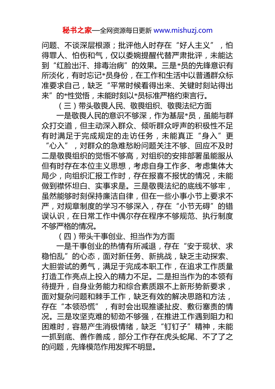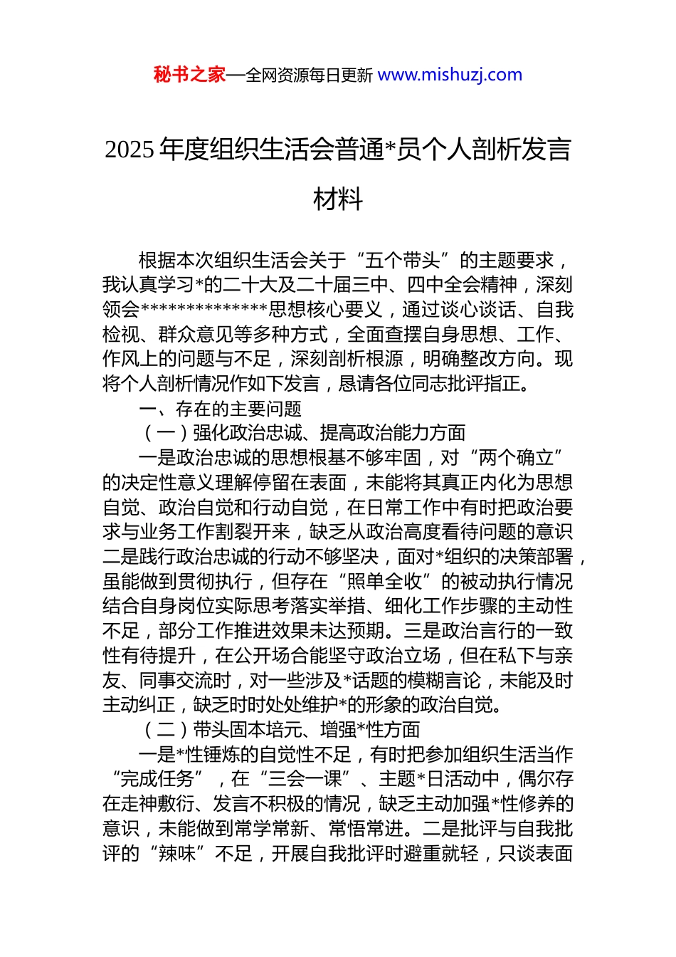 秘书之家—全网资源每日更新 www.mishuzj.com2025 年度组织生活会普通*员个人剖析发言材料根据本次组织生活会关于“五个带头”的主题要求,我认真学习*的二十大及二十届三中、四中全会精神,深刻领会**************思想核心要义,通过谈心谈话、自我检视、群众意见等多种方式,全面查摆自身思想、工作、作风上的问题与不足,深刻剖析根源,明确整改方向。现将个人剖析情况作如下发言,恳请各位同志批评指正。一、存在的主要问题(一)强化政治忠诚、提高政治能力方面一是政治忠诚的思想根基不够牢固,对“两个确立”的决定性意义理解停留在表面,未能将其真正内化为思想自觉、政治自觉和行动自觉,在日常工作中有时把政治要求与业务工作割裂开来,缺乏从政治高度看待问题的意识二是践行政治忠诚的行动不够坚决,面对*组织的决策部署,虽能做到贯彻执行,但存在“照单全收”的被动执行情况结合自身岗位实际思考落实举措、细化工作步骤的主动性不足,部分工作推进效果未达预期。三是政治言行的一致性有待提升,在公开场合能坚守政治立场,但在私下与亲友、同事交流时,对一些涉及*话题的模糊言论,未能及时主动纠正,缺乏时时处处维护*的形象的政治自觉。(二)带头固本培元、增强*性方面一是*性锤炼的自觉性不足,有时把参加组织生活当作“完成任务”,在“三会一课”、主题*日活动中,偶尔存在走神敷衍、发言不积极的情况,缺乏主动加强*性修养的意识,未能做到常学常新、常悟常进。二是批评与自我批评的“辣味”不足,开展自我批评时避重就轻,只谈表面秘书之家—全网资源每日更新 www.mishuzj.com问题、不谈深层根源;批评他人时存在“好人主义”,怕得罪人、怕伤和气,仅以委婉提醒代替严肃批评,未能达到“红脸出汗、排毒治病”的效果。三是*员的先锋意识有所淡化,有时忘记*员身份,在工作和生活中以普通群众标准要求自己,缺乏“平常时候看得出来、关键时刻站得出来”的*性觉悟,未能时刻以*员标准严格约束言行。(三)带头敬畏人民、敬畏组织、敬畏法纪方面一是敬畏人民的意识不够深,作为基层*员,虽能与群众打交道,但主动深入群众、倾听群众呼声的积极性不足有时满足于完成规定的走访任务,未能真正“身入”更“心入”,对群众的急难愁盼问题关注不够、回应不及时二是敬畏组织的觉悟不够高,对组织的安排部署虽能服从但有时存在本位主义思想,考虑自身工作多、考虑集体大局少,向组织汇报工作时,存在报喜不报忧的情况,未能做到襟怀坦白、实事求是。三是敬畏法纪的底线不够牢,虽然能够时刻保持廉洁自律,但在一些小事小节上要求不严,对规章制度的学习不够深入,存在“小节无碍”的错误认识,在日常工作中偶尔存在程序不够规范、执行制度不够严格的情况。(四)带头干事创业、担当作为方面一是干事创业的热情有所减退,存在“安于现状、求稳怕乱”的心态,面对新任务、新挑战,缺乏主动探索、大胆尝试的勇气,满足于完成本职工作,在追求工作质量打造工作亮点上投入的精力不足。二是担当作为的本领有待提升,自身业务能力和综合素质跟不上新形势新要求,面对复杂问题和棘手工作,缺乏有效的解决思路和方法,存在“本领恐慌”,有时会出现推诿扯皮、敷衍塞责的情况。三是攻坚克难的韧劲不够强,在推进工作遇到阻力和困难时,容易产生消极情绪,缺乏“钉钉子”精神,未能一抓到底、善作善成,部分工作存在虎头蛇尾、不了了之的问题,先锋模范作用发挥不明显。秘书之家—全网资源每日更新 www.mishuzj.com(五)带头坚决扛起管*治*责任方面一是管*治*的责任意识淡薄,作为普通*员,有时认为管*治*是*组织和领导干部的事,与自身关系不大,缺乏“人人都是管*治*参与者”的思想认识,未能主动履行*员在管*治*中的应尽责任。二是*内监督的主动性不足,对身边*员同志存在的一些苗头性、倾向性问题,未能及时提醒、制止,存在“多一事不如少一事”的心态,参与*内监督以及开展监督的方式方法较少。三是作风建设的自我要求不严,对中央八项规定精神的学习不够深入,对形式主义、官僚主义的隐形变异问题辨别能力不足,在工作中有时存在重痕迹、轻实效的形式主义倾向,未能以...