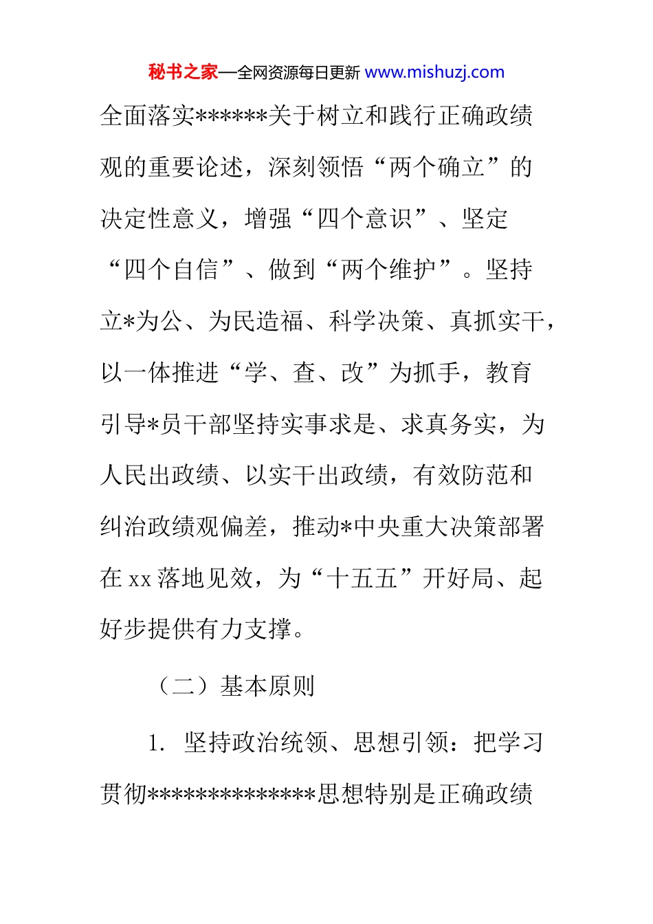 秘书之家—全网资源每日更新 www.mishuzj.com河南省 xx 市树立和践行正确政绩观学习教育实施方案为深入学习贯彻**************思想和*的二十大精神,全面落实《中共中央办公厅关于在全*开展树立和践行正确政绩观学习教育的通知》要求,引导全市*员干部牢固树立和践行正确政绩观,为奋力谱写中国式现代化建设 xx 篇章提供坚强思想保证和作风保障,结合我市实际,制定本实施方案。一、总体要求(一)指导思想坚持以**************思想为指导,深入贯彻*的二十大和二十届历次全会精神,秘书之家—全网资源每日更新 www.mishuzj.com全面落实******关于树立和践行正确政绩观的重要论述,深刻领悟“两个确立”的决定性意义,增强“四个意识”、坚定“四个自信”、做到“两个维护”。坚持立*为公、为民造福、科学决策、真抓实干,以一体推进“学、查、改”为抓手,教育引导*员干部坚持实事求是、求真务实,为人民出政绩、以实干出政绩,有效防范和纠治政绩观偏差,推动*中央重大决策部署在 xx 落地见效,为“十五五”开好局、起好步提供有力支撑。(二)基本原则1. 坚持政治统领、思想引领:把学习贯彻**************思想特别是正确政绩秘书之家—全网资源每日更新 www.mishuzj.com观重要论述作为首要政治任务,引导*员干部从思想上正本清源、固本培元。2. 坚持人民至上、为民造福:把“为民造福是最大政绩”贯穿学习教育全过程,把群众满意不满意作为检验政绩的根本标准,多做让群众看得见、摸得着、得实惠的实事。3. 坚持实事求是、遵循规律:完整、准确、全面贯彻新发展理念,尊重客观规律,按规律办事,坚决防止脱离实际、急功近利、盲目蛮干。4. 坚持问题导向、标本兼治:聚焦政绩观错位、偏差问题,一体推进“学、查、改”,既解决思想问题,又健全制度机制,秘书之家—全网资源每日更新 www.mishuzj.com推动*员干部习惯在监督和约束下工作生活。5. 坚持简约务实、力戒形式主义:严格落实中央八项规定精神,坚决防止形式主义、官僚主义,防止层层加码、增加基层负担,确保学习教育不走过场、取得实效。(三)主要目标通过学习教育,推动全市*员干部在政绩观上来一次大洗礼、大提升,实现“五个进一步”目标:1. 理论武装进一步强化:对******关于树立和践行正确政绩观的重要论述学深悟透,自觉用以武装头脑、指导实践、推秘书之家—全网资源每日更新 www.mishuzj.com动工作。2. *性修养进一步增强:*员干部理想信念更加坚定,宗旨意识更加牢固,*性修养明显提升,干事创业的精气神全面提振。3. 政绩导向进一步鲜明:形成重实绩、重实干、重担当的鲜明导向,推动形成能者上、优者奖、庸者下、劣者汰的良好局面。4. 发展质效进一步提升:高质量发展迈出新步伐,民生福祉持续改善,生态环境质量不断向好,社会大局和谐稳定,发展成果更多更公平惠及全市人民。5. 长效机制进一步健全:形成一批务实管用的制度成果,推动树立和践行正确秘书之家—全网资源每日更新 www.mishuzj.com政绩观常态化、长效化。二、范围对象学习教育在全市各级*组织和全体*员干部中开展,以县处级以上领导班子和领导干部特别是“一把手”为重点,覆盖机关、企事业单位、乡镇(街道)、村(社区)等各领域各层级。 三、时间安排学习教育自 2026 年春节假期后启动,至 2026 年 7 月底基本结束,不分批次、不划阶段,一体推进学习研讨、查摆问题、整改整治、建章立制、开门教育等工作安排。秘书之家—全网资源每日更新 www.mishuzj.com四、重点任务(一)深化理论学习,筑牢正确政绩观的思想根基1. 明确学习内容: 核心内容:系统学习******关于树立和践行正确政绩观的重要论述,深刻领会“政绩为谁而树、树什么样的政绩、靠什么树政绩”的核心要义。 重要文件:学习*的二十大报告、历次全会精神及《中共中央关于制定国民经济和社会发展第十五个五年规划的建议》等。 重要精神:学习******视察河南重要讲话****精神,以及对本地区本领域秘书之家—全网资源每日更新 www.mishuzj.com工作的****批示精神。 *章*规 dj:学习《中国共产*章程》《中国共产 dj 律处分条例》等,强...