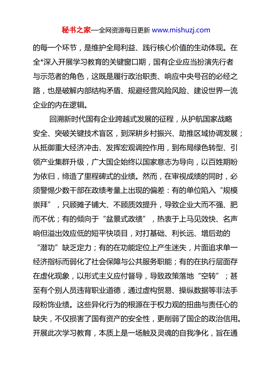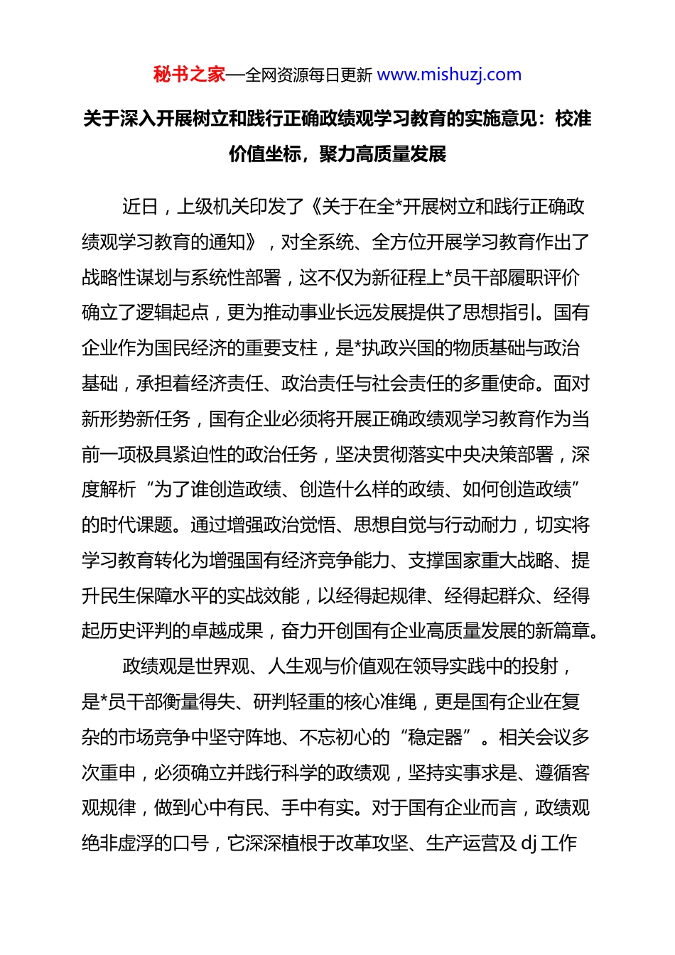 秘书之家—全网资源每日更新 www.mishuzj.com关于深入开展树立和践行正确政绩观学习教育的实施意见:校准价值坐标,聚力高质量发展近日,上级机关印发了《关于在全*开展树立和践行正确政绩观学习教育的通知》,对全系统、全方位开展学习教育作出了战略性谋划与系统性部署,这不仅为新征程上*员干部履职评价确立了逻辑起点,更为推动事业长远发展提供了思想指引。国有企业作为国民经济的重要支柱,是*执政兴国的物质基础与政治基础,承担着经济责任、政治责任与社会责任的多重使命。面对新形势新任务,国有企业必须将开展正确政绩观学习教育作为当前一项极具紧迫性的政治任务,坚决贯彻落实中央决策部署,深度解析“为了谁创造政绩、创造什么样的政绩、如何创造政绩”的时代课题。通过增强政治觉悟、思想自觉与行动耐力,切实将学习教育转化为增强国有经济竞争能力、支撑国家重大战略、提升民生保障水平的实战效能,以经得起规律、经得起群众、经得起历史评判的卓越成果,奋力开创国有企业高质量发展的新篇章。政绩观是世界观、人生观与价值观在领导实践中的投射,是*员干部衡量得失、研判轻重的核心准绳,更是国有企业在复杂的市场竞争中坚守阵地、不忘初心的“稳定器”。相关会议多次重申,必须确立并践行科学的政绩观,坚持实事求是、遵循客观规律,做到心中有民、手中有实。对于国有企业而言,政绩观绝非虚浮的口号,它深深植根于改革攻坚、生产运营及 dj 工作秘书之家—全网资源每日更新 www.mishuzj.com的每一个环节,是维护全局利益、践行核心价值的生动体现。在全*深入开展学习教育的关键窗口期,国有企业应当扮演先行者与示范者的角色,这既是履行政治职责、响应中央号召的必经之路,也是破解内部结构矛盾、规避经营风险风险、建设世界一流企业的内在逻辑。回溯新时代国有企业跨越式发展的征程,从护航国家战略安全、突破关键技术盲区,到深耕乡村振兴、助推区域协调发展;从抵御重大经济冲击、发挥宏观调控作用,到布局绿色转型、引领产业集群升级,广大国企始终以国家意志为导向,以百姓期盼为依归,缔造了里程碑式的业绩。然而,在审视成绩的同时,必须警惕少数干部在政绩考量上出现的偏差:有的单位陷入“规模崇拜”,只顾摊子铺大、不顾质效提升,导致企业大而不强、肥而不优;有的倾向于“盆景式政绩”,热衷于上马见效快、名声响但溢出效应低的短平快项目,对打基础、利长远、增后劲的“潜功”缺乏定力;有的在功能定位上产生迷失,片面追求单一经济指标而弱化了社会保障与公共服务职能;有的在执行层面存在虚化现象,以形式主义应付督导,导致政策落地“空转”;甚至有个别人员违背职业道德,通过虚构贸易、操纵数据等非法手段粉饰业绩。这些异化行为的根源在于权力观的扭曲与责任心的缺失,不仅损害了国有资产的安全性,更削弱了国企的政治信用。开展此次学习教育,本质上是一场触及灵魂的自我净化,旨在通秘书之家—全网资源每日更新 www.mishuzj.com过纠偏正向、固本培元,引导国企干部职工在思想深处构筑严密的价值防线,将热忱投入到真抓实干中,将才干展现在破解难题上。一、坚守政治属性,以对*忠诚锚定政绩之“魂”国有企业姓*名国,其首要属性是政治性,其第一标尺是对*的绝对忠诚。树立正确政绩观,其核心要义在于不断筑牢政治忠诚,深刻领悟核心力量的决定性作用,强化全局意识,确保在立场、方向与行动上始终与*中央保持高度契合。(一)深化理论武装,提升政治认知深度要把深入研读创新理论作为首要任务,通过系统学习关于正确政绩观、国企改革及 dj 引领的重要论述,完善“第一议题”常态化机制。通过理论中心组学习、专题研讨班、一线*课宣讲等多样化载体,将抽象的理论转化为生动的实践逻辑。不仅要知其然,更要知其所以然,切实做到学思结合、知行合一,确保理论学习不留盲区、不走过场。(二)紧扣战略全局,对标落实中央决策要善于从全局高度审视局部工作,自觉将国企的成长路径纳入国家宏观治理体系中去谋划。在制定企业战略规划、审议重大投资、推动技术创新时,必须严格执行中央指令,不搞选择性落实,不搞应付式对接。要确保企业的...