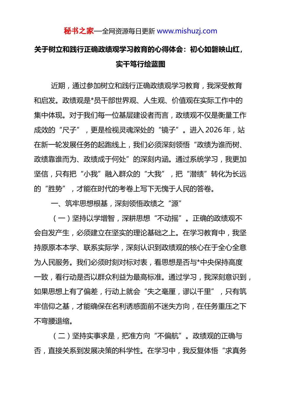 秘书之家—全网资源每日更新 www.mishuzj.com关于树立和践行正确政绩观学习教育的心得体会:初心如磐映山红,实干笃行绘蓝图近期,通过参加树立和践行正确政绩观学习教育,我深受教育和启发。政绩观是*员干部世界观、人生观、价值观在实际工作中的集中体现。对于我们每一位基层建设者而言,政绩观不仅是衡量工作成效的“尺子”,更是检视灵魂深处的“镜子”。进入 2026 年,站在新一轮发展任务的起跑线上,我们必须深刻领悟“政绩为谁而树、政绩靠谁而为、政绩成于何处”的深刻内涵。通过系统学习,我更加坚信,只有把“小我”融入群众的“大我”,把“潜绩”转化为长远的“胜势”,才能在时代的考卷上写下无愧于人民的答卷。一、筑牢思想根基,深刻领悟政绩之“源”(一)坚持以学增智,深耕思想“不动摇”。正确的政绩观不会自发产生,必须建立在坚实的理论基础之上。在学习教育中,我坚持原原本本学、联系实际学,深刻认识到政绩观的核心在于全心全意为人民服务。我们必须时刻对标对表,看思想是否与*中央保持高度一致,看行动是否以群众利益为最高标准。通过学习,我深刻意识到,如果思想上有了偏差,行动上就会“失之毫厘,谬以千里”,只有筑牢信仰之基,才能确保在名利诱惑面前不迷失方向,在任务重压之下不弯腰退缩。(二)坚持实事求是,把准方向“不偏航”。政绩观的正确与否,直接关系到发展决策的科学性。在学习中,我反复体悟“求真务秘书之家—全网资源每日更新 www.mishuzj.com实”的深刻含义,要求自己在调研中听真话、察实情,不搞“花架子”,不做“表面文章”。尤其是在制定年度工作计划时,必须立足本地资源禀赋和发展现状,坚决杜绝超越发展阶段、盲目举债建设的短视行为。只有坚持一切从实际出发,把上级精神与本地实际精准对接,才能确保每一项决策都经得起历史检验,每一笔投入都能产生长效福祉。二、坚持人民至上,精准找寻政绩之“标”(一)深入群众一线,找准民生“需求点”。群众的呼声就是第一信号。在践行正确政绩观的过程中,我体会到必须把办公桌搬到群众家门口,通过“板凳会”、“屋场会”等形式,面对面倾听群众关于教育、医疗、环境等方面的急难愁盼。今年以来,我们累计走访群众 xx 人次,收集并解决基层微小诉求 xx 件。这些看似琐碎的小事,却是关乎千家万户的头等大事。我们不能只盯着那些“显山露水”的大项目,更要关注那些惠及民生的“毛细血管”,真正把实事办到群众心坎上。(二)关注长远利益,做好发展“铺垫活”。政绩不仅看当下,更要看长远。学习教育让我明白,既要追求看得见、摸得着的“显绩”,更要甘于做打基础、利长远的“潜绩”。在环境整治、人才培养、产业孵化等领域,往往投入大、周期长、见效慢,但这正是推动高质量发展的“压舱石”。我们必须发扬“滴水穿石”的精神,不计较个人名利得失,愿意为后人“栽树”,敢于为未来“修路”。只有秘书之家—全网资源每日更新 www.mishuzj.com保持战略定力和耐心,才能在持续发力中积小胜为大胜,实现区域经济社会的健康可持续发展。三、强化责任担当,全面锤炼政绩之“效”(一)敢于攻坚克难,啃下改革“硬骨头”。政绩是干出来的,不是喊出来的。在面对历史遗留问题和复杂利益矛盾时,我们要拿出“明知山有虎,偏向虎山行”的胆识,不推诿、不扯皮。在近期推进的 xx 项目拆迁和 xx 产业转型工作中,我们坚持一线工作法,*员干部带头攻坚,通过透明化流程和人性化补偿,成功化解了积累多年的矛盾。实践证明,真正的政绩产生于解决问题的过程中,产生于化解矛盾的实效中,只有在困难面前敢于亮剑,才能赢得群众的信任和支持。(二)完善考评机制,用好督查“指挥棒”。树立正确政绩观,需要制度的刚性约束。我们应进一步优化绩效考核指标,加大民生改善、生态保护、社会治理等权重的比例,彻底告别单纯以“增长率”论英雄的时代。通过推行“台账式管理”和“销号式督办”,确保每一项重点任务都有迹可循、有责可考。同时,要建立健全容错纠错机制,为那些一心为民、敢于担当的干部撑腰打气,营造想干事、能干事、干成事的良好政治生态,让实干者有位,让平庸者...