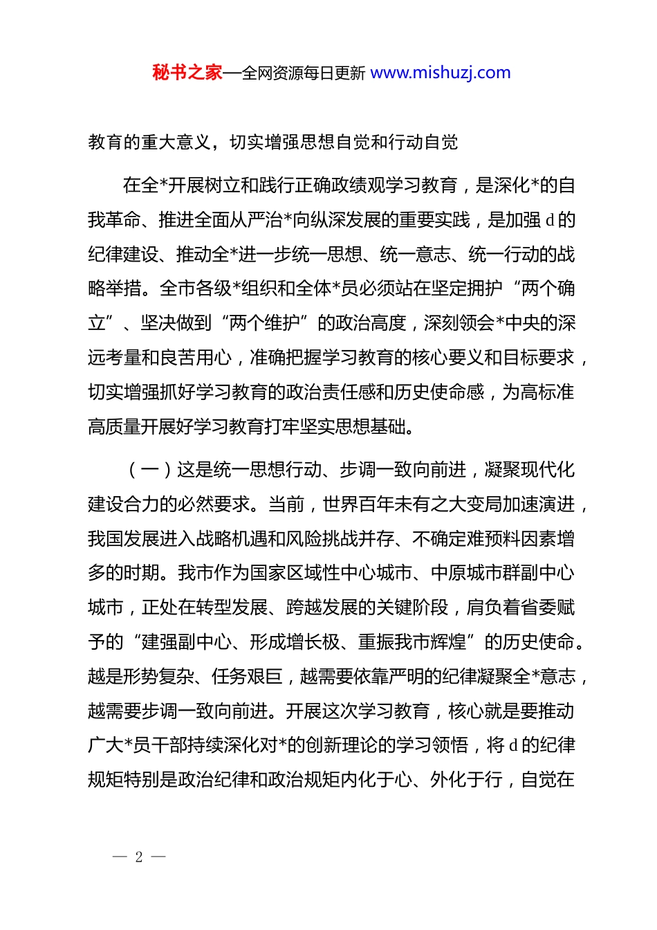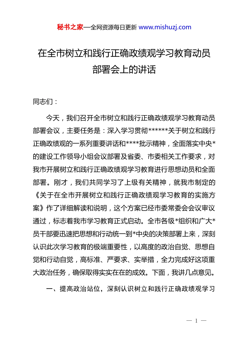 秘书之家—全网资源每日更新 www.mishuzj.com在全市树立和践行正确政绩观学习教育动员部署会上的讲话同志们:今天,我们召开全市树立和践行正确政绩观学习教育动员部署会议,主要任务是:深入学习贯彻******关于树立和践行正确政绩观的一系列重要讲话和****批示精神,全面落实中央*的建设工作领导小组会议部署及省委、市委相关工作要求,对我市开展树立和践行正确政绩观学习教育进行思想动员和全面部署。刚才,我们共同学习了上级有关精神,就我市制定的《关于在全市开展树立和践行正确政绩观学习教育的实施方案》作了详细解读和说明,这个方案已经市委常委会会议审议通过,标志着我市学习教育正式启动。全市各级*组织和广大*员干部要迅速把思想和行动统一到*中央的决策部署上来,深刻认识此次学习教育的极端重要性,以高度的政治自觉、思想自觉和行动自觉,高标准、严要求、实举措,全力完成好这项重大政治任务,确保取得实实在在的成效。下面,我讲几点意见。一、提高政治站位,深刻认识树立和践行正确政绩观学习— 1 —秘书之家—全网资源每日更新 www.mishuzj.com教育的重大意义,切实增强思想自觉和行动自觉在全*开展树立和践行正确政绩观学习教育,是深化*的自我革命、推进全面从严治*向纵深发展的重要实践,是加强 d 的纪律建设、推动全*进一步统一思想、统一意志、统一行动的战略举措。全市各级*组织和全体*员必须站在坚定拥护“两个确立”、坚决做到“两个维护”的政治高度,深刻领会*中央的深远考量和良苦用心,准确把握学习教育的核心要义和目标要求,切实增强抓好学习教育的政治责任感和历史使命感,为高标准高质量开展好学习教育打牢坚实思想基础。(一)这是统一思想行动、步调一致向前进,凝聚现代化建设合力的必然要求。当前,世界百年未有之大变局加速演进,我国发展进入战略机遇和风险挑战并存、不确定难预料因素增多的时期。我市作为国家区域性中心城市、中原城市群副中心城市,正处在转型发展、跨越发展的关键阶段,肩负着省委赋予的“建强副中心、形成增长极、重振我市辉煌”的历史使命。越是形势复杂、任务艰巨,越需要依靠严明的纪律凝聚全*意志,越需要步调一致向前进。开展这次学习教育,核心就是要推动广大*员干部持续深化对*的创新理论的学习领悟,将 d 的纪律规矩特别是政治纪律和政治规矩内化于心、外化于行,自觉在— 2 —秘书之家—全网资源每日更新 www.mishuzj.com思想上政治上行动上同以***同志为核心的*中央保持高度一致。要通过强化纪律约束,加强自我锤炼,提升免疫能力,确保全市上下心往一处想、劲往一处使,将*中央的决策部署和省委的工作要求不折不扣地落实到我市发展的各领域、全过程,凝聚起推进中国式现代化我市实践的强大合力。我们必须清醒认识到,严明的纪律是我们*不断从胜利走向胜利的重要法宝。我市要完成历史赋予的重任,必须在全市锻造一支纪律严明、作风过硬、执行有力的干部队伍。这次学习教育,正是对全市*员干部*性、纪律、作风的一次全面“体检”和淬炼,是确保我市事业发展沿着正确方向前进的根本保证。(二)这是锤炼坚强*性、锻造过硬队伍,夯实高质量发展根基的关键举措。政绩观是*员干部世界观、人生观、价值观在履职尽责中的集中体现,是干事创业的“总开关”。政绩观正确与否,不仅直接关系到*和人民事业的兴衰成败,也关系到干部个人的健康成长。当前,我市正全力推进产业发展、城市提质、乡村振兴、文旅融合、改革开放、民生改善等重点工作,项目建设如火如荼,改革发展稳定任务艰巨繁重。越是在攻坚克难的关键时期,越要树立和践行正确的政绩观。我们要通过这次学习教育,引导全市*员干部特别是领导干部,深刻回答好— 3 —秘书之家—全网资源每日更新 www.mishuzj.com“为谁创造业绩、创造什么业绩、怎样创造业绩”这一根本问题,牢固树立“功成不必在我、功成必定有我”的境界和担当,坚决反对急功近利、投机取巧,坚决防止搞劳民伤财的“形象工程”、“政绩工程”,多做打基础、利长远、惠民生、得民心的实事好事。要把心思和精力真正用到研究问题、破解难题、推动发展、服务群众上,努力创...