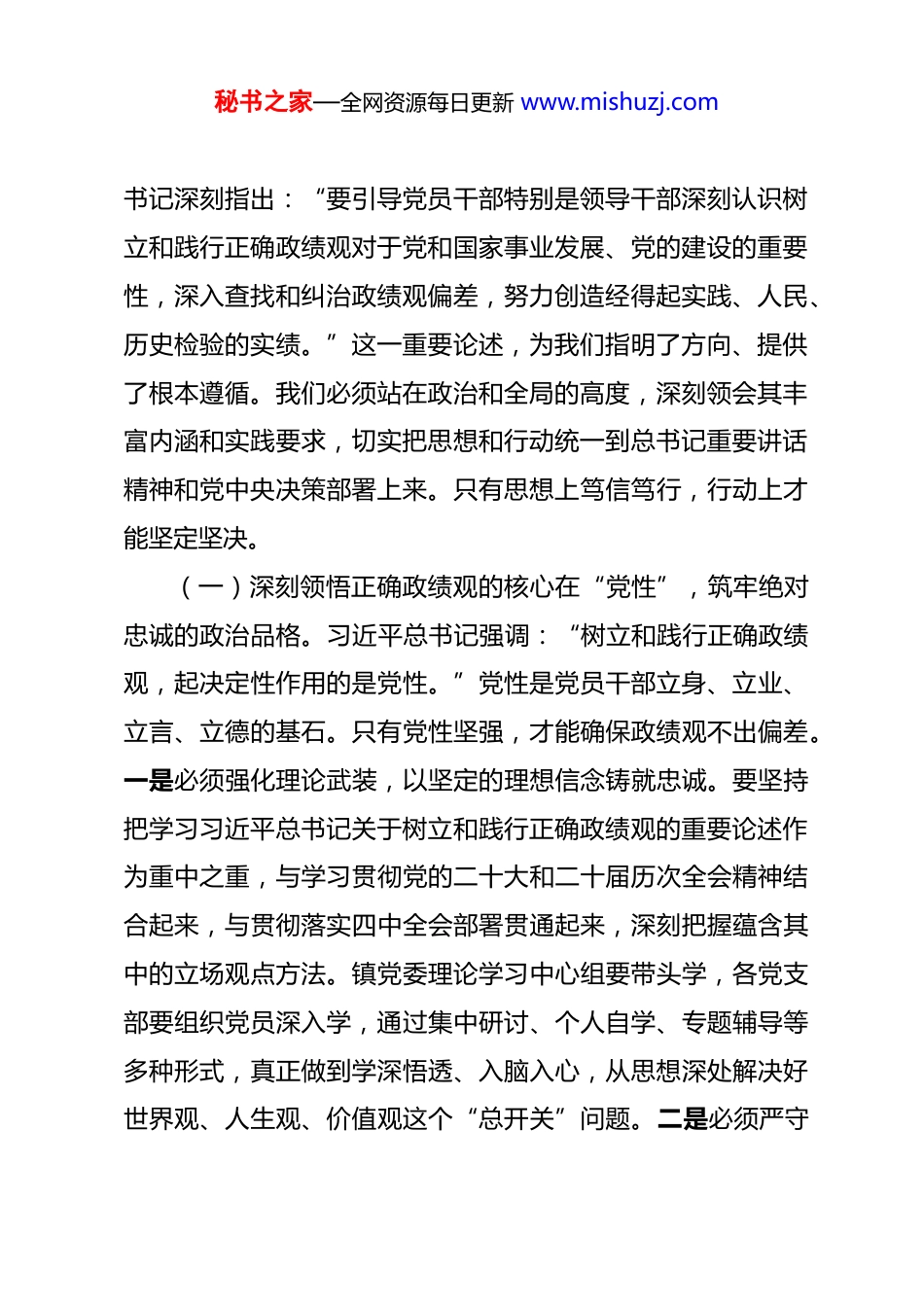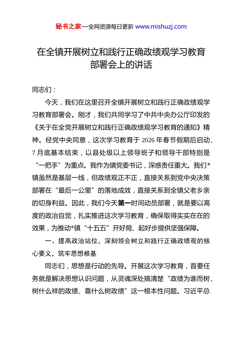 秘书之家—全网资源每日更新 www.mishuzj.com在全镇开展树立和践行正确政绩观学习教育部署会上的讲话 同志们:今天,我们在这里召开全镇开展树立和践行正确政绩观学习教育部署会。刚才,我们共同学习了中共中央办公厅印发的《关于在全党开展树立和践行正确政绩观学习教育的通知》精神。经党中央同意,这次学习教育于 2026 年春节假期后启动、7 月底基本结束,以县处级以上领导班子和领导干部特别是“一把手”为重点。我作为镇党委书记,深感责任重大。我们*镇虽然是基层一线,但政绩观正不正,直接关系到党中央决策部署在“最后一公里”的落地成效,直接关系到全镇父老乡亲的切身利益。因此,我们今天第一时间动员部署,就是要以高度的政治自觉,扎实推进这次学习教育,确保取得实实在在的效果,为推动*镇“十五五”开好局、起好步提供坚强保障。一、提高政治站位,深刻领会树立和践行正确政绩观的核心要义,筑牢思想根基同志们,思想是行动的先导。开展这次学习教育,首要任务就是解决思想认识问题,从灵魂深处搞清楚“政绩为谁而树、树什么样的政绩、靠什么树政绩”这一根本性问题。习近平总秘书之家—全网资源每日更新 www.mishuzj.com书记深刻指出:“要引导党员干部特别是领导干部深刻认识树立和践行正确政绩观对于党和国家事业发展、党的建设的重要性,深入查找和纠治政绩观偏差,努力创造经得起实践、人民、历史检验的实绩。”这一重要论述,为我们指明了方向、提供了根本遵循。我们必须站在政治和全局的高度,深刻领会其丰富内涵和实践要求,切实把思想和行动统一到总书记重要讲话精神和党中央决策部署上来。只有思想上笃信笃行,行动上才能坚定坚决。(一)深刻领悟正确政绩观的核心在“党性”,筑牢绝对忠诚的政治品格。习近平总书记强调:“树立和践行正确政绩观,起决定性作用的是党性。”党性是党员干部立身、立业、立言、立德的基石。只有党性坚强,才能确保政绩观不出偏差。一是必须强化理论武装,以坚定的理想信念铸就忠诚。要坚持把学习习近平总书记关于树立和践行正确政绩观的重要论述作为重中之重,与学习贯彻党的二十大和二十届历次全会精神结合起来,与贯彻落实四中全会部署贯通起来,深刻把握蕴含其中的立场观点方法。镇党委理论学习中心组要带头学,各党支部要组织党员深入学,通过集中研讨、个人自学、专题辅导等多种形式,真正做到学深悟透、入脑入心,从思想深处解决好世界观、人生观、价值观这个“总开关”问题。二是必须严守秘书之家—全网资源每日更新 www.mishuzj.com政治纪律,以鲜明的政治态度践行忠诚。要始终把讲政治摆在首位,时刻关注党中央在关心什么、强调什么,深刻领会什么是党和国家最重要的利益、什么是最需要坚定维护的立场。在谋划工作、推进落实时,首先要对标对表党中央的决策部署,看看有没有偏离方向,有没有打折扣、搞变通。要坚决反对本位主义、地方保护主义,确保党中央政令畅通、令行禁止。三是必须加强党性锤炼,以严格的党内生活淬炼忠诚。要认真执行“三会一课”、民主生活会、组织生活会、谈心谈话等制度,用好批评和自我批评这个锐利武器。领导干部要以普通党员身份参加组织生活,主动检视自身在政绩观方面存在的偏差,深刻剖析问题根源。要把党性分析作为民主生活会的重要内容,既查摆工作上的问题,更查找党性上的不足,通过严格的党内政治生活锻炼,不断增强党性修养,永葆共产党人的政治本色。(二)深刻领悟正确政绩观的根本在“为民”,厚植念兹在兹的赤子情怀。习近平总书记指出:“中国共产党把为民办事、为民造福作为最重要的政绩。”我们干工作、创政绩,归根到底是为了让人民群众过上更好的日子。一是必须站稳人民立场,始终把群众满意作为第一标准。想问题、作决策、办事情,都要坚持从群众中来、到群众中去,把群众呼声作为第一信号,把群众需求作为第一选择,把群众满意作为第一标准。秘书之家—全网资源每日更新 www.mishuzj.com要坚持开门搞教育,查摆问题听取群众意见,整改整治接受群众监督,检验成效让群众评判,真正把群众的“需求清单”转化为我们的“履职清单”。二是必须办好民生实事,...