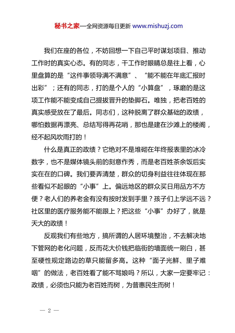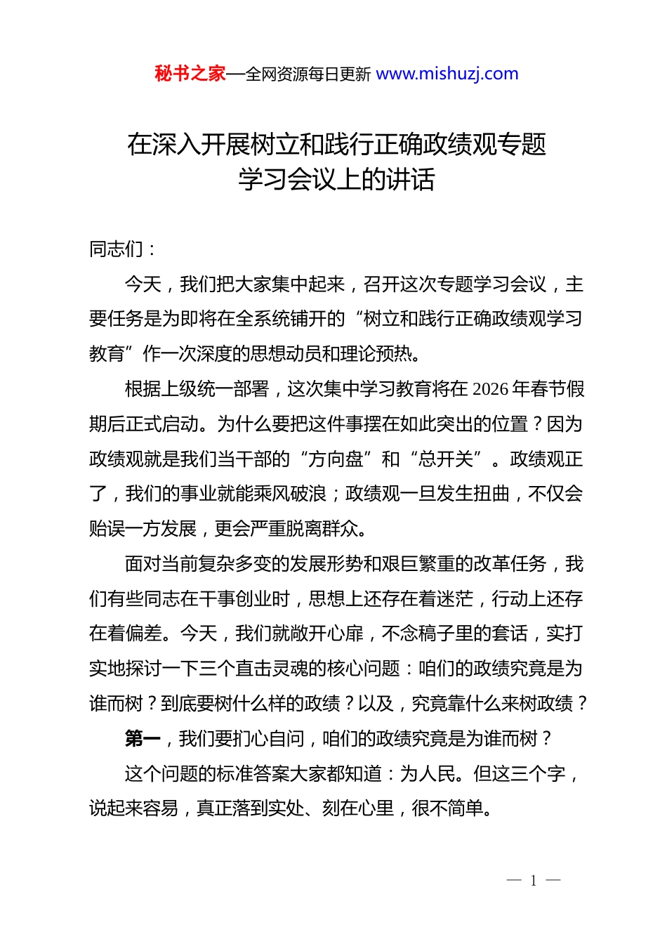 秘书之家—全网资源每日更新 www.mishuzj.com在深入开展树立和践行正确政绩观专题学习会议上的讲话同志们:今天,我们把大家集中起来,召开这次专题学习会议,主要任务是为即将在全系统铺开的“树立和践行正确政绩观学习教育”作一次深度的思想动员和理论预热。根据上级统一部署,这次集中学习教育将在 2026 年春节假期后正式启动。为什么要把这件事摆在如此突出的位置?因为政绩观就是我们当干部的“方向盘”和“总开关”。政绩观正了,我们的事业就能乘风破浪;政绩观一旦发生扭曲,不仅会贻误一方发展,更会严重脱离群众。面对当前复杂多变的发展形势和艰巨繁重的改革任务,我们有些同志在干事创业时,思想上还存在着迷茫,行动上还存在着偏差。今天,我们就敞开心扉,不念稿子里的套话,实打实地探讨一下三个直击灵魂的核心问题:咱们的政绩究竟是为谁而树?到底要树什么样的政绩?以及,究竟靠什么来树政绩?第一,我们要扪心自问,咱们的政绩究竟是为谁而树?这个问题的标准答案大家都知道:为人民。但这三个字,说起来容易,真正落到实处、刻在心里,很不简单。— 1 —秘书之家—全网资源每日更新 www.mishuzj.com我们在座的各位,不妨回想一下自己平时谋划项目、推动工作时的真实心态。有的同志,干工作时眼睛总是往上看,心里盘算的是“这件事领导满不满意”、“能不能在年底汇报时出彩”;还有的同志,打的是个人的“小算盘”,琢磨的是这项工作能不能变成自己提拔晋升的垫脚石。唯独,把老百姓的真实感受放在了最后。同志们,这种脱离了群众基础的政绩,哪怕数据再漂亮、总结写得再花哨,那也是建在沙滩上的楼阁,经不起风吹雨打的!什么是真正的政绩?它绝对不是堆砌在年终报表里的冰冷数字,也不是媒体镜头前的刻意作秀,而是老百姓茶余饭后实实在在的口碑。我们要弄清楚,群众的切身利益往往体现在那些看似不起眼的“小事”上。偏远地区的群众买日用品方不方便?老人们的养老金有没有按时发到手里?孩子们上学远不远?社区里的医疗服务能不能跟上?把这些“小事”办好了,就是天大的政绩!反观我们有些地方,搞所谓的人居环境整治,不去解决地下管网的老化问题,反而花大价钱把临街的墙面统一刷白,甚至硬性规定路边的草只能留多高。这种“面子光鲜、里子难咽”的做法,老百姓看了能不骂娘吗?所以,大家一定要牢记:政绩,必须也只能为老百姓而树,为普惠民生而树!— 2 —秘书之家—全网资源每日更新 www.mishuzj.com第二,我们要理清思路,到底要树什么样的政绩?一提到政绩,很多同志脑海里立马浮现出:修了多少条大马路、盖了多少栋摩天大楼、引进了多少个百亿级的大项目。不可否认,这些看得见、摸得着的“显绩”很重要,是我们推动经济发展的硬支撑。但是,同志们,社会发展是一个复杂的系统工程,除了“显绩”,我们更需要那些深藏不露、关乎长远的“潜绩”。这就要提到一个非常重要的境界——“功成不必在我,功成必定有我”。我发现,个别同志对这句话有严重的误解,把它当成了自己“躺平”、不作为的挡箭牌。这是极其荒谬的!“功成不必在我”,是一种不贪图一时之名、不计较个人得失的宽广胸怀;“功成必定有我”,则是强调在你当班的这一任上,必须担当作为,为长远发展打下坚实的桩基。比如,生态环境的修复、社会治理机制的完善、高层次人才的引进储备,这些工作可能你干了三五年,报表上看不出多大的经济效益,甚至还要投入大量的财政资金。但是,它能为子孙后代留下绿水青山,能为未来的产业爆发积蓄力量。我们有些干部患有严重的“短视焦虑”,怕在自己的任期内出不了风头,怕换届之后“人走茶凉”,于是盲目举债、寅吃卯粮,搞那些大干快上的政绩工程。这种行为,不仅是对历史的不负— 3 —秘书之家—全网资源每日更新 www.mishuzj.com责任,更是对人民的犯罪!我们树政绩,既要干当前能见效的实事,更要敢于干为后人作铺垫的好事,一茬接着一茬干,这才是真正的历史担当。第三,我们要脚踏实地,究竟靠什么来树政绩?思路清了,关键在落实。政绩绝对不是在办公室里拍脑袋拍出来的,也不是在会议室里吹出来的,它是靠实打实干出来的...