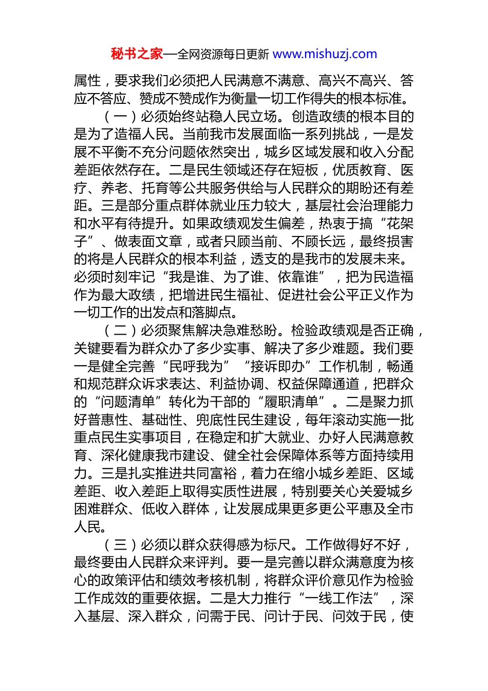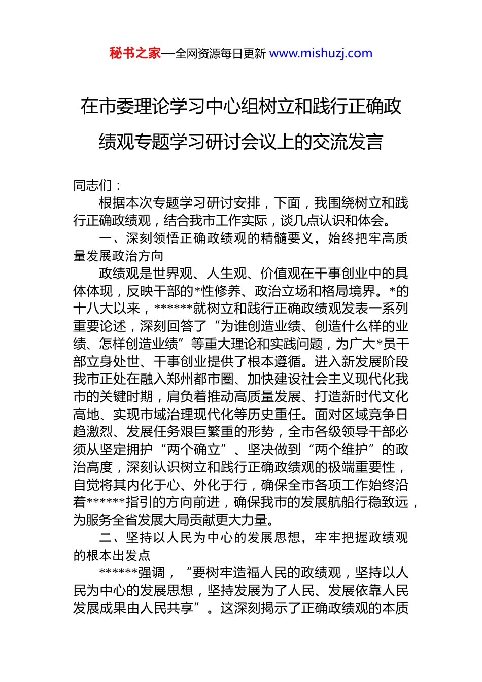 秘书之家—全网资源每日更新 www.mishuzj.com在市委理论学习中心组树立和践行正确政绩观专题学习研讨会议上的交流发言同志们:根据本次专题学习研讨安排,下面,我围绕树立和践行正确政绩观,结合我市工作实际,谈几点认识和体会。一、深刻领悟正确政绩观的精髓要义,始终把牢高质量发展政治方向政绩观是世界观、人生观、价值观在干事创业中的具体体现,反映干部的*性修养、政治立场和格局境界。*的十八大以来,******就树立和践行正确政绩观发表一系列重要论述,深刻回答了“为谁创造业绩、创造什么样的业绩、怎样创造业绩”等重大理论和实践问题,为广大*员干部立身处世、干事创业提供了根本遵循。进入新发展阶段我市正处在融入郑州都市圈、加快建设社会主义现代化我市的关键时期,肩负着推动高质量发展、打造新时代文化高地、实现市域治理现代化等历史重任。面对区域竞争日趋激烈、发展任务艰巨繁重的形势,全市各级领导干部必须从坚定拥护“两个确立”、坚决做到“两个维护”的政治高度,深刻认识树立和践行正确政绩观的极端重要性,自觉将其内化于心、外化于行,确保全市各项工作始终沿着******指引的方向前进,确保我市的发展航船行稳致远,为服务全省发展大局贡献更大力量。二、坚持以人民为中心的发展思想,牢牢把握政绩观的根本出发点******强调,“要树牢造福人民的政绩观,坚持以人民为中心的发展思想,坚持发展为了人民、发展依靠人民发展成果由人民共享”。这深刻揭示了正确政绩观的本质秘书之家—全网资源每日更新 www.mishuzj.com属性,要求我们必须把人民满意不满意、高兴不高兴、答应不答应、赞成不赞成作为衡量一切工作得失的根本标准。(一)必须始终站稳人民立场。创造政绩的根本目的是为了造福人民。当前我市发展面临一系列挑战,一是发展不平衡不充分问题依然突出,城乡区域发展和收入分配差距依然存在。二是民生领域还存在短板,优质教育、医疗、养老、托育等公共服务供给与人民群众的期盼还有差距。三是部分重点群体就业压力较大,基层社会治理能力和水平有待提升。如果政绩观发生偏差,热衷于搞“花架子”、做表面文章,或者只顾当前、不顾长远,最终损害的将是人民群众的根本利益,透支的是我市的发展未来。必须时刻牢记“我是谁、为了谁、依靠谁”,把为民造福作为最大政绩,把增进民生福祉、促进社会公平正义作为一切工作的出发点和落脚点。(二)必须聚焦解决急难愁盼。检验政绩观是否正确,关键要看为群众办了多少实事、解决了多少难题。我们要一是健全完善“民呼我为”“接诉即办”工作机制,畅通和规范群众诉求表达、利益协调、权益保障通道,把群众的“问题清单”转化为干部的“履职清单”。二是聚力抓好普惠性、基础性、兜底性民生建设,每年滚动实施一批重点民生实事项目,在稳定和扩大就业、办好人民满意教育、深化健康我市建设、健全社会保障体系等方面持续用力。三是扎实推进共同富裕,着力在缩小城乡差距、区域差距、收入差距上取得实质性进展,特别要关心关爱城乡困难群众、低收入群体,让发展成果更多更公平惠及全市人民。(三)必须以群众获得感为标尺。工作做得好不好,最终要由人民群众来评判。要一是完善以群众满意度为核心的政策评估和绩效考核机制,将群众评价意见作为检验工作成效的重要依据。二是大力推行“一线工作法”,深入基层、深入群众,问需于民、问计于民、问效于民,使秘书之家—全网资源每日更新 www.mishuzj.com各项决策部署和工作举措更接地气、更合民意。三是在城市建设、乡村振兴、环境治理、文化发展等各项工作中,都要坚持“开门决策”,充分听取群众意见建议,努力使各项工作更好地体现人民意愿、满足人民需求,真正创造出经得起群众检验的实绩。三、坚持显功与潜功相统一,切实夯实我市长远发展的坚实根基******要求,“既要做让老百姓看得见、摸得着、得实惠的实事,也要做为后人作铺垫、打基础、利长远的好事”。这科学阐明了“显绩”与“潜绩”的辩证关系。推动我市高质量发展,既要拿出“显功”的魄力,干出立竿见影的成效,提振信心、鼓舞士气;更要有“潜功”的定力,甘于做打基础、利长远的工作,为...