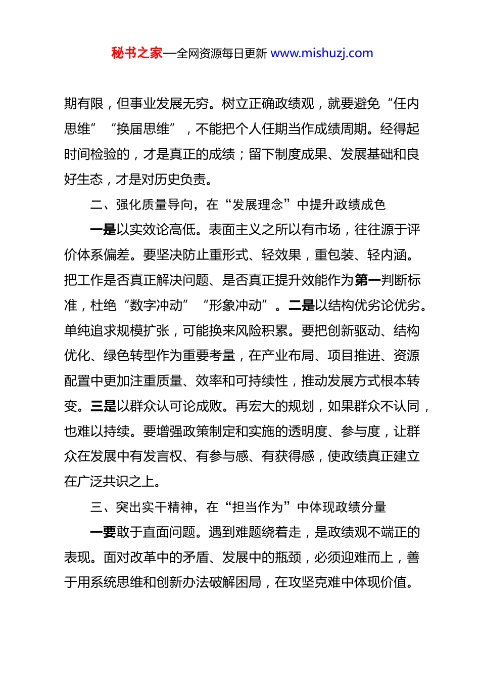 秘书之家—全网资源每日更新 www.mishuzj.com在树立和践行正确政绩观专题研讨会上的发言 同志们:政绩观问题,看似是工作方法问题,实则是立场问题、价值问题、作风问题。政绩为谁而树、为谁而干,直接决定发展方向;政绩怎么衡量、如何取舍,直接影响事业质量;政绩如何实现、如何检验,则关乎干部作风和政治生态。当前,推动高质量发展任务艰巨、改革攻坚压力叠加,越是关键时期,越要校准政绩坐标,守住价值底线,走稳发展道路。围绕专题学习,我谈四点认识。一、把准价值坐标,在“初心使命”中校正政绩方向一要在人民立场上定方向。政绩如果脱离群众,就会偏离根本。群众获得了什么、生活改善了多少、困难解决了几分,才是衡量工作的关键尺度。发展不是为了“数字好看”,而是为了生活更好。必须把群众的急难愁盼当作工作起点,把群众评价当作最终标尺。二要在大局意识中明定位。政绩不能只算“小账”,更要算“大账”。有的工作看似不显山露水,却关系长远基础;有的项目短期见效快,却可能留下隐患。必须把局部利益放到全局中考量,把阶段目标放到长远规划中审视,做到既顾当前、又利长远。三要在历史维度上看得失。干部任秘书之家—全网资源每日更新 www.mishuzj.com期有限,但事业发展无穷。树立正确政绩观,就要避免“任内思维”“换届思维”,不能把个人任期当作成绩周期。经得起时间检验的,才是真正的成绩;留下制度成果、发展基础和良好生态,才是对历史负责。二、强化质量导向,在“发展理念”中提升政绩成色一是以实效论高低。表面主义之所以有市场,往往源于评价体系偏差。要坚决防止重形式、轻效果,重包装、轻内涵。把工作是否真正解决问题、是否真正提升效能作为第一判断标准,杜绝“数字冲动”“形象冲动”。二是以结构优劣论优劣。单纯追求规模扩张,可能换来风险积累。要把创新驱动、结构优化、绿色转型作为重要考量,在产业布局、项目推进、资源配置中更加注重质量、效率和可持续性,推动发展方式根本转变。三是以群众认可论成败。再宏大的规划,如果群众不认同,也难以持续。要增强政策制定和实施的透明度、参与度,让群众在发展中有发言权、有参与感、有获得感,使政绩真正建立在广泛共识之上。三、突出实干精神,在“担当作为”中体现政绩分量一要敢于直面问题。遇到难题绕着走,是政绩观不端正的表现。面对改革中的矛盾、发展中的瓶颈,必须迎难而上,善于用系统思维和创新办法破解困局,在攻坚克难中体现价值。秘书之家—全网资源每日更新 www.mishuzj.com二要坚持一抓到底。有的工作“开头热闹、后劲不足”,根源在于缺乏恒心。真正的政绩,是在长期积累中形成的。要保持战略耐心,对既定目标持续用力,不因一时波动而改变方向。三要坚持以上率下。领导干部的政绩观具有示范效应。作风是否务实、决策是否理性、用人是否公正,都会影响整体氛围。必须带头深入基层调查研究,带头承担责任,带头接受监督,以自身行动带动风气转变。四、守住纪律底线,在“清正廉洁”中保障政绩纯度一要正确对待权力。权力是干事的平台,不是谋利的工具。任何以权谋私、急功近利的行为,都会侵蚀事业根基。必须始终保持对权力的敬畏,把权力运行置于制度约束和监督之下。二要正确对待名利。有的偏差,往往源于急于求成、急于求名。要淡化个人得失,强化事业责任,把“干成事”放在“出名次”之前,把“群众满意”放在“上级认可”之前。三要正确对待监督。监督不是束缚,而是保护。要主动接受组织监督、群众监督和舆论监督,在公开透明中改进工作,在问题反馈中完善机制,让政绩更加真实可靠。同志们,政绩观端正与否,既关乎个人修养,也关乎事业兴衰。我们要在思想上常常对照,在行动上时时校准,把人民立场作为根本坐标,把高质量发展作为鲜明导向,把务实作风秘书之家—全网资源每日更新 www.mishuzj.com作为行动自觉,把纪律规矩作为底线约束,真正做到干一件成一件、干一任留一任,以扎实业绩回应时代要求和群众期待。