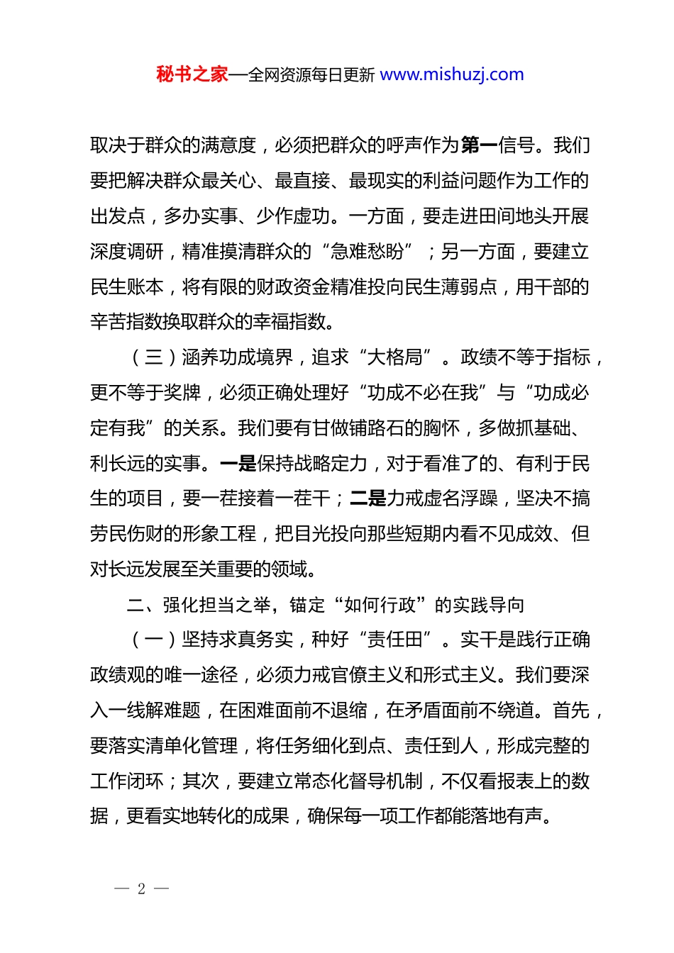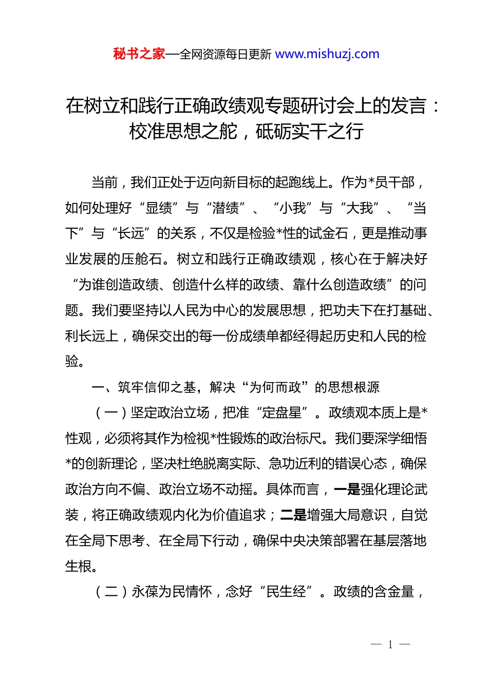 秘书之家—全网资源每日更新 www.mishuzj.com在树立和践行正确政绩观专题研讨会上的发言:校准思想之舵,砥砺实干之行当前,我们正处于迈向新目标的起跑线上。作为*员干部,如何处理好“显绩”与“潜绩”、“小我”与“大我”、“当下”与“长远”的关系,不仅是检验*性的试金石,更是推动事业发展的压舱石。树立和践行正确政绩观,核心在于解决好“为谁创造政绩、创造什么样的政绩、靠什么创造政绩”的问题。我们要坚持以人民为中心的发展思想,把功夫下在打基础、利长远上,确保交出的每一份成绩单都经得起历史和人民的检验。一、筑牢信仰之基,解决“为何而政”的思想根源(一)坚定政治立场,把准“定盘星”。政绩观本质上是*性观,必须将其作为检视*性锻炼的政治标尺。我们要深学细悟*的创新理论,坚决杜绝脱离实际、急功近利的错误心态,确保政治方向不偏、政治立场不动摇。具体而言,一是强化理论武装,将正确政绩观内化为价值追求;二是增强大局意识,自觉在全局下思考、在全局下行动,确保中央决策部署在基层落地生根。(二)永葆为民情怀,念好“民生经”。政绩的含金量,— 1 —秘书之家—全网资源每日更新 www.mishuzj.com取决于群众的满意度,必须把群众的呼声作为第一信号。我们要把解决群众最关心、最直接、最现实的利益问题作为工作的出发点,多办实事、少作虚功。一方面,要走进田间地头开展深度调研,精准摸清群众的“急难愁盼”;另一方面,要建立民生账本,将有限的财政资金精准投向民生薄弱点,用干部的辛苦指数换取群众的幸福指数。(三)涵养功成境界,追求“大格局”。政绩不等于指标,更不等于奖牌,必须正确处理好“功成不必在我”与“功成必定有我”的关系。我们要有甘做铺路石的胸怀,多做抓基础、利长远的实事。一是保持战略定力,对于看准了的、有利于民生的项目,要一茬接着一茬干;二是力戒虚名浮躁,坚决不搞劳民伤财的形象工程,把目光投向那些短期内看不见成效、但对长远发展至关重要的领域。二、强化担当之举,锚定“如何行政”的实践导向(一)坚持求真务实,种好“责任田”。实干是践行正确政绩观的唯一途径,必须力戒官僚主义和形式主义。我们要深入一线解难题,在困难面前不退缩,在矛盾面前不绕道。首先,要落实清单化管理,将任务细化到点、责任到人,形成完整的工作闭环;其次,要建立常态化督导机制,不仅看报表上的数据,更看实地转化的成果,确保每一项工作都能落地有声。— 2 —秘书之家—全网资源每日更新 www.mishuzj.com(二)勇于攻坚克难,啃下“硬骨头”。面对发展中的顽瘴痼疾,要有敢于亮剑的精神,在危机中育先机、于变局中开新局。我们要聚焦产业升级、生态治理、风险防范等关键领域,拿出闯的劲头、拼的勇气。一方面,要敢于打破利益藩篱,解决历史遗留问题;另一方面,要积极探索新模式、新路径,在提升城市精细化管理、优化营商环境等方面取得实质性突破,用实打实的突破支撑起沉甸甸的政绩。(三)严格依法依规,把牢“法治关”。政绩的创造必须在法治轨道上运行,严禁违背客观规律盲目蛮干。我们要强化法律意识,坚持法定职责必须为、法无授权不可为,确保权力在阳光下运行。一是完善重大决策程序,充分发挥专家论证和风险评估的作用;二是强化程序合规性审查,防止拍脑袋决策、拍胸脯保证、拍屁股走人的现象发生,以法治思维提升治理效能,确保政绩经得起法律审计。三、提升能力之要,磨砺“行政之能”的过硬本领(一)增强专业素养,打造“基本功”。过硬的本领是践行正确政绩观的底气,必须不断更新知识结构,提升应对复杂局面的能力。我们要主动学习经济、法律、科技、金融等前沿知识,争做行家里手。首先,要通过举办专题讲座、外派研修等方式,拓宽干部的国际视野;其次,要开展岗位练兵,让干— 3 —秘书之家—全网资源每日更新 www.mishuzj.com部在吃劲岗位上磨炼,学会用专业的方法解决专业的问题,以专业素养提升决策的科学性。(二)提升治理效能,织密“安全网”。政绩观的落实需要高效的执行力作为保障,必须加强系统谋划和综合治理。我们要构建跨部门、跨层级的协同联动机制,形成上下贯通...