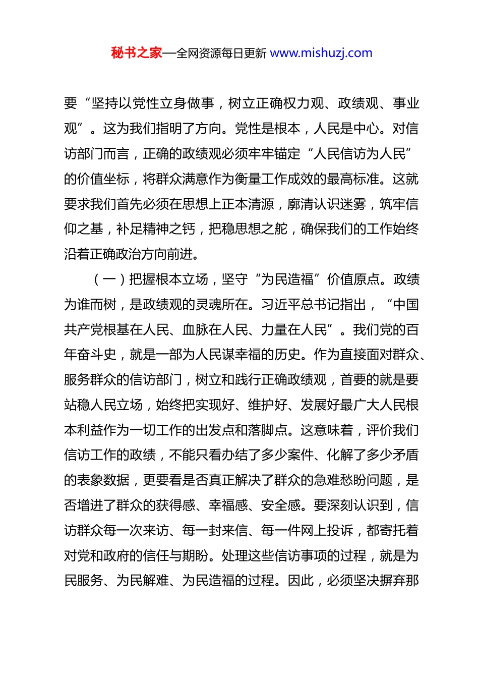 秘书之家—全网资源每日更新 www.mishuzj.com政绩观党课:以枝叶关情的初心使命,筑牢信访工作的民心根基 同志们:今天我们召开市信访局机关全体干部政绩观教育大会,旨在深入学习贯彻党的二十大及历次全会精神,特别是关于牢固树立和践行正确政绩观的重要要求,贯彻落实二十届中央纪委五次全会工作部署,引导全体干部从思想深处解决好“为谁创造业绩、创造什么样的业绩、怎样创造业绩”的重大问题。信访工作是党的群众工作的重要组成部分,是党和政府联系群众的桥梁、倾听群众呼声的窗口、体察群众疾苦的重要途径。我们的政绩观,直接关系到党和政府在人民群众心中的形象,关系到社会和谐稳定大局。全体信访干部必须深刻认识到,树立和践行正确政绩观,是履行好新时代信访工作职责使命的政治保证,是推动信访工作高质量发展、更好服务人民群众和全市发展大局的思想根基。下面,我围绕这一主题,谈几点意见。一、深刻领悟核心要义,夯实正确政绩观的思想根基正确政绩观并非无源之水、无本之木,它源于坚定的理想信念和深厚的为民情怀。深刻领悟其核心要义,是我们一切行动的出发点。习近平总书记在二十届中央纪委五次全会上强调,秘书之家—全网资源每日更新 www.mishuzj.com要“坚持以党性立身做事,树立正确权力观、政绩观、事业观”。这为我们指明了方向。党性是根本,人民是中心。对信访部门而言,正确的政绩观必须牢牢锚定“人民信访为人民”的价值坐标,将群众满意作为衡量工作成效的最高标准。这就要求我们首先必须在思想上正本清源,廓清认识迷雾,筑牢信仰之基,补足精神之钙,把稳思想之舵,确保我们的工作始终沿着正确政治方向前进。(一)把握根本立场,坚守“为民造福”价值原点。政绩为谁而树,是政绩观的灵魂所在。习近平总书记指出,“中国共产党根基在人民、血脉在人民、力量在人民”。我们党的百年奋斗史,就是一部为人民谋幸福的历史。作为直接面对群众、服务群众的信访部门,树立和践行正确政绩观,首要的就是要站稳人民立场,始终把实现好、维护好、发展好最广大人民根本利益作为一切工作的出发点和落脚点。这意味着,评价我们信访工作的政绩,不能只看办结了多少案件、化解了多少矛盾的表象数据,更要看是否真正解决了群众的急难愁盼问题,是否增进了群众的获得感、幸福感、安全感。要深刻认识到,信访群众每一次来访、每一封来信、每一件网上投诉,都寄托着对党和政府的信任与期盼。处理这些信访事项的过程,就是为民服务、为民解难、为民造福的过程。因此,必须坚决摒弃那秘书之家—全网资源每日更新 www.mishuzj.com种脱离群众、漠视疾苦的官僚主义,反对那种只求轰动效应、不顾实际效果的“形象工程”,杜绝那种片面追求“息事宁人”而不解决根本问题的错误做法。要始终心怀“国之大者”,将信访工作置于全市经济社会发展大局中考量,更要聚焦于“民之关切”,将信访工作做到群众心坎上。唯有如此,我们所创造的政绩才能经得起人民检验、实践检验和历史检验,才是真正有温度、有深度、有力度的政绩。(二)厘清发展思想,贯彻“高质量发展”内在要求。创造什么样的政绩,是政绩观的核心内容。新时代新征程,我国经济已由高速增长阶段转向高质量发展阶段。这一发展思想的转变,必然要求政绩观的同步升级。对于信访工作而言,树立和践行正确政绩观,必须完整、准确、全面贯彻新发展理念,将推动信访工作高质量发展作为核心追求。高质量发展不是简单的数量增长和速度提升,而是质量、结构、规模、速度、效益、安全的有机统一。具体到信访实践,就是要从过去侧重于事后应对、个案化解,向更加注重源头预防、系统治理、依法规范、综合施策转变。要着力在提升信访事项办理质效上下功夫,不仅要推动“事心双解”,更要促进“案结事了”,努力实现政治效果、法律效果和社会效果的统一。要着力在健全矛盾纠纷预防化解机制上下功夫,推动信访工作深度融入基层社秘书之家—全网资源每日更新 www.mishuzj.com会治理,变“被动受理”为“主动介入”,变“末端处置”为“前端防范”。要着力在提升信访工作法治化、信息化、科学化水平上下功夫,运用法治思维和法治...