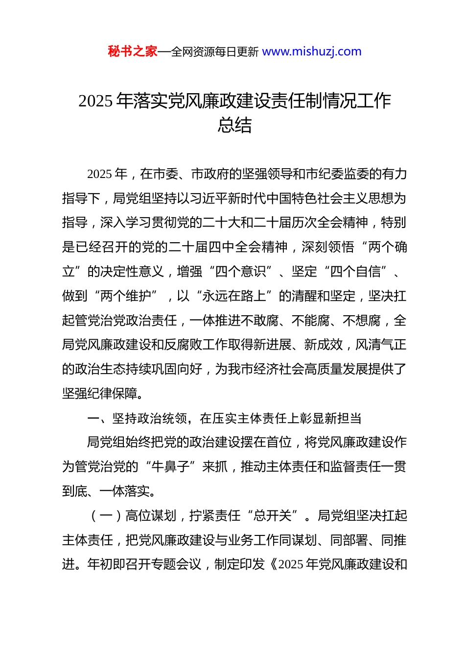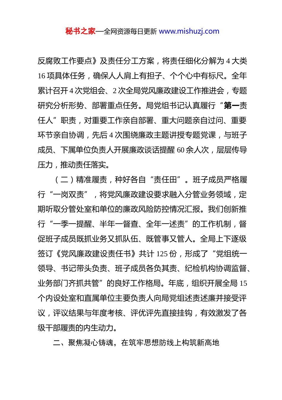 秘书之家—全网资源每日更新 www.mishuzj.com2025 年落实党风廉政建设责任制情况工作总结 2025 年,在市委、市政府的坚强领导和市纪委监委的有力指导下,局党组坚持以习近平新时代中国特色社会主义思想为指导,深入学习贯彻党的二十大和二十届历次全会精神,特别是已经召开的党的二十届四中全会精神,深刻领悟“两个确立”的决定性意义,增强“四个意识”、坚定“四个自信”、做到“两个维护”,以“永远在路上”的清醒和坚定,坚决扛起管党治党政治责任,一体推进不敢腐、不能腐、不想腐,全局党风廉政建设和反腐败工作取得新进展、新成效,风清气正的政治生态持续巩固向好,为我市经济社会高质量发展提供了坚强纪律保障。一、坚持政治统领,在压实主体责任上彰显新担当局党组始终把党的政治建设摆在首位,将党风廉政建设作为管党治党的“牛鼻子”来抓,推动主体责任和监督责任一贯到底、一体落实。(一)高位谋划,拧紧责任“总开关”。局党组坚决扛起主体责任,把党风廉政建设与业务工作同谋划、同部署、同推进。年初即召开专题会议,制定印发《2025 年党风廉政建设和秘书之家—全网资源每日更新 www.mishuzj.com反腐败工作要点》及责任分工方案,将责任细化分解为 4 大类16 项具体任务,确保人人肩上有担子、个个心中有标尺。全年累计召开 4 次党组会、2 次全局党风廉政建设工作推进会,专题研究分析形势、部署重点任务。局党组书记认真履行“第一责任人”职责,对重要工作亲自部署、重大问题亲自过问、重要环节亲自协调,先后 4 次围绕廉政主题讲授专题党课,与班子成员、下属单位负责人开展廉政谈话提醒 60 余人次,层层传导压力,推动责任落实。(二)精准履责,种好各自“责任田”。班子成员严格履行“一岗双责”,将党风廉政建设要求融入分管业务领域,定期听取分管处室和单位的廉政风险防控情况汇报。我们创新推行“一季一提醒、半年一督查、全年一述责”的工作机制,督促班子成员既抓业务又抓队伍、既管事又管人。全局上下逐级签订《党风廉政建设责任书》共计 125 份,形成了“党组统一领导、书记带头负责、班子成员各负其责、纪检机构协调监督、业务部门齐抓共管”的良好工作格局。年底,组织开展全局 15个内设处室和直属单位主要负责人向局党组述责述廉并接受评议,评议结果与年度考核、评优评先直接挂钩,有效激发了各级干部履责的内生动力。二、聚焦凝心铸魂,在筑牢思想防线上构筑新高地秘书之家—全网资源每日更新 www.mishuzj.com坚持思想建党和纪律强党同向发力,通过常态化、多层次的教育引导,教育广大党员干部从思想深处正本清源、固本培元,涵养“乱云飞渡仍从容”的政治定力。(一)强化理论武装,补足精神之“钙”。严格落实“第一议题”制度,全年组织党组理论学习中心组集体学习 14 次,其中围绕全面从严治党、党纪学习教育等主题进行专题研讨 6次。我们将学习贯彻新修订的《中国共产党纪律处分条例》作为全年重点,通过举办读书班、专家辅导讲座、知识竞赛等形式,组织全局超过 1500 名党员干部原原本本、逐章逐条学习,引导大家搞清楚党的纪律规矩是什么,弄明白能干什么、不能干什么,把遵规守纪刻印在心,内化为日用而不觉的言行准则。(二)深化警示教育,敲响廉洁之“钟”。坚持用“身边事”教育“身边人”,让警钟长鸣。全年组织召开警示教育大会 5 次,集中观看警示教育片,通报剖析近年来我市和我局系统内发生的违纪违法典型案例,以案说德、以案说纪、以案说法、以案说责。我们还组织关键岗位干部及家属共计 200 余人,赴市廉政教育基地接受“沉浸式”警示教育,并创新开展“家庭助廉”活动,发放廉洁家书,引导干部家属当好“廉内助”,共同筑牢家庭反腐防线,推动廉洁教育从“工作圈”向“生活圈”延伸。秘书之家—全网资源每日更新 www.mishuzj.com(三)培育廉洁文化,涵养清风之“源”。我们深挖行业特色,将廉洁文化建设与业务文化深度融合,打造具有我局特色的廉洁文化品牌。比如,我们开展了“清风润我心”廉洁文化作品征集活动,收到书画、摄影、短视频等作品 80 余件,并在办公楼内开辟“廉洁文化...