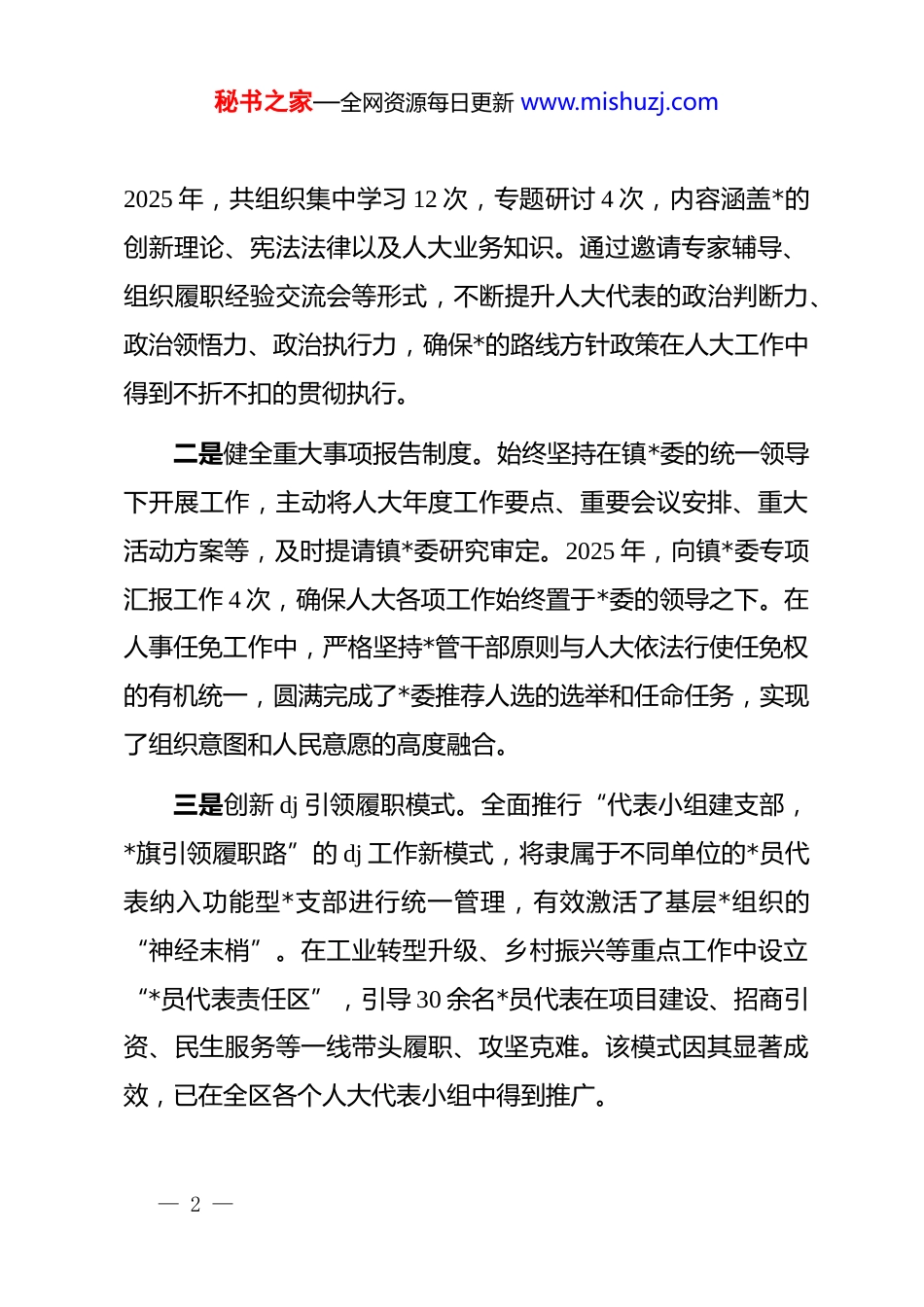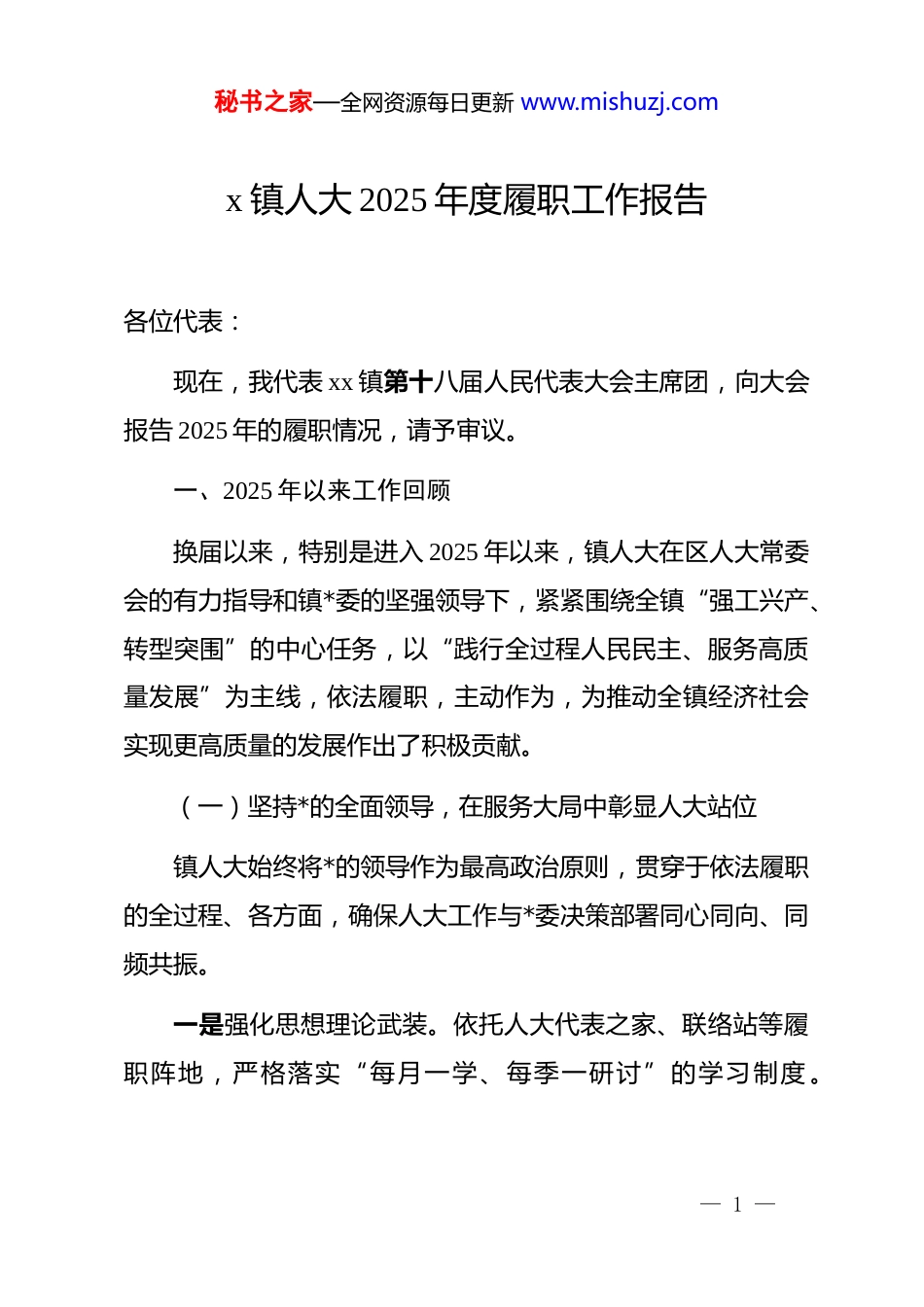 秘书之家—全网资源每日更新 www.mishuzj.comx 镇人大 2025 年度履职工作报告各位代表:现在,我代表 xx 镇第十八届人民代表大会主席团,向大会报告 2025 年的履职情况,请予审议。一、2025 年以来工作回顾换届以来,特别是进入 2025 年以来,镇人大在区人大常委会的有力指导和镇*委的坚强领导下,紧紧围绕全镇“强工兴产、转型突围”的中心任务,以“践行全过程人民民主、服务高质量发展”为主线,依法履职,主动作为,为推动全镇经济社会实现更高质量的发展作出了积极贡献。(一)坚持*的全面领导,在服务大局中彰显人大站位镇人大始终将*的领导作为最高政治原则,贯穿于依法履职的全过程、各方面,确保人大工作与*委决策部署同心同向、同频共振。一是强化思想理论武装。依托人大代表之家、联络站等履职阵地,严格落实“每月一学、每季一研讨”的学习制度 。— 1 —秘书之家—全网资源每日更新 www.mishuzj.com2025 年,共组织集中学习 12 次,专题研讨 4 次,内容涵盖*的创新理论、宪法法律以及人大业务知识。通过邀请专家辅导、组织履职经验交流会等形式,不断提升人大代表的政治判断力、政治领悟力、政治执行力,确保*的路线方针政策在人大工作中得到不折不扣的贯彻执行。二是健全重大事项报告制度。始终坚持在镇*委的统一领导下开展工作,主动将人大年度工作要点、重要会议安排、重大活动方案等,及时提请镇*委研究审定。2025 年,向镇*委专项汇报工作 4 次,确保人大各项工作始终置于*委的领导之下。在人事任免工作中,严格坚持*管干部原则与人大依法行使任免权的有机统一,圆满完成了*委推荐人选的选举和任命任务,实现了组织意图和人民意愿的高度融合。三是创新 dj 引领履职模式。全面推行“代表小组建支部,*旗引领履职路”的 dj 工作新模式,将隶属于不同单位的*员代表纳入功能型*支部进行统一管理,有效激活了基层*组织的“神经末梢”。在工业转型升级、乡村振兴等重点工作中设立“*员代表责任区”,引导 30 余名*员代表在项目建设、招商引资、民生服务等一线带头履职、攻坚克难。该模式因其显著成效,已在全区各个人大代表小组中得到推广。— 2 —秘书之家—全网资源每日更新 www.mishuzj.com(二)夯实基层民主阵地,在践行全过程人民民主中展现人大作为镇人大坚持把阵地建设作为发展全过程人民民主的重要载体,着力构建网络化、功能化、常态化的代表履职平台,让民主实践深深植根于人民群众之中。一是织密代表联系群众网络。按照“实用、高效、便民”的原则,高标准建成了 1 个镇级人大代表之家、4 个社区(片区)人大代表联络站和 6 个村级人大代表工作室。这些站点均设置了民意收集箱、议事协商区,并配备专职联络员,形成了覆盖全镇、便于参与的“15 分钟履职圈”。2025 年,各站点共接待群众来访 200 余人次,收集各类意见建议 80 余条,成为代表履职的“加油站”和群众表达诉求的“家门口平台”,年内多次接待外地人大前来考察交流。二是创新基层民主实践形式。深化“代表联络站+”融合发展模式,将人大工作触角延伸至经济社会发展的关键领域。例如,在工业园区联络站设立“营商环境监测点”,聘请 10 名企业家担任营商环境监督员,定期收集企业在生产经营中遇到的困难和问题。常态化开展“我和代表聊聊天”活动,全年组织各级人大代表深入田间地头、企业车间、群众家中超过 300 人— 3 —秘书之家—全网资源每日更新 www.mishuzj.com次,面对面倾听群众呼声,心贴心了解群众期盼,确保群众的声音能被听见、群众的诉求能得到回应。三是推动民主决策与监督。在村级重大事项决策中,积极组织人大代表全程参与“事前调研、事中协商、事后监督”环节,确保决策过程科学民主、结果符合民意。在民生实事项目推进过程中,邀请群众代表、利益相关方代表参与项目监督和进度通报会,让群众从过去的“旁观者”转变为如今的“参与者”和“监督员”,切实增强了人民群众的民主获得感和主人翁意识。(三)聚焦中心精准监督,在助推高质量发展中贡献人大力量镇人大紧扣“工业大镇向工业强镇跨越”的战略目标,坚持寓支持于...