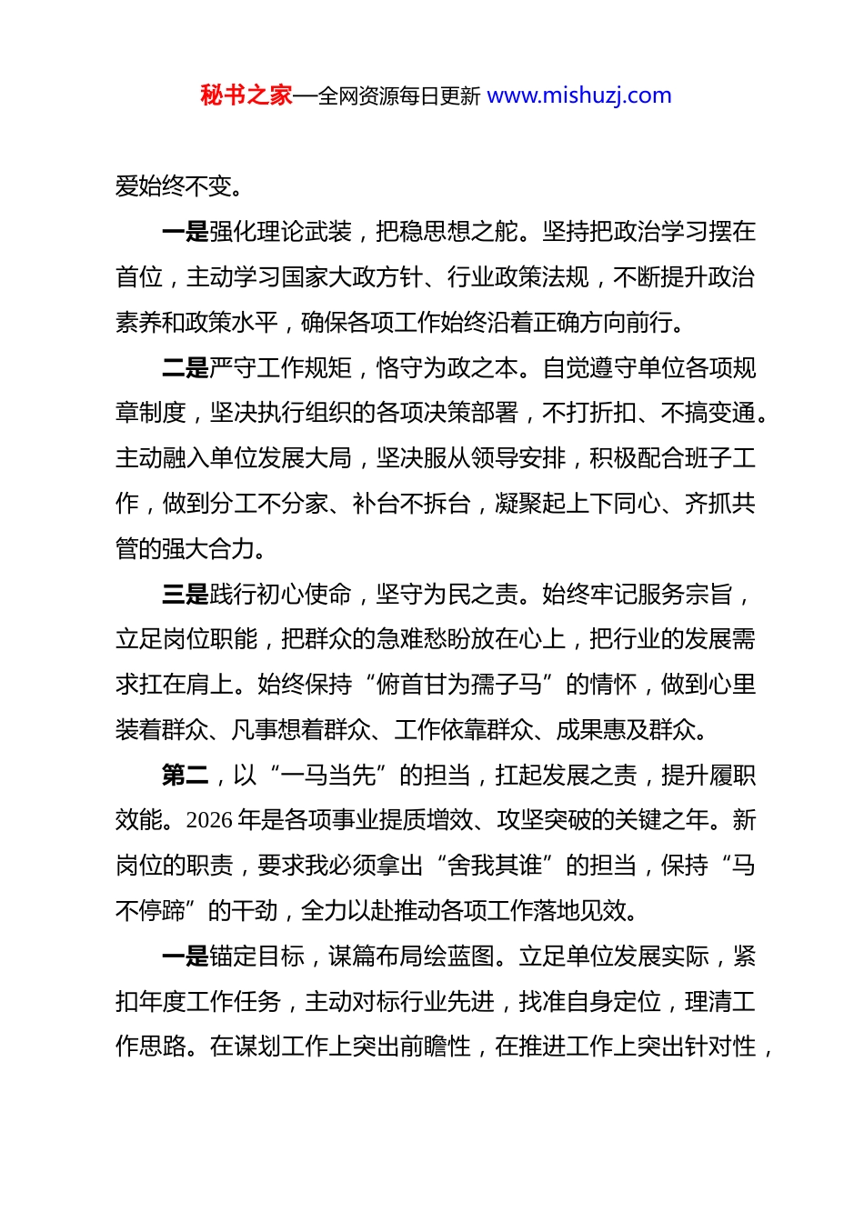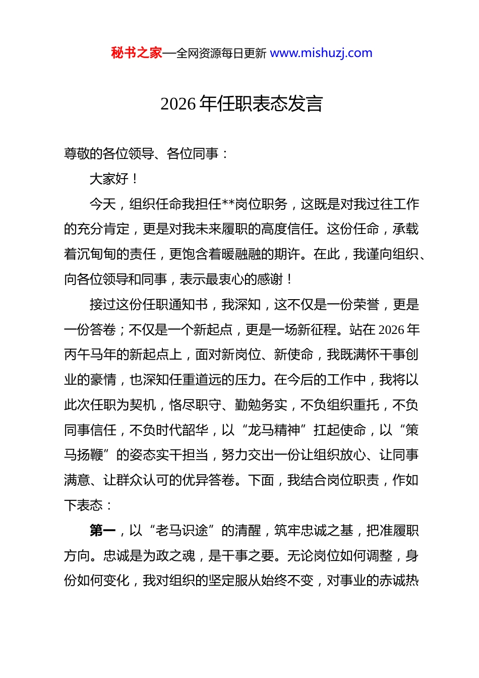 秘书之家—全网资源每日更新 www.mishuzj.com2026 年任职表态发言 尊敬的各位领导、各位同事:大家好!今天,组织任命我担任**岗位职务,这既是对我过往工作的充分肯定,更是对我未来履职的高度信任。这份任命,承载着沉甸甸的责任,更饱含着暖融融的期许。在此,我谨向组织、向各位领导和同事,表示最衷心的感谢!接过这份任职通知书,我深知,这不仅是一份荣誉,更是一份答卷;不仅是一个新起点,更是一场新征程。站在 2026 年丙午马年的新起点上,面对新岗位、新使命,我既满怀干事创业的豪情,也深知任重道远的压力。在今后的工作中,我将以此次任职为契机,恪尽职守、勤勉务实,不负组织重托,不负同事信任,不负时代韶华,以“龙马精神”扛起使命,以“策马扬鞭”的姿态实干担当,努力交出一份让组织放心、让同事满意、让群众认可的优异答卷。下面,我结合岗位职责,作如下表态:第一,以“老马识途”的清醒,筑牢忠诚之基,把准履职方向。忠诚是为政之魂,是干事之要。无论岗位如何调整,身份如何变化,我对组织的坚定服从始终不变,对事业的赤诚热秘书之家—全网资源每日更新 www.mishuzj.com爱始终不变。一是强化理论武装,把稳思想之舵。坚持把政治学习摆在首位,主动学习国家大政方针、行业政策法规,不断提升政治素养和政策水平,确保各项工作始终沿着正确方向前行。二是严守工作规矩,恪守为政之本。自觉遵守单位各项规章制度,坚决执行组织的各项决策部署,不打折扣、不搞变通。主动融入单位发展大局,坚决服从领导安排,积极配合班子工作,做到分工不分家、补台不拆台,凝聚起上下同心、齐抓共管的强大合力。三是践行初心使命,坚守为民之责。始终牢记服务宗旨,立足岗位职能,把群众的急难愁盼放在心上,把行业的发展需求扛在肩上。始终保持“俯首甘为孺子马”的情怀,做到心里装着群众、凡事想着群众、工作依靠群众、成果惠及群众。第二,以“一马当先”的担当,扛起发展之责,提升履职效能。2026 年是各项事业提质增效、攻坚突破的关键之年。新岗位的职责,要求我必须拿出“舍我其谁”的担当,保持“马不停蹄”的干劲,全力以赴推动各项工作落地见效。一是锚定目标,谋篇布局绘蓝图。立足单位发展实际,紧扣年度工作任务,主动对标行业先进,找准自身定位,理清工作思路。在谋划工作上突出前瞻性,在推进工作上突出针对性,秘书之家—全网资源每日更新 www.mishuzj.com在落实工作上突出实效性,确保各项工作与单位发展大局同频共振。二是实干笃行,攻坚克难求突破。面对工作中的难点堵点问题,不回避、不退缩,拿出“一马当先”的勇气,发扬“拓荒马”的精神,敢于啃硬骨头,敢于涉险滩。对于组织交办的重点任务、群众期盼的民生实事,坚持挂图作战、对账销号,以“钉钉子”精神一抓到底,确保事事有回音、件件有着落。三是创新发展,开拓进取开新局。主动适应新形势、新变化,打破传统思维定式,积极探索工作新思路、新方法、新举措。始终保持“敢闯敢试、勇当千里马”的锐气,在改革创新上求突破,在提质增效上做文章,跑出高质量发展的“加速度”。第三,以“厉兵秣马”的自觉,锤炼过硬本领,夯实履职根基。打铁必须自身硬,履职更需本领强。新岗位对我的能力素质提出了更高要求,我将始终保持谦虚谨慎的态度,把学习作为一种政治责任、一种精神追求,不断补短板、强弱项、提能力。一是坚持向书本学,提升理论素养。系统学习岗位业务知识、法律法规知识,不断拓宽知识面、完善知识结构,努力成为本职工作的“行家里手”。同时,注重学习统筹协调、应急秘书之家—全网资源每日更新 www.mishuzj.com处置等综合技能,全面提升自身综合素质。二是坚持向同事学,凝聚智慧力量。主动向领导请教,向老同志学习,向身边的业务骨干取经,学习他们丰富的工作经验、务实的工作作风。始终保持谦虚低调的作风,尊重每一位同事,倾听每一条建议,凝聚起干事创业的强大合力。三是坚持向实践学,锤炼实战能力。把实践作为检验能力的“试金石”,主动深入基层、深入一线,在具体工作中积累经验,在解决问题中提升能力。面对复杂局面和突发情况,做到沉着冷静、从容应...