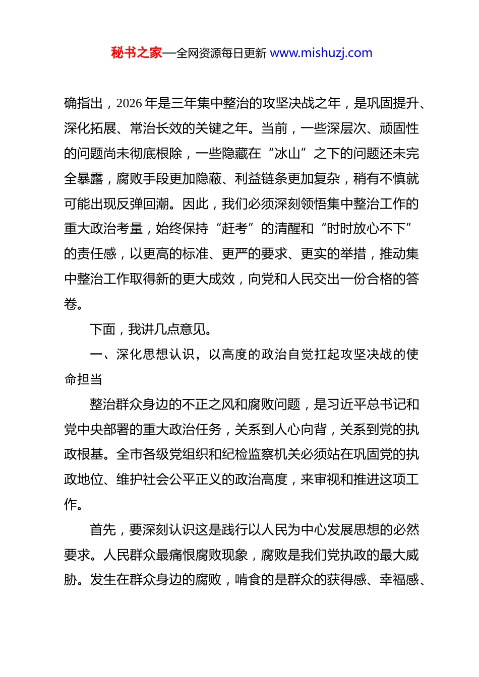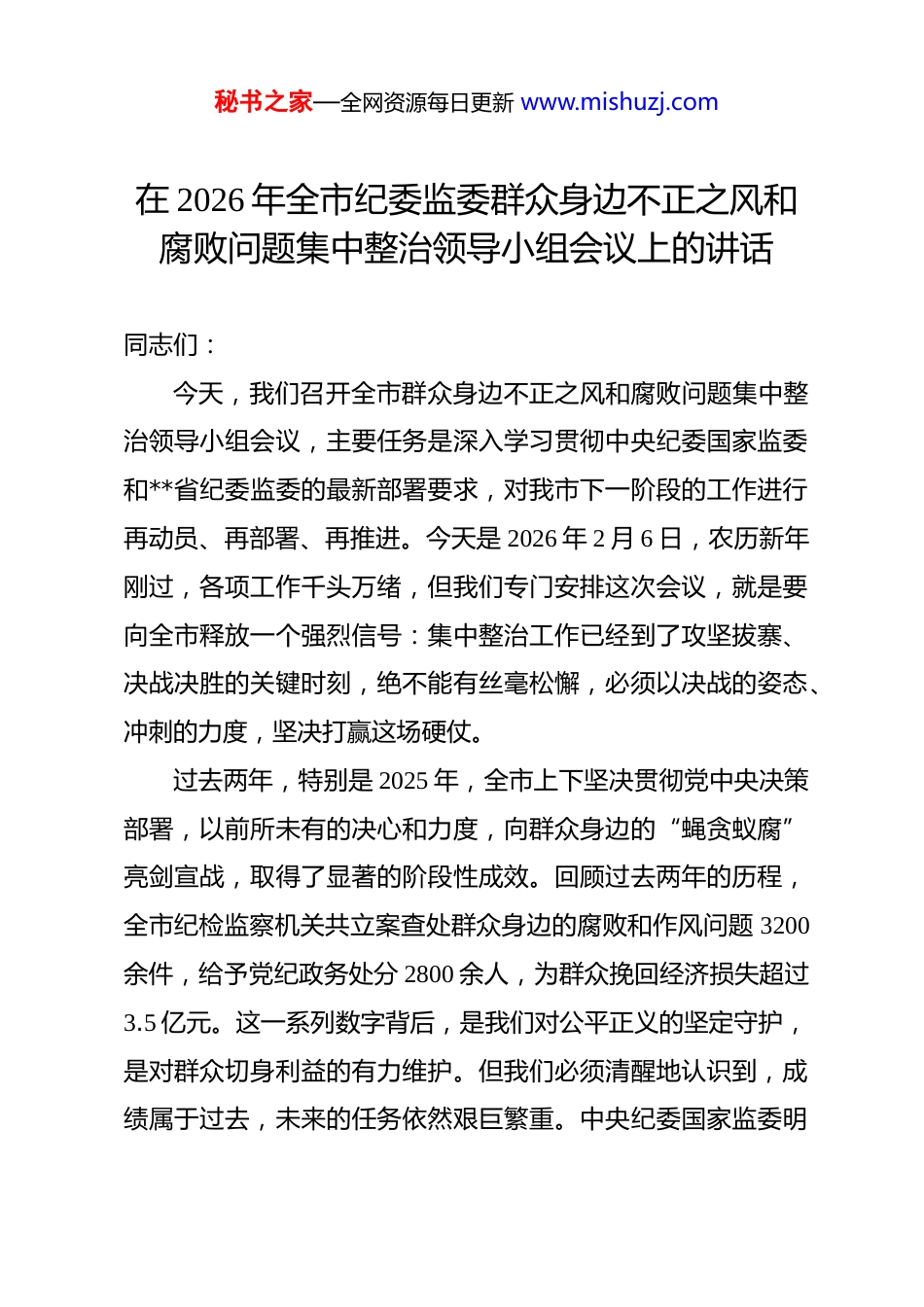 秘书之家—全网资源每日更新 www.mishuzj.com在 2026 年全市纪委监委群众身边不正之风和腐败问题集中整治领导小组会议上的讲话 同志们:今天,我们召开全市群众身边不正之风和腐败问题集中整治领导小组会议,主要任务是深入学习贯彻中央纪委国家监委和**省纪委监委的最新部署要求,对我市下一阶段的工作进行再动员、再部署、再推进。今天是 2026 年 2 月 6 日,农历新年刚过,各项工作千头万绪,但我们专门安排这次会议,就是要向全市释放一个强烈信号:集中整治工作已经到了攻坚拔寨、决战决胜的关键时刻,绝不能有丝毫松懈,必须以决战的姿态、冲刺的力度,坚决打赢这场硬仗。过去两年,特别是 2025 年,全市上下坚决贯彻党中央决策部署,以前所未有的决心和力度,向群众身边的“蝇贪蚁腐”亮剑宣战,取得了显著的阶段性成效。回顾过去两年的历程,全市纪检监察机关共立案查处群众身边的腐败和作风问题 3200余件,给予党纪政务处分 2800 余人,为群众挽回经济损失超过3.5 亿元。这一系列数字背后,是我们对公平正义的坚定守护,是对群众切身利益的有力维护。但我们必须清醒地认识到,成绩属于过去,未来的任务依然艰巨繁重。中央纪委国家监委明秘书之家—全网资源每日更新 www.mishuzj.com确指出,2026 年是三年集中整治的攻坚决战之年,是巩固提升、深化拓展、常治长效的关键之年。当前,一些深层次、顽固性的问题尚未彻底根除,一些隐藏在“冰山”之下的问题还未完全暴露,腐败手段更加隐蔽、利益链条更加复杂,稍有不慎就可能出现反弹回潮。因此,我们必须深刻领悟集中整治工作的重大政治考量,始终保持“赶考”的清醒和“时时放心不下”的责任感,以更高的标准、更严的要求、更实的举措,推动集中整治工作取得新的更大成效,向党和人民交出一份合格的答卷。下面,我讲几点意见。一、深化思想认识,以高度的政治自觉扛起攻坚决战的使命担当整治群众身边的不正之风和腐败问题,是习近平总书记和党中央部署的重大政治任务,关系到人心向背,关系到党的执政根基。全市各级党组织和纪检监察机关必须站在巩固党的执政地位、维护社会公平正义的政治高度,来审视和推进这项工作。首先,要深刻认识这是践行以人民为中心发展思想的必然要求。人民群众最痛恨腐败现象,腐败是我们党执政的最大威胁。发生在群众身边的腐败,啃食的是群众的获得感、幸福感、秘书之家—全网资源每日更新 www.mishuzj.com安全感,挥霍的是基层群众对党的信任。从全国范围看,2025年 1 至 11 月,全国共查处群众身边不正之风和腐败问题高达 84万件,处分 53.6 万人,这充分说明了问题的严重性和整治的紧迫性。我们必须把维护好、实现好、发展好最广大人民的根本利益作为一切工作的出发点和落脚点。要始终坚持问题导向,聚焦人民群众急难愁盼问题,下大力气解决一批群众反映强烈的突出问题,让人民群众在正风肃纪反腐中有实实在在的感受,感受到公平正义就在身边。其次,要准确把握这是推动全面从严治党向基层延伸的战略举措。基层是党的执政之基、力量之源。如果基层权力失控、生态恶化,党的路线方针政策就无法落地生根,最终会动摇整个执政大厦的根基。集中整治的目的,就是要打通全面从严治党的“最后一公里”,推动管党治党责任在基层压紧压实。要通过强有力的监督执纪问责,清除基层政治生态的“污染源”,净化基层干部的思想和行为,教育引导广大基层党员干部知敬畏、存戒惧、守底线,使基层党组织真正成为坚强的战斗堡垒。最后,要清醒看到这是应对当前复杂严峻反腐败斗争形势的现实需要。当前,反腐败斗争取得压倒性胜利并全面巩固,但形势依然严峻复杂。从我市的情况看,一些问题依然易发多发,一些领域的腐败存量尚未见底,增量仍在发生。特别是随秘书之家—全网资源每日更新 www.mishuzj.com着整治工作的深入,一些腐败分子变换手法,搞起了“期权腐败”“影子公司”等新型腐败和隐性腐败,查处难度更大。我们必须保持战略定力,发扬彻底的自我革命精神,一刻不停歇地推进反腐败斗争。决战决胜之年,意味着不能再有任何犹豫和观望,必须以“狭路相逢勇者胜”的气概,坚...