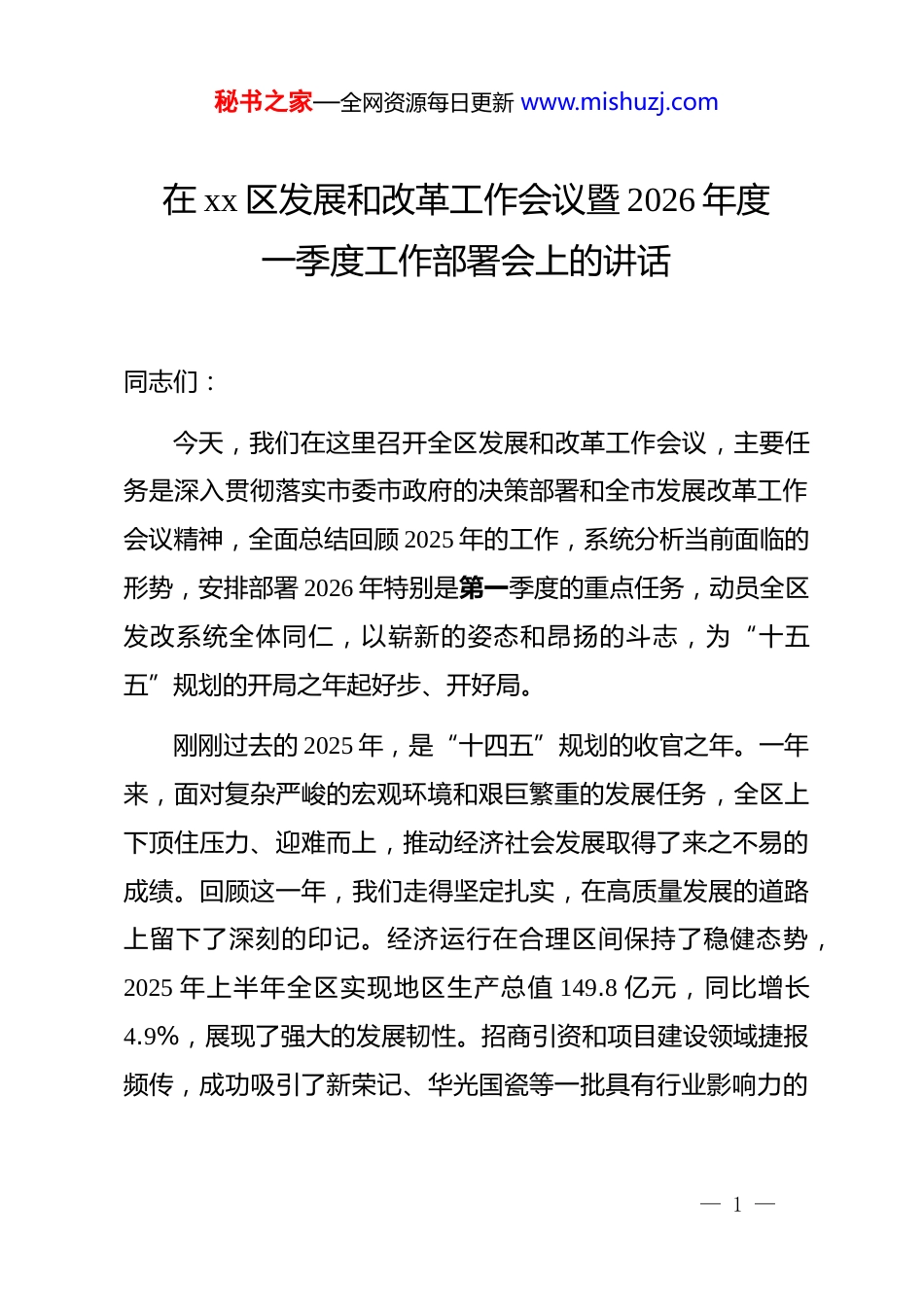 秘书之家—全网资源每日更新 www.mishuzj.com在 xx 区发展和改革工作会议暨 2026 年度一季度工作部署会上的讲话同志们:今天,我们在这里召开全区发展和改革工作会议,主要任务是深入贯彻落实市委市政府的决策部署和全市发展改革工作会议精神,全面总结回顾 2025 年的工作,系统分析当前面临的形势,安排部署 2026 年特别是第一季度的重点任务,动员全区发改系统全体同仁,以崭新的姿态和昂扬的斗志,为“十五五”规划的开局之年起好步、开好局。刚刚过去的 2025 年,是“十四五”规划的收官之年。一年来,面对复杂严峻的宏观环境和艰巨繁重的发展任务,全区上下顶住压力、迎难而上,推动经济社会发展取得了来之不易的成绩。回顾这一年,我们走得坚定扎实,在高质量发展的道路上留下了深刻的印记。经济运行在合理区间保持了稳健态势,2025 年上半年全区实现地区生产总值 149.8 亿元,同比增长4.9%,展现了强大的发展韧性。招商引资和项目建设领域捷报频传,成功吸引了新荣记、华光国瓷等一批具有行业影响力的— 1 —秘书之家—全网资源每日更新 www.mishuzj.com重大项目签约落地。政策性资金的争取工作也取得了重大突破,全年累计争取到中央和省级政策性资金支持,为重点项目的顺利实施提供了坚实的保障。当然,在肯定成绩的同时,也必须清醒地认识到发展道路上存在的短板与挑战。去年上半年,固定资产投资一度出现波动,这深刻反映出我区在投资结构、项目储备和要素保障等方面依然存在薄弱环节。部分产业的转型升级速度有待加快,新旧动能转换的任务依然艰巨。这些问题,既是过去的考验,更是我们今后工作中必须集中力量攻克的关隘。站在 2026 年的新起点,作为“十五五”的开局之年,做好今年的发展改革工作,意义非凡,责任重大。全区发改系统必须胸怀大局、认清大势,切实增强责任感、使命感和紧迫感,以更加饱满的热情、更加务实的作风,投入到新一年的工作中去。下面,我围绕今年的工作,讲几点意见。一、洞察时与势,在把握大局中校准新航向做好发展改革工作,前提是精准把握宏观大势与区域实际的结合点。当前,我区发展面临的机遇与挑战并存,但总体来看,机遇大于挑战。— 2 —秘书之家—全网资源每日更新 www.mishuzj.com从宏观层面看,发展的有利条件正在不断积聚。国家宏观政策持续加力,强调跨周期和逆周期调节的结合,特别是将超长期特别国债、中央预算内投资作为拉动有效投资的重要工具,为我们争取重大项目和资金支持打开了新的政策窗口。国家推动新一轮大规模设备更新和消费品以旧换新,聚焦数字经济、绿色低碳等新兴产业的战略布局,为我区产业结构优化升级指明了方向,提供了广阔的市场空间。从区域层面看,发展的内生动力正在加速形成。市委、市政府坚定不移推进高质量发展的战略部署,为全区工作提供了根本遵循和强大后盾。“十五五”规划的启动实施,意味着新一轮的发展周期已经开启,一系列具有牵引性、带动性的重大战略、重大改革、重大项目将相继落地,为我区承接辐射、错位发展创造了有利条件。经过多年的积累,我区的产业基础、城市功能和营商环境都得到了显著提升,发展的承载能力和吸引力持续增强。然而,我们同样要正视前进道路上的风险和挑战。外部环境的复杂性、严峻性、不确定性依然突出,经济恢复的基础尚不稳固。从内部看,我区经济发展的结构性、体制性矛盾尚未根本解决。传统动能的衰减与新动能的培育壮大之间存在时间— 3 —秘书之家—全网资源每日更新 www.mishuzj.com差,科技创新对产业的支撑能力还不够强,土地、资金等要素制约日益趋紧,一些干部在思想观念、能力本领上还不能完全适应高质量发展的新要求。面对这样的形势,我们既不能盲目乐观,也不能畏缩不前,必须保持战略定力,坚定发展信心,善于在危机中育先机、于变局中开新局,牢牢把握发展的主动权。二、聚焦关键点,在精准发力中开创新局面2026 年是实施“十五五”规划的起步之年,做好全年工作至关重要。全区发展改革工作要紧紧围绕区委、区政府的中心工作,坚持稳中求进、以进促稳、先立后破的总基调,聚焦关键领域和薄弱环节,精准施策、靶向发...