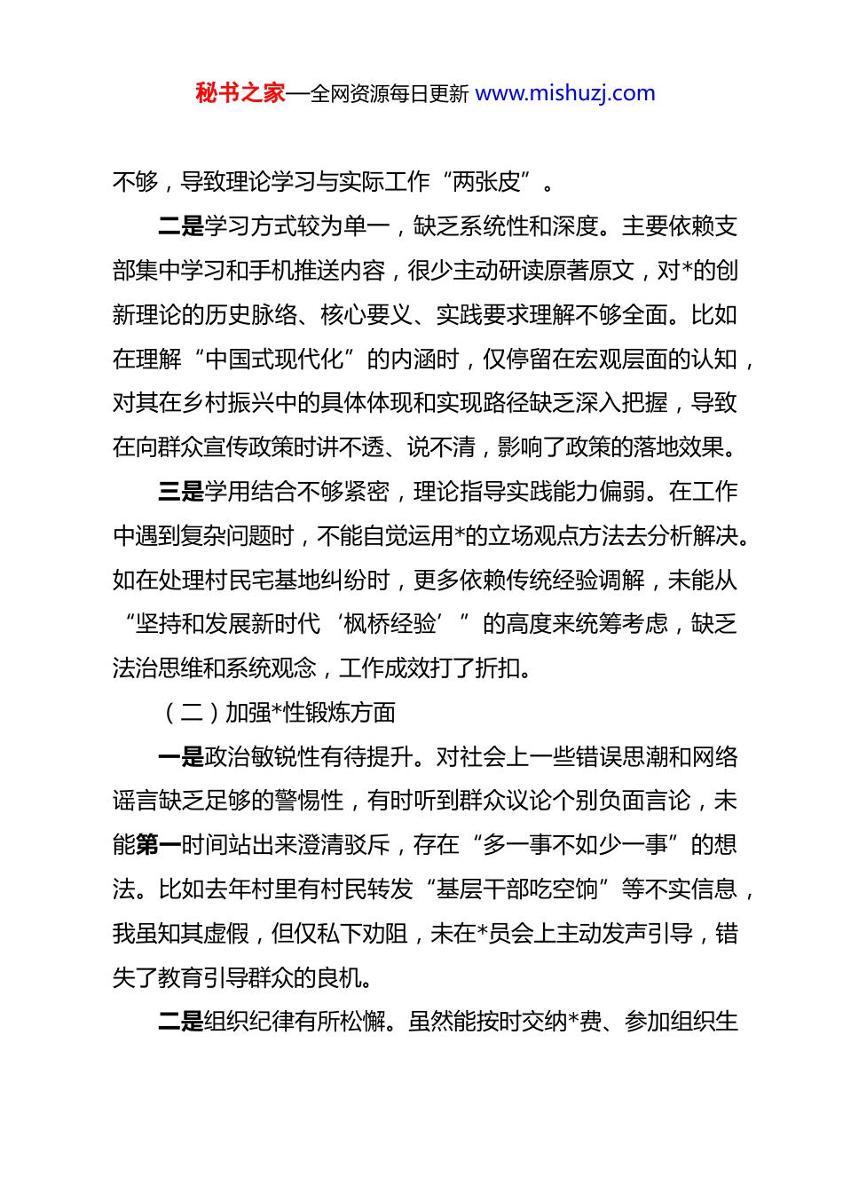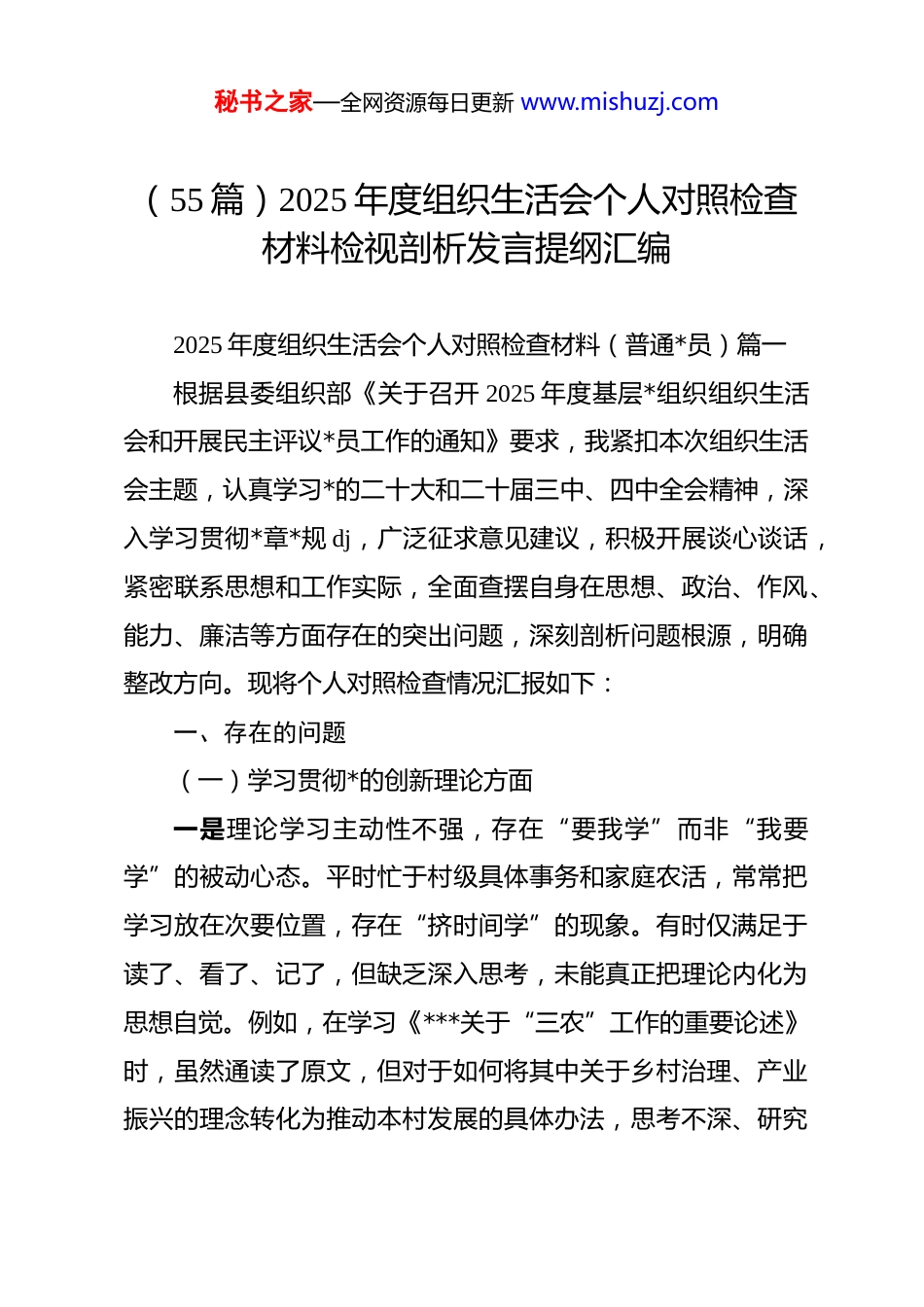 秘书之家—全网资源每日更新 www.mishuzj.com(55 篇)2025 年度组织生活会个人对照检查材料检视剖析发言提纲汇编2025 年度组织生活会个人对照检查材料(普通*员)篇一根据县委组织部《关于召开 2025 年度基层*组织组织生活会和开展民主评议*员工作的通知》要求,我紧扣本次组织生活会主题,认真学习*的二十大和二十届三中、四中全会精神,深入学习贯彻*章*规 dj,广泛征求意见建议,积极开展谈心谈话,紧密联系思想和工作实际,全面查摆自身在思想、政治、作风、能力、廉洁等方面存在的突出问题,深刻剖析问题根源,明确整改方向。现将个人对照检查情况汇报如下:一、存在的问题(一)学习贯彻*的创新理论方面一是理论学习主动性不强,存在“要我学”而非“我要学”的被动心态。平时忙于村级具体事务和家庭农活,常常把学习放在次要位置,存在“挤时间学”的现象。有时仅满足于读了、看了、记了,但缺乏深入思考,未能真正把理论内化为思想自觉。例如,在学习《***关于“三农”工作的重要论述》时,虽然通读了原文,但对于如何将其中关于乡村治理、产业振兴的理念转化为推动本村发展的具体办法,思考不深、研究秘书之家—全网资源每日更新 www.mishuzj.com不够,导致理论学习与实际工作“两张皮”。二是学习方式较为单一,缺乏系统性和深度。主要依赖支部集中学习和手机推送内容,很少主动研读原著原文,对*的创新理论的历史脉络、核心要义、实践要求理解不够全面。比如在理解“中国式现代化”的内涵时,仅停留在宏观层面的认知,对其在乡村振兴中的具体体现和实现路径缺乏深入把握,导致在向群众宣传政策时讲不透、说不清,影响了政策的落地效果。三是学用结合不够紧密,理论指导实践能力偏弱。在工作中遇到复杂问题时,不能自觉运用*的立场观点方法去分析解决。如在处理村民宅基地纠纷时,更多依赖传统经验调解,未能从“坚持和发展新时代‘枫桥经验’”的高度来统筹考虑,缺乏法治思维和系统观念,工作成效打了折扣。(二)加强*性锻炼方面一是政治敏锐性有待提升。对社会上一些错误思潮和网络谣言缺乏足够的警惕性,有时听到群众议论个别负面言论,未能第一时间站出来澄清驳斥,存在“多一事不如少一事”的想法。比如去年村里有村民转发“基层干部吃空饷”等不实信息,我虽知其虚假,但仅私下劝阻,未在*员会上主动发声引导,错失了教育引导群众的良机。二是组织纪律有所松懈。虽然能按时交纳*费、参加组织生秘书之家—全网资源每日更新 www.mishuzj.com活,但有时因农忙或家庭事务请假缺席,未能做到“无特殊情况绝不缺席”。在参加组织生活时,发言积极性不高,多以听为主,很少主动交流心得体会,存在“走过场”倾向。在开展批评与自我批评时,自我批评避重就轻,对他人的批评也多以“建议”代“批评”,辣味不足,未能真正达到“红脸出汗”的效果。三是宗旨意识有所淡化。随着年龄增长和长期在农村生活,我产生了“守成”心态,干事创业的热情有所减退。面对村级发展中的一些难题,如集体经济发展缓慢、基础设施老化等问题,有时感到无力改变,存在“等靠要”思想,缺乏攻坚克难的斗志和担当精神。(三)联系服务群众方面一是深入群众不够经常。虽然定期参与村“两委”组织的走访活动,但大多是完成任务式走访,与群众面对面交流时间短、话题浅,未能真正沉下去了解群众的急难愁盼。例如在走访脱贫监测户时,多以询问收入、查看资料为主,对其心理状态、子女教育、就医用药等深层次需求关注不多,帮扶措施针对性不强。二是回应诉求不够及时。对群众通过微信群、电话等方式反映的问题,有时因个人事务繁忙未能第一时间回复,存在拖秘书之家—全网资源每日更新 www.mishuzj.com延现象。如今年初有村民反映村道路灯损坏影响夜间出行,我知晓后未及时向村干部反馈,直到该路段发生一起轻微交通事故后才引起重视,暴露出服务群众的主动性不足。三是政策宣传不到位。在传达惠农政策、医保缴费、养老保险等信息时,习惯于“发个通知”“贴个公告”,缺乏耐心细致地讲解。特别是对老年人群体,未采取通俗易懂的方式进行解读,导致部分群众对政策理解有偏差,影响了政策...