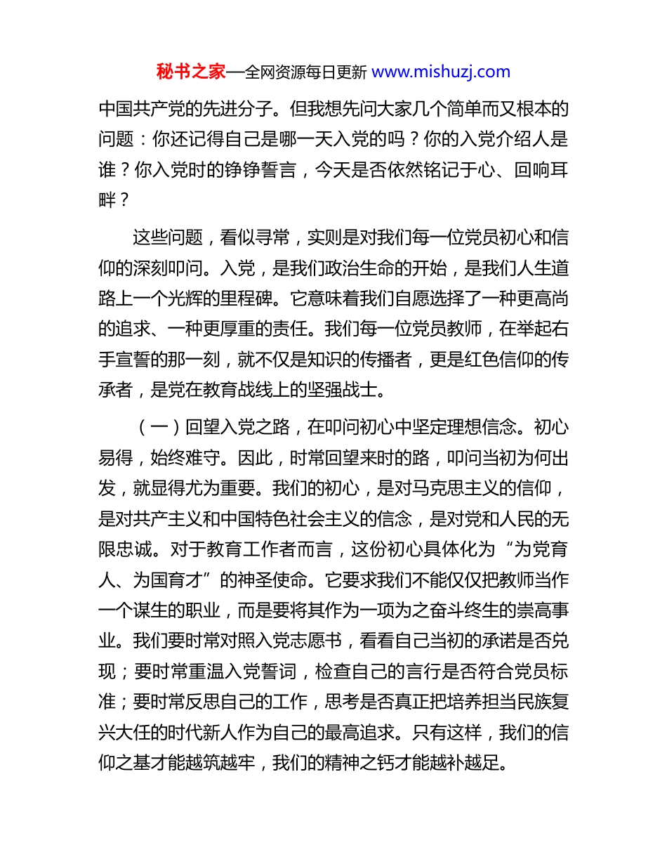 秘书之家—全网资源每日更新 www.mishuzj.com党课:以党员之责担育人使命在教育强市建设中勇当先锋同志们:今天,我们齐聚一堂,召开这次专题党课,主要目的是深入学习领会党的二十届四中全会精神,结合我们正在全力推进的教育强市建设战略,进一步统一思想、凝聚共识、激发干劲,动员全体党员同志在新的征程上展现新担当、实现新作为。就在不久前,习近平总书记发表了二 O 二六年新年贺词,言语间充满了对人民的深情、对国家的期许、对未来的信心。总书记的讲话深刻揭示了“党兴方能国强”这一颠扑不破的真理。办好中国的事情,关键在党。同样,办好 XX 的教育事业,关键也在于毫不动令地坚持和加强党的全面领导,在于我们每一位党员的先锋模范作用。今天我讲的题目是“以党员之责担育人使命在教育强市建设中勇当先锋”。我将围绕三个方面,与同志们进行交流和探讨:一是筑牢信仰之基,深刻领悟“为何出发”的初心之问;二是明晰双重责任,精准把握“如何担当”的时代之责;三是勇当时代先锋,奋力书写“怎样作为”的实践之篇。一、筑牢信仰之基,深刻领悟“为何出发”的初心之问在座的每一位同志,都是经过党组织严格考验、光荣加入秘书之家—全网资源每日更新 www.mishuzj.com中国共产党的先进分子。但我想先问大家几个简单而又根本的问题:你还记得自己是哪一天入党的吗?你的入党介绍人是谁?你入党时的铮铮誓言,今天是否依然铭记于心、回响耳畔?这些问题,看似寻常,实则是对我们每一位党员初心和信仰的深刻叩问。入党,是我们政治生命的开始,是我们人生道路上一个光辉的里程碑。它意味着我们自愿选择了一种更高尚的追求、一种更厚重的责任。我们每一位党员教师,在举起右手宣誓的那一刻,就不仅是知识的传播者,更是红色信仰的传承者,是党在教育战线上的坚强战士。(一)回望入党之路,在叩问初心中坚定理想信念。初心易得,始终难守。因此,时常回望来时的路,叩问当初为何出发,就显得尤为重要。我们的初心,是对马克思主义的信仰,是对共产主义和中国特色社会主义的信念,是对党和人民的无限忠诚。对于教育工作者而言,这份初心具体化为“为党育人、为国育才”的神圣使命。它要求我们不能仅仅把教师当作一个谋生的职业,而是要将其作为一项为之奋斗终生的崇高事业。我们要时常对照入党志愿书,看看自己当初的承诺是否兑现;要时常重温入党誓词,检查自己的言行是否符合党员标准;要时常反思自己的工作,思考是否真正把培养担当民族复兴大任的时代新人作为自己的最高追求。只有这样,我们的信仰之基才能越筑越牢,我们的精神之钙才能越补越足。秘书之家—全网资源每日更新 www.mishuzj.com(二)深学党章党规,在校准航向中增强党性修'养。党章是党的根本大法,是全党必须遵循的总规矩。深入学习党章、严格遵守党章,是加强党性修养的根本途径,也是我们每一位党员的终身必修课。党的二十大对党章进行了修订,充分体现了我们党理论创新、实践创新、制度创新的最新成果。我们必须原原本本学、逐字逐句悟,深刻理解其中蕴含的核心要义、精神实质和实践要求。特别是要深入学习领会习近平新时代中国特色社会主义思想,尤其是习近平总书记关于教育的重要论述,将其作为我们思考问题、谋划工作、推动发展的“定盘星”和“指南针”。通过学习,我们要不断校准自己的思想航向和行动坐标,深刻领悟“两个确立”的决定性意义,增强“四个意识”、坚定“四个自信”、做到“两个维护”,始终在思想上政治上行动上同以习近平同志为核心的党中央保持高度一致,确保我们的教育事业始终沿着正确的政治方向前进。(三)赓续红色血脉,在汲取力量中传承奋斗精神。我们党的百年历史,是一部践行初心使命的奋斗史,也是一部用鲜血和生命铸就的英雄史。从革命战争年代的“砍头不要紧,只要主义真”,到和平建设时期的“我为祖国献石油”,再到新时代的“清澈的爱,只为中国”,无数共产党员用自己的实际行动,谱写了一曲曲感天动地的英雄赞歌。在我们 XX 这片热土上,同样涌现出了一大批为革命、为建设、为改革事业英勇献身的先烈和楷模。他们的事迹,就是我们身边最生动、最鲜秘...
