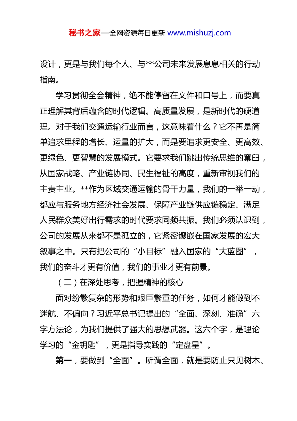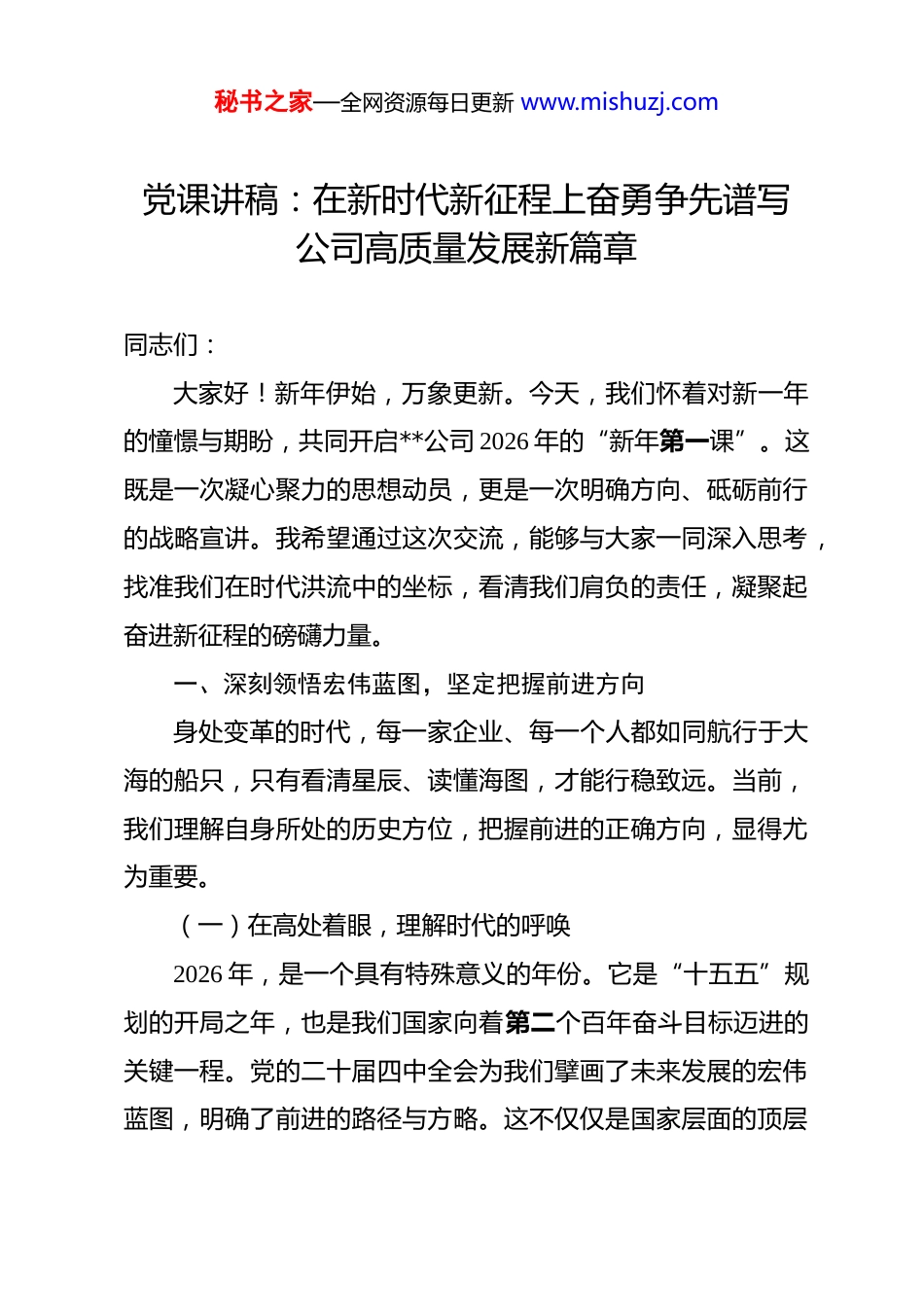 秘书之家—全网资源每日更新 www.mishuzj.com党课讲稿:在新时代新征程上奋勇争先谱写公司高质量发展新篇章 同志们:大家好!新年伊始,万象更新。今天,我们怀着对新一年的憧憬与期盼,共同开启**公司 2026 年的“新年第一课”。这既是一次凝心聚力的思想动员,更是一次明确方向、砥砺前行的战略宣讲。我希望通过这次交流,能够与大家一同深入思考,找准我们在时代洪流中的坐标,看清我们肩负的责任,凝聚起奋进新征程的磅礴力量。一、深刻领悟宏伟蓝图,坚定把握前进方向身处变革的时代,每一家企业、每一个人都如同航行于大海的船只,只有看清星辰、读懂海图,才能行稳致远。当前,我们理解自身所处的历史方位,把握前进的正确方向,显得尤为重要。(一)在高处着眼,理解时代的呼唤2026 年,是一个具有特殊意义的年份。它是“十五五”规划的开局之年,也是我们国家向着第二个百年奋斗目标迈进的关键一程。党的二十届四中全会为我们擘画了未来发展的宏伟蓝图,明确了前进的路径与方略。这不仅仅是国家层面的顶层秘书之家—全网资源每日更新 www.mishuzj.com设计,更是与我们每个人、与**公司未来发展息息相关的行动指南。学习贯彻全会精神,绝不能停留在文件和口号上,而要真正理解其背后蕴含的时代逻辑。高质量发展,是新时代的硬道理。对于我们交通运输行业而言,这意味着什么?它不再是简单追求里程的增长、运量的扩大,而是要追求更安全、更高效、更绿色、更智慧的发展模式。它要求我们跳出传统思维的窠臼,从国家战略、产业链协同、民生福祉的高度,重新审视我们的主责主业。**作为区域交通运输的骨干力量,我们的一举一动,都应与服务地方经济社会发展、保障产业链供应链稳定、满足人民群众美好出行需求的时代要求同频共振。我们必须认识到,公司的发展从来都不是孤立的,它紧密镶嵌在国家发展的宏大叙事之中。只有把公司的“小目标”融入国家的“大蓝图”,我们的奋斗才更有价值,我们的事业才更有前景。(二)在深处思考,把握精神的核心面对纷繁复杂的形势和艰巨繁重的任务,如何才能做到不迷航、不偏向?习近平总书记提出的“全面、深刻、准确”六字方法论,为我们提供了强大的思想武器。这六个字,是理论学习的“金钥匙”,更是指导实践的“定盘星”。第一,要做到“全面”。所谓全面,就是要防止只见树木、秘书之家—全网资源每日更新 www.mishuzj.com不见森林的片面性。在工作中,不能只盯着自己的“一亩三分地”,满足于完成眼前的任务指标。例如,一名驾驶员不能只认为安全行车就万事大吉,还要思考如何提升服务质量,如何成为公司流动的“形象窗口”;一名管理者不能只看重成本与利润,还要看到安全生产的底线、员工队伍的稳定以及企业长远的品牌建设。全面,要求我们具备系统观念,把公司的各项工作,如安全、经营、党建、服务等,看作一个有机整体,统筹推进,协同发展。第二,要做到“深刻”。所谓深刻,就是要力戒浅尝辄止、浮于表面的思想惰性。理论学习不能满足于“听过了”“读过了”,而要深入思考“为什么这么说”“背后是什么道理”“我们该怎么做”。要透过现象看本质,理解每一项决策部署背后的深层逻辑。比如,公司强调数字化转型,不能简单理解为购买几套软件、更新几台设备,而要深刻认识到这是行业发展的必然趋势,是提升核心竞争力的关键一招,是关系到公司未来生存与发展的战略抉择。只有理解得深刻,我们执行起来才会更自觉、行动起来才会更坚定。第三,要做到“准确”。所谓准确,就是要确保思想和行动始终与党中央的要求保持高度一致,不打折扣、不搞变通。要准确把握政策的边界和精神的实质,既要防止思想僵化、故秘书之家—全网资源每日更新 www.mishuzj.com步自封的“不及”,也要避免脱离实际、盲目冒进的“过头”。在推进改革、谋划发展的过程中,必须坚持实事求是的原则,把上级的要求与公司的实际紧密结合起来,创造性地开展工作,确保我们的每一步都踩在实处、落在点上,真正把理论学习的成果转化为推动公司高质量发展的实际成效。二、深刻审视现实坐标,勇敢扛起时代使命看清了远方,更要走好脚下的路。作为一名在**公司...