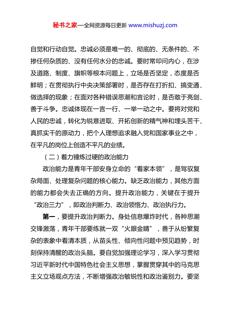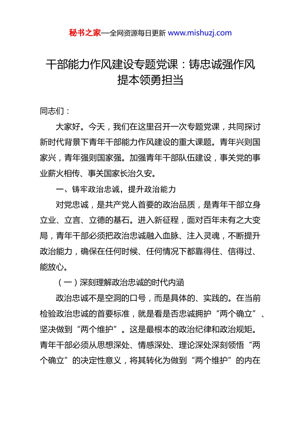 秘书之家—全网资源每日更新 www.mishuzj.com干部能力作风建设专题党课:铸忠诚强作风提本领勇担当 同志们:大家好。今天,我们在这里召开一次专题党课,共同探讨新时代背景下青年干部能力作风建设的重大课题。青年兴则国家兴,青年强则国家强。加强青年干部队伍建设,事关党的事业薪火相传、事关国家长治久安。一、铸牢政治忠诚,提升政治能力对党忠诚,是共产党人首要的政治品质,是青年干部立身立业、立言、立德的基石。进入新征程,面对百年未有之大变局,青年干部必须把政治忠诚融入血脉、注入灵魂,不断提升政治能力,确保在任何时候、任何情况下都靠得住、信得过、能放心。(一)深刻理解政治忠诚的时代内涵政治忠诚不是空洞的口号,而是具体的、实践的。在当前检验政治忠诚的首要标准,就是看是否忠诚拥护“两个确立”、坚决做到“两个维护”。这是最根本的政治纪律和政治规矩。青年干部必须从思想深处、情感深处、理论深处深刻领悟“两个确立”的决定性意义,将其转化为做到“两个维护”的内在秘书之家—全网资源每日更新 www.mishuzj.com自觉和行动自觉。忠诚必须是唯一的、彻底的、无条件的、不掺任何杂质的、没有任何水分的忠诚。要时常叩问内心,在涉及道路、制度、旗帜等根本问题上,立场是否坚定,态度是否鲜明;在贯彻执行中央决策部署时,是否存在打折扣、搞变通、做选择的现象;在面对各种错误思潮和言论时,是否敢于亮剑、善于斗争。忠诚体现在一言一行、一举一动之中。要将对党和人民的忠诚,转化为锐意进取、开拓创新的精气神和埋头苦干、真抓实干的原动力,把个人理想追求融入党和国家事业之中,在平凡的岗位上创造不平凡的业绩。(二)着力锤炼过硬的政治能力政治能力是青年干部安身立命的“看家本领”,是驾驭复杂局面、处理复杂问题的核心能力。缺乏政治能力,其他方面的能力都会失去正确的方向。提升政治能力,关键在于提升“政治三力”,即政治判断力、政治领悟力、政治执行力。第一,要提升政治判断力。身处信息爆炸时代,各种思潮交锋激荡,青年干部要练就一双“火眼金睛”,善于从纷繁复杂的表象中看清本质,从苗头性、倾向性问题中预见趋势,时刻保持清醒的政治头脑。要自觉加强理论学习,深入学习贯彻习近平新时代中国特色社会主义思想,掌握贯穿其中的马克思主义立场观点方法,不断增强政治敏锐性和政治鉴别力。要坚秘书之家—全网资源每日更新 www.mishuzj.com持从政治上分析问题、思考问题,在大是大非面前旗帜鲜明,在风浪考验面前无所畏惧,始终做政治上的“明白人”。第二,要提升政治领悟力。对党中央的决策部署,不能停留在简单传达、机械执行的层面,而要深入学习、反复思考,准确把握其精神实质、核心要义和实践要求。要善于站在党和国家事业发展全局的高度,深刻领会每一项决策背后的政治考量、战略意图和深远影响。只有领悟得深、领悟得透,才能找准工作的切入点和着力点,确保执行不偏向、不走样。要养成勤于思考、善于总结的习惯,将上级精神与**区、**单位的实际紧密结合,创造性地开展工作。第三,要提升政治执行力。一分部署,九分落实。政治执行力是政治领悟力的最终体现。青年干部要强化责任意识和担当精神,对党中央的决策部署、省委市委和区委的工作安排,要闻令而动、听令而行,不讲条件、不搞变通,以“钉钉子”精神一抓到底。要敢于直面问题,勇于攻坚克难,对于发展中的“硬骨头”、改革中的“深水区”,要有“明知山有虎,偏向虎山行”的勇气和魄力,确保各项任务落地生根、开花结果。(三)探索政治素质的具象化考察如何客观、精准地评价一名干部的政治忠诚与政治能力,是组织工作面临的重要课题。抽象的政治标准必须具体化、可秘书之家—全网资源每日更新 www.mishuzj.com衡量。当前,各级组织部门正在积极探索构建科学的干部政治素质考察体系。例如,一些地方围绕“政治忠诚、政治定力、政治担当、政治能力、政治自律”五个方面,研究制定了具体的正向和反向评价指标。据了解,有的地方甚至细化出了包含12 条正向评价和 12 条反向评价的清单。此外,“政治体检”、“干部政治素质负面表现评议表”等工具的运...