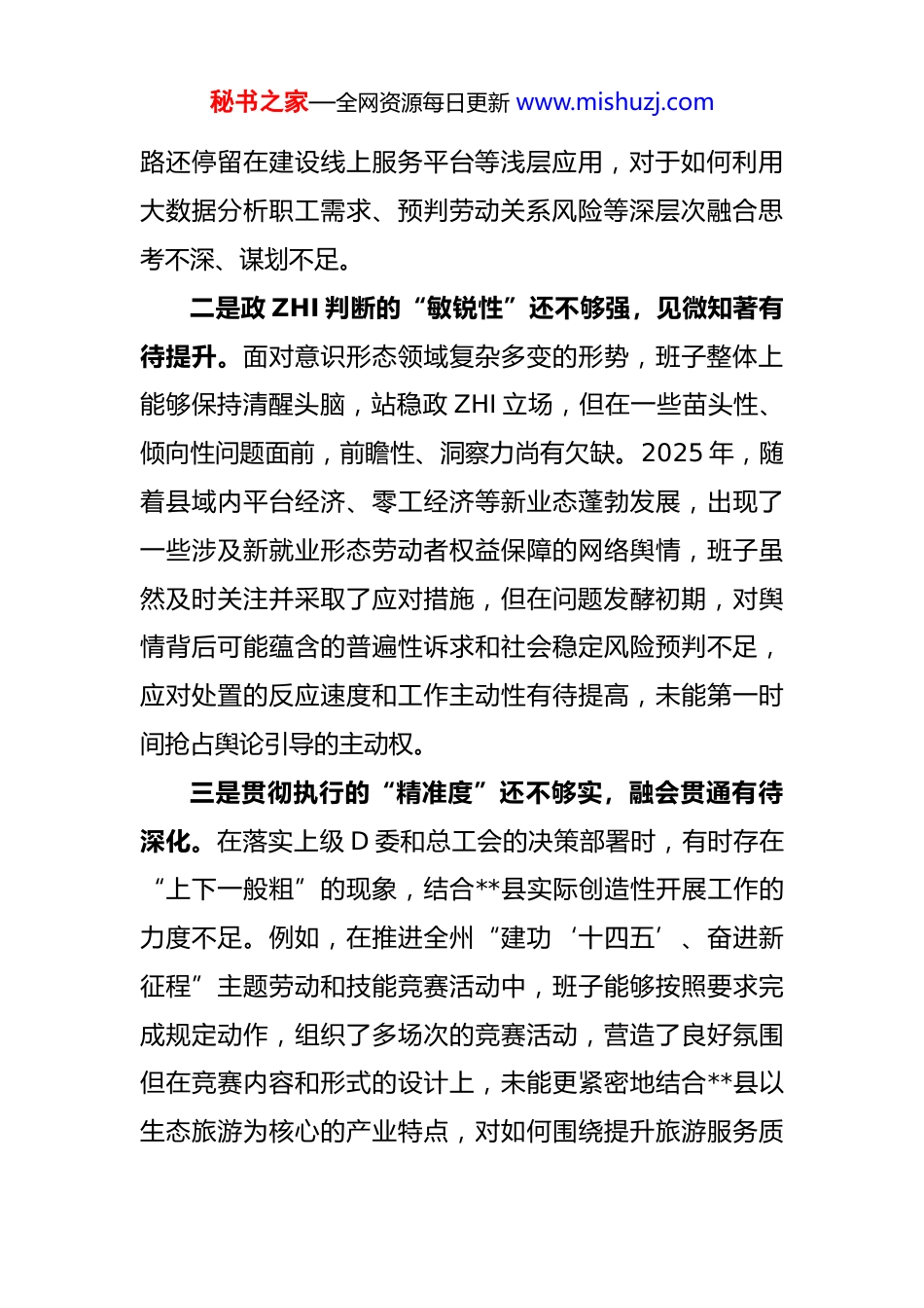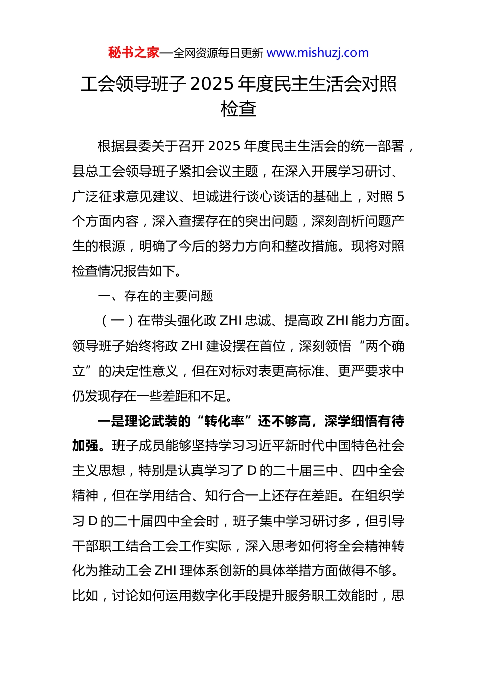 秘书之家—全网资源每日更新 www.mishuzj.com工会领导班子 2025 年度民主生活会对照检查根据县委关于召开 2025 年度民主生活会的统一部署,县总工会领导班子紧扣会议主题,在深入开展学习研讨、广泛征求意见建议、坦诚进行谈心谈话的基础上,对照 5个方面内容,深入查摆存在的突出问题,深刻剖析问题产生的根源,明确了今后的努力方向和整改措施。现将对照检查情况报告如下。一、存在的主要问题(一)在带头强化政 ZHI 忠诚、提高政 ZHI 能力方面。领导班子始终将政 ZHI 建设摆在首位,深刻领悟“两个确立”的决定性意义,但在对标对表更高标准、更严要求中仍发现存在一些差距和不足。一是理论武装的“转化率”还不够高,深学细悟有待加强。班子成员能够坚持学习习近平新时代中国特色社会主义思想,特别是认真学习了 D 的二十届三中、四中全会精神,但在学用结合、知行合一上还存在差距。在组织学习 D 的二十届四中全会时,班子集中学习研讨多,但引导干部职工结合工会工作实际,深入思考如何将全会精神转化为推动工会 ZHI 理体系创新的具体举措方面做得不够。比如,讨论如何运用数字化手段提升服务职工效能时,思秘书之家—全网资源每日更新 www.mishuzj.com路还停留在建设线上服务平台等浅层应用,对于如何利用大数据分析职工需求、预判劳动关系风险等深层次融合思考不深、谋划不足。二是政 ZHI 判断的“敏锐性”还不够强,见微知著有待提升。面对意识形态领域复杂多变的形势,班子整体上能够保持清醒头脑,站稳政 ZHI 立场,但在一些苗头性、倾向性问题面前,前瞻性、洞察力尚有欠缺。2025 年,随着县域内平台经济、零工经济等新业态蓬勃发展,出现了一些涉及新就业形态劳动者权益保障的网络舆情,班子虽然及时关注并采取了应对措施,但在问题发酵初期,对舆情背后可能蕴含的普遍性诉求和社会稳定风险预判不足,应对处置的反应速度和工作主动性有待提高,未能第一时间抢占舆论引导的主动权。三是贯彻执行的“精准度”还不够实,融会贯通有待深化。在落实上级 D 委和总工会的决策部署时,有时存在“上下一般粗”的现象,结合**县实际创造性开展工作的力度不足。例如,在推进全州“建功‘十四五’、奋进新征程”主题劳动和技能竞赛活动中,班子能够按照要求完成规定动作,组织了多场次的竞赛活动,营造了良好氛围但在竞赛内容和形式的设计上,未能更紧密地结合**县以生态旅游为核心的产业特点,对如何围绕提升旅游服务质秘书之家—全网资源每日更新 www.mishuzj.com量、挖掘民族文化特色等方面设置更具针对性的赛项,以竞赛助推核心产业发展的“附加值”未能充分体现,存在为了完成任务而竞赛的倾向。(二)在带头固本培元、增强 D 性方面。班子始终注重加强 D 性修养,但对照共产 D 人精神追求的崇高境界,反躬自省,仍感到在锤炼 D 性、砥砺初心的日常化、自觉化方面存在不足。一是理想信念的“总开关”拧得不够紧,D 性锤炼偶有松懈。班子成员理想信念是坚定的,但在长期、复杂、具体的工作实践中,有时不自觉地将事务性工作等同于政ZHI 历练,存在以工作代替 D 性锻炼的倾向。在筹备 2025年 10 月召开的**县总工会第八次代表大会期间,大家全情投入,确保了大会圆满成功。然而,在会前繁杂的事务性工作中,少数班子成员对组织代表深入学习 D 章、重温入D 誓词等严肃 D 内政 ZHI 生活环节的重视程度有所弱化,认为只要程序走到、材料备齐即可,未能充分利用换届契机,将其作为一次深刻的 D 性教育和思想洗礼来抓,反映出在任何时候任何情况下都把 D 性修养摆在首位的自觉性还需进一步增强。二是自我革命的“手术刀”用得不够准,斗争精神有所弱化。在严肃的 D 内政 ZHI 生活中,班子成员能够开展秘书之家—全网资源每日更新 www.mishuzj.com批评和自我批评,但有时“辣味”不足,存在一定的“好人主义”思想。在班子内部的谈心谈话或专题研讨中,更多的是肯定成绩、交流工作,对于彼此思想上、作风上存在的苗头性问题,习惯于点到为止、和风细雨,担心批评过严会影响团结、挫伤积极性。这种“与人为善”的思维在一...