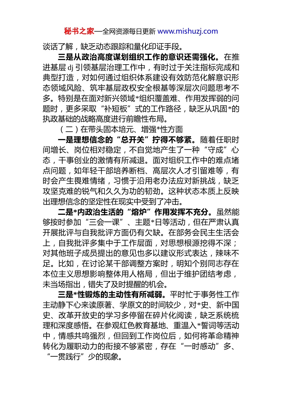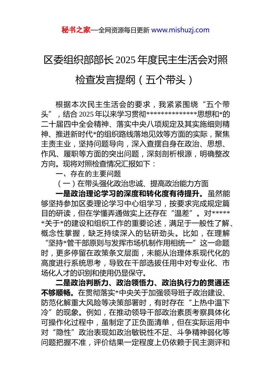秘书之家—全网资源每日更新 www.mishuzj.com区委组织部部长 2025 年度民主生活会对照检查发言提纲(五个带头)根据本次民主生活会的要求,我紧紧围绕“五个带头”,结合 2025 年以来学习贯彻**************思想和*的二十届四中全会精神、落实中央八项规定及其实施细则精神、推进新时代*的组织路线落地见效等方面的实际,聚焦主责主业,坚持问题导向,深入查摆自身在政治、思想、作风、履职等方面的突出问题,深刻剖析根源,明确整改方向。现将对照检查情况汇报如下:一、存在的主要问题(一)在带头强化政治忠诚、提高政治能力方面一是政治理论学习的深度和转化度有待提升。虽然能够坚持参加区委理论学习中心组学习,按要求完成规定篇目的研读,但在学懂弄通做实上还存在“温差”。对******关于*的建设和组织工作的重要论述,满足于一般性了解、概念性掌握,缺乏持续深入的钻研劲头。比如,在理解“坚持*管干部原则与发挥市场机制作用相统一”这一命题时,更多停留在政策条文层面,未能从治理体系现代化的高度进行系统思考,导致在干部选拔任用中对专业化、市场化人才的识别和使用仍显保守。二是政治判断力、政治领悟力、政治执行力的贯通还不够顺畅。在贯彻落实*中央关于加强领导班子政治建设、防范化解重大风险等决策部署时,有时存在“上热中温下冷”的现象。例如,在推动领导干部政治素质考察具体化可操作化过程中,虽制定了正负面清单,但在实际运用中对“隐性”政治表现如政治敏锐性不足、斗争精神弱化等问题把握不准,评价结果一定程度上仍依赖于民主测评和秘书之家—全网资源每日更新 www.mishuzj.com谈话了解,缺乏动态跟踪和量化印证手段。三是从政治高度谋划组织工作的意识还需强化。在推进基层 dj 引领基层治理工作中,有时过于关注指标完成和典型打造,对如何通过组织体系建设有效防范化解意识形态领域风险、筑牢基层政权安全根基等深层次问题思考不多。特别是在面对新兴领域*组织覆盖难、作用发挥弱的问题时,更多采取“补短板”式的工作路径,缺乏从巩固*的执政基础的战略高度进行前瞻性布局。(二)在带头固本培元、增强*性方面一是理想信念的“总开关”拧得不够紧。随着任职时间增长、岗位相对稳定,不自觉地产生了一种“守成”心态,干事创业的激情有所减退。面对组织工作中的难点堵点问题,如年轻干部培养断档、高层次人才引留难等,有时会产生畏难情绪,习惯于沿用老办法应对新挑战,缺乏攻坚克难的锐气和久久为功的韧劲。这种状态本质上反映出理想信念的坚定性在现实中受到了冲击。二是*内政治生活的“熔炉”作用发挥不充分。虽然能够按时参加“三会一课”、主题*日等活动,但在严肃认真开展批评与自我批评方面仍有欠缺。在部务会民主生活会上,自我批评多集中于工作层面,对思想根源挖得不深;对其他班子成员提出的意见也多以建议形式表达,辣味不足。比如,在讨论某干部调整方案时,明知个别同志存在本位主义思想影响整体用人格局,但出于维护团结考虑,未当场指出,错失了及时提醒的机会。三是*性锻炼的主动性有所减弱。平时忙于事务性工作主动静下心来读原著、学原文的时间较少,对*史、新中国史、改革开放史的学习多停留在碎片化阅读,缺乏系统梳理和深度感悟。在参观红色教育基地、重温入*誓词等活动中,情感共鸣强烈,但回到工作岗位后,如何将革命精神转化为履职动力的衔接不够紧密,存在“一时感动”多、“一贯践行”少的现象。秘书之家—全网资源每日更新 www.mishuzj.com(三)在带头敬畏人民、敬畏组织、敬畏法纪方面一是服务群众的宗旨意识树得不够牢固。虽然建立了组工干部联系基层制度,定期走访村社、企业,听取意见建议,但调研中仍存在“走马观花”“被安排”现象。比如,在调研社区工作者队伍建设时,主要听取街道*工委汇报,直接与一线社工面对面交流时间不足,对其职业发展诉求、心理压力状况掌握不全面,导致后续出台的激励保障政策针对性不强。这说明“坐在办公室都是问题,走进基层全是办法”的理念尚未真正入脑入心。二是执行组织程序的刚性有待加强。在干部动议、考察、任免等环节,基本能做到依规依纪依法办事,但在一...