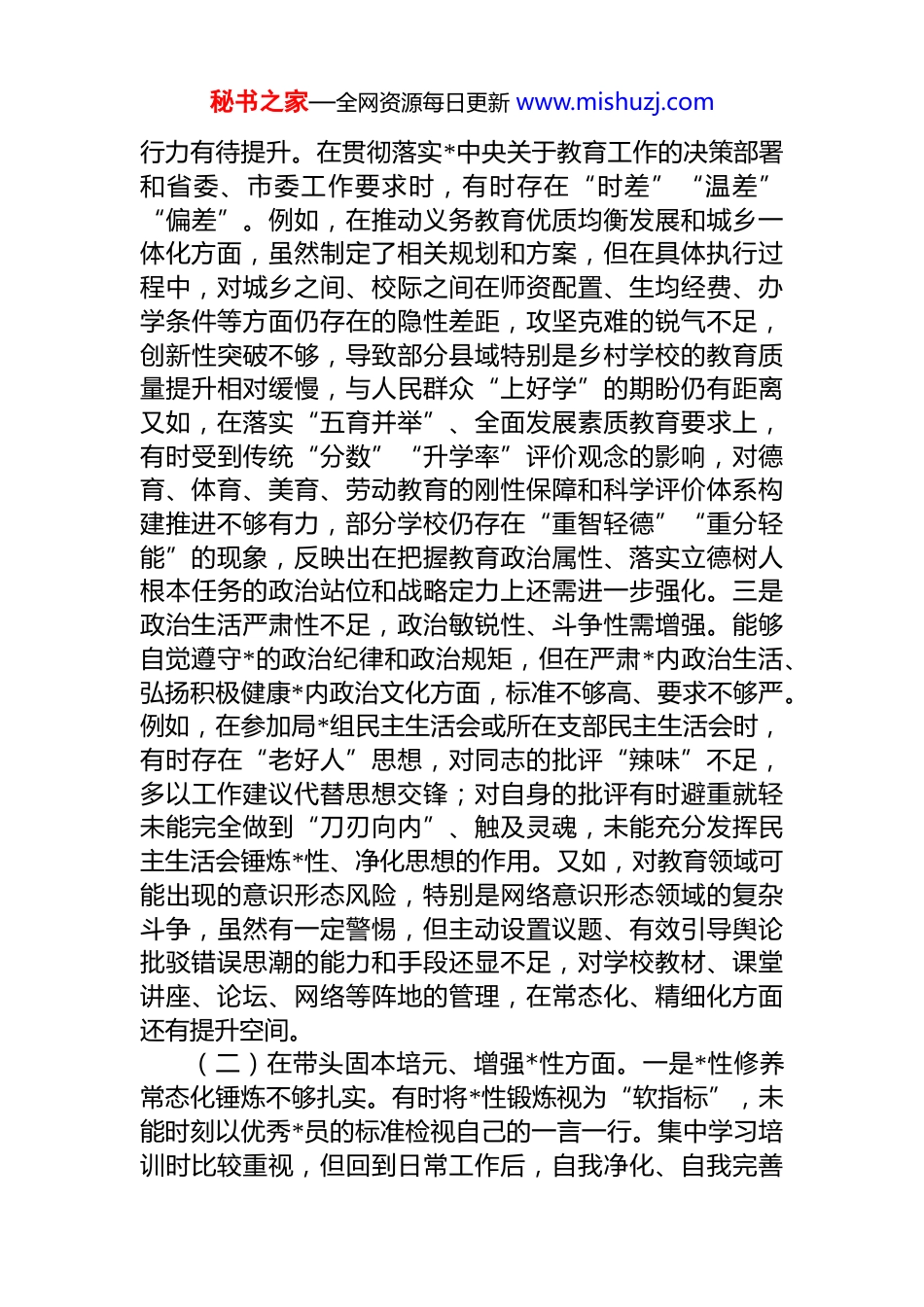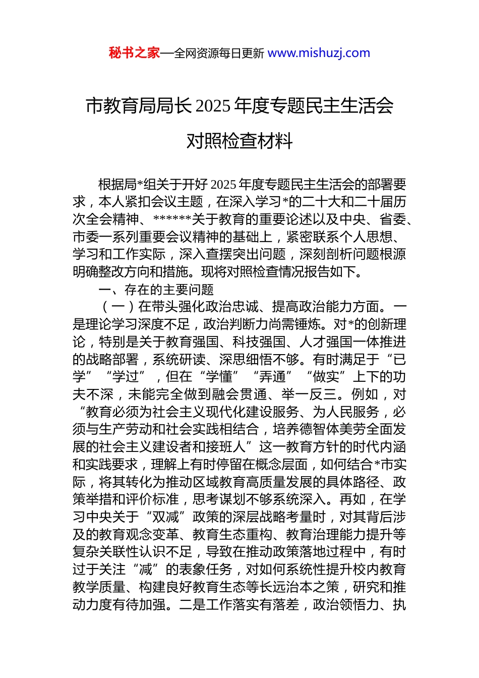 秘书之家—全网资源每日更新 www.mishuzj.com市教育局局长 2025 年度专题民主生活会对照检查材料根据局*组关于开好 2025 年度专题民主生活会的部署要求,本人紧扣会议主题,在深入学习*的二十大和二十届历次全会精神、******关于教育的重要论述以及中央、省委、市委一系列重要会议精神的基础上,紧密联系个人思想、学习和工作实际,深入查摆突出问题,深刻剖析问题根源明确整改方向和措施。现将对照检查情况报告如下。一、存在的主要问题(一)在带头强化政治忠诚、提高政治能力方面。一是理论学习深度不足,政治判断力尚需锤炼。对*的创新理论,特别是关于教育强国、科技强国、人才强国一体推进的战略部署,系统研读、深思细悟不够。有时满足于“已学”“学过”,但在“学懂”“弄通”“做实”上下的功夫不深,未能完全做到融会贯通、举一反三。例如,对“教育必须为社会主义现代化建设服务、为人民服务,必须与生产劳动和社会实践相结合,培养德智体美劳全面发展的社会主义建设者和接班人”这一教育方针的时代内涵和实践要求,理解上有时停留在概念层面,如何结合*市实际,将其转化为推动区域教育高质量发展的具体路径、政策举措和评价标准,思考谋划不够系统深入。再如,在学习中央关于“双减”政策的深层战略考量时,对其背后涉及的教育观念变革、教育生态重构、教育治理能力提升等复杂关联性认识不足,导致在推动政策落地过程中,有时过于关注“减”的表象任务,对如何系统性提升校内教育教学质量、构建良好教育生态等长远治本之策,研究和推动力度有待加强。二是工作落实有落差,政治领悟力、执秘书之家—全网资源每日更新 www.mishuzj.com行力有待提升。在贯彻落实*中央关于教育工作的决策部署和省委、市委工作要求时,有时存在“时差”“温差”“偏差”。例如,在推动义务教育优质均衡发展和城乡一体化方面,虽然制定了相关规划和方案,但在具体执行过程中,对城乡之间、校际之间在师资配置、生均经费、办学条件等方面仍存在的隐性差距,攻坚克难的锐气不足,创新性突破不够,导致部分县域特别是乡村学校的教育质量提升相对缓慢,与人民群众“上好学”的期盼仍有距离又如,在落实“五育并举”、全面发展素质教育要求上,有时受到传统“分数”“升学率”评价观念的影响,对德育、体育、美育、劳动教育的刚性保障和科学评价体系构建推进不够有力,部分学校仍存在“重智轻德”“重分轻能”的现象,反映出在把握教育政治属性、落实立德树人根本任务的政治站位和战略定力上还需进一步强化。三是政治生活严肃性不足,政治敏锐性、斗争性需增强。能够自觉遵守*的政治纪律和政治规矩,但在严肃*内政治生活、弘扬积极健康*内政治文化方面,标准不够高、要求不够严。例如,在参加局*组民主生活会或所在支部民主生活会时,有时存在“老好人”思想,对同志的批评“辣味”不足,多以工作建议代替思想交锋;对自身的批评有时避重就轻未能完全做到“刀刃向内”、触及灵魂,未能充分发挥民主生活会锤炼*性、净化思想的作用。又如,对教育领域可能出现的意识形态风险,特别是网络意识形态领域的复杂斗争,虽然有一定警惕,但主动设置议题、有效引导舆论批驳错误思潮的能力和手段还显不足,对学校教材、课堂讲座、论坛、网络等阵地的管理,在常态化、精细化方面还有提升空间。(二)在带头固本培元、增强*性方面。一是*性修养常态化锤炼不够扎实。有时将*性锻炼视为“软指标”,未能时刻以优秀*员的标准检视自己的一言一行。集中学习培训时比较重视,但回到日常工作后,自我净化、自我完善秘书之家—全网资源每日更新 www.mishuzj.com自我革新、自我提高的主动性和自觉性有所减弱。例如,在面对教育改革发展中遇到的复杂矛盾和棘手难题时,如规范民办义务教育发展、化解中小学“大班额”遗留问题教师编制动态调整等,有时会产生畏难情绪和求稳心态,攻坚克难的锐气和斗志有所消减,缺乏“逢山开路、遇水架桥”的闯劲和韧劲,这本质上是*性原则在具体实践中的体现不够充分。再如,在深入学校调研时,有时习惯于听汇报、看材料,与一线教师、学生、家长面对面、心贴心交流的时间占比不高...