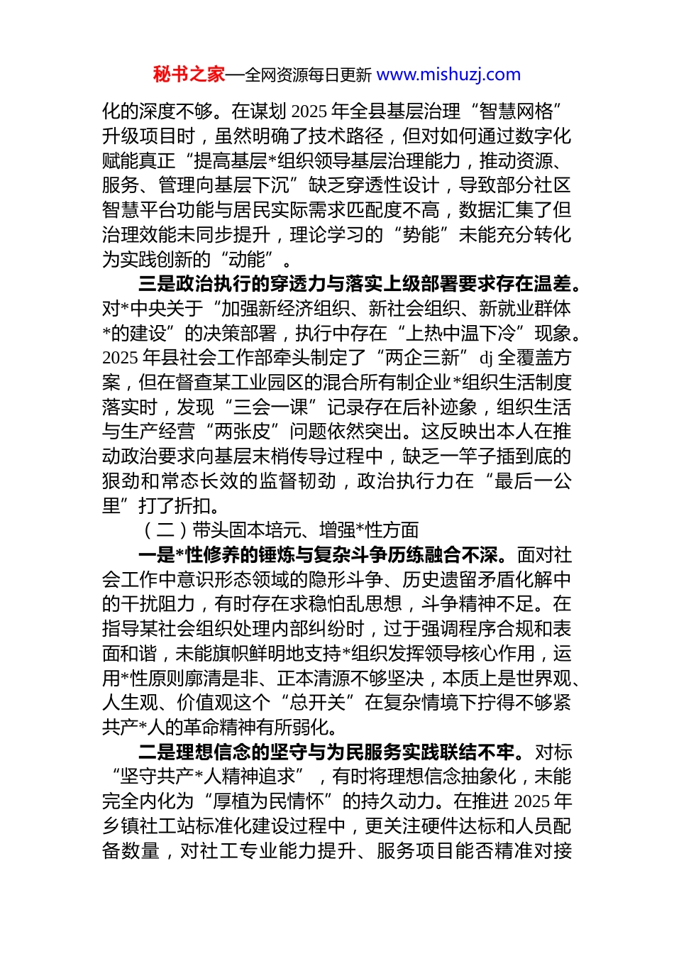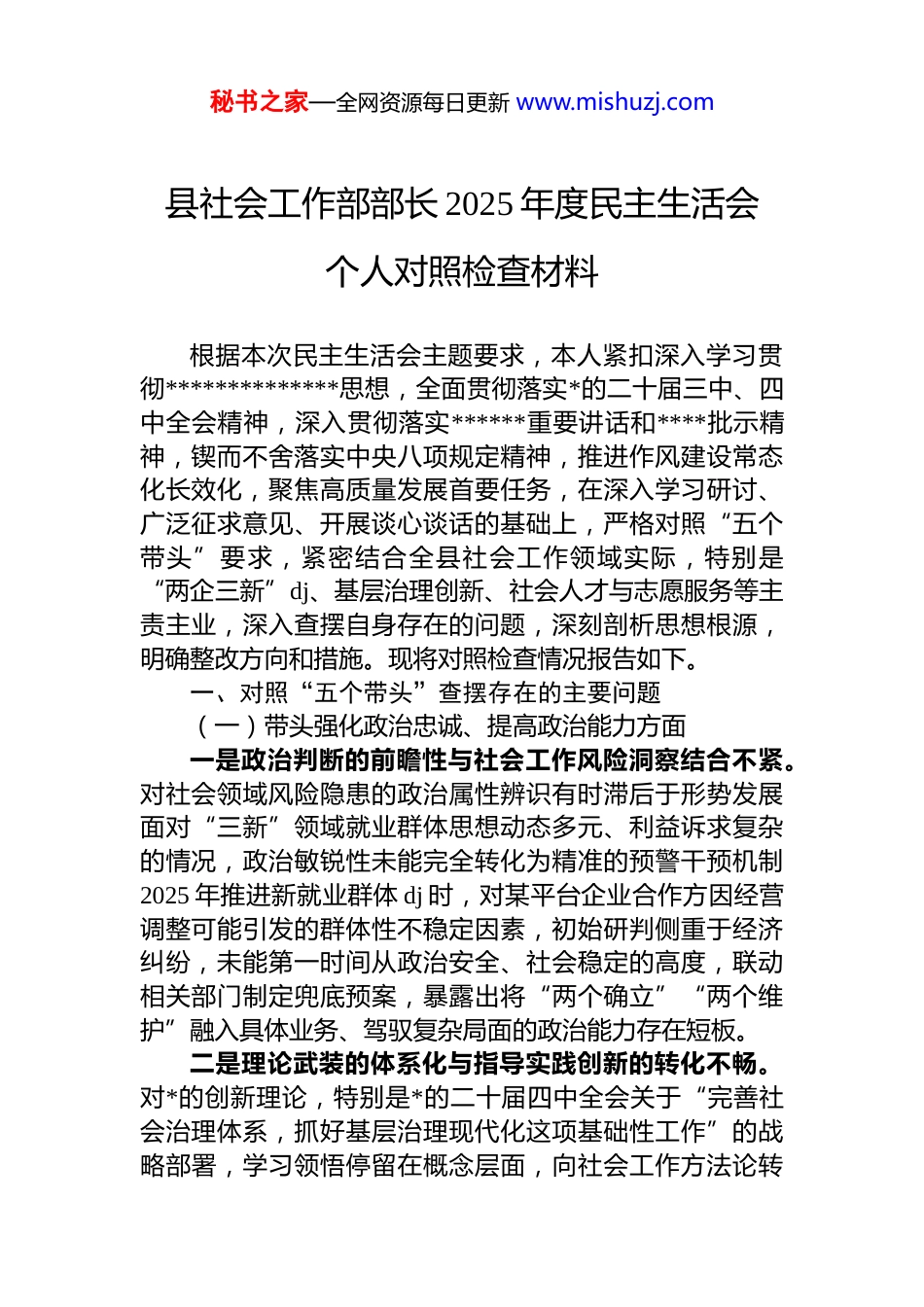 秘书之家—全网资源每日更新 www.mishuzj.com县社会工作部部长 2025 年度民主生活会个人对照检查材料根据本次民主生活会主题要求,本人紧扣深入学习贯彻**************思想,全面贯彻落实*的二十届三中、四中全会精神,深入贯彻落实******重要讲话和****批示精神,锲而不舍落实中央八项规定精神,推进作风建设常态化长效化,聚焦高质量发展首要任务,在深入学习研讨、广泛征求意见、开展谈心谈话的基础上,严格对照“五个带头”要求,紧密结合全县社会工作领域实际,特别是“两企三新”dj、基层治理创新、社会人才与志愿服务等主责主业,深入查摆自身存在的问题,深刻剖析思想根源,明确整改方向和措施。现将对照检查情况报告如下。一、对照“五个带头”查摆存在的主要问题(一)带头强化政治忠诚、提高政治能力方面一是政治判断的前瞻性与社会工作风险洞察结合不紧。对社会领域风险隐患的政治属性辨识有时滞后于形势发展面对“三新”领域就业群体思想动态多元、利益诉求复杂的情况,政治敏锐性未能完全转化为精准的预警干预机制2025 年推进新就业群体 dj 时,对某平台企业合作方因经营调整可能引发的群体性不稳定因素,初始研判侧重于经济纠纷,未能第一时间从政治安全、社会稳定的高度,联动相关部门制定兜底预案,暴露出将“两个确立”“两个维护”融入具体业务、驾驭复杂局面的政治能力存在短板。二是理论武装的体系化与指导实践创新的转化不畅。对*的创新理论,特别是*的二十届四中全会关于“完善社会治理体系,抓好基层治理现代化这项基础性工作”的战略部署,学习领悟停留在概念层面,向社会工作方法论转秘书之家—全网资源每日更新 www.mishuzj.com化的深度不够。在谋划 2025 年全县基层治理“智慧网格”升级项目时,虽然明确了技术路径,但对如何通过数字化赋能真正“提高基层*组织领导基层治理能力,推动资源、服务、管理向基层下沉”缺乏穿透性设计,导致部分社区智慧平台功能与居民实际需求匹配度不高,数据汇集了但治理效能未同步提升,理论学习的“势能”未能充分转化为实践创新的“动能”。三是政治执行的穿透力与落实上级部署要求存在温差。对*中央关于“加强新经济组织、新社会组织、新就业群体*的建设”的决策部署,执行中存在“上热中温下冷”现象。2025 年县社会工作部牵头制定了“两企三新”dj 全覆盖方案,但在督查某工业园区的混合所有制企业*组织生活制度落实时,发现“三会一课”记录存在后补迹象,组织生活与生产经营“两张皮”问题依然突出。这反映出本人在推动政治要求向基层末梢传导过程中,缺乏一竿子插到底的狠劲和常态长效的监督韧劲,政治执行力在“最后一公里”打了折扣。(二)带头固本培元、增强*性方面一是*性修养的锤炼与复杂斗争历练融合不深。面对社会工作中意识形态领域的隐形斗争、历史遗留矛盾化解中的干扰阻力,有时存在求稳怕乱思想,斗争精神不足。在指导某社会组织处理内部纠纷时,过于强调程序合规和表面和谐,未能旗帜鲜明地支持*组织发挥领导核心作用,运用*性原则廓清是非、正本清源不够坚决,本质上是世界观、人生观、价值观这个“总开关”在复杂情境下拧得不够紧共产*人的革命精神有所弱化。二是理想信念的坚守与为民服务实践联结不牢。对标“坚守共产*人精神追求”,有时将理想信念抽象化,未能完全内化为“厚植为民情怀”的持久动力。在推进 2025 年乡镇社工站标准化建设过程中,更关注硬件达标和人员配备数量,对社工专业能力提升、服务项目能否精准对接秘书之家—全网资源每日更新 www.mishuzj.com“一老一小一困”急难愁盼问题跟踪问效不严。**镇社工站反映的个案管理专业督导资源短缺问题,持续三个月未得到有效解决,说明为民服务的宗旨意识在具体工作安排和资源调度中未能时刻摆在最高位置。三是纪律规矩的敬畏与八小时外自我约束标准不高。能够严格遵守*的政治纪律和政治规矩,但在生活细节、社会交往中,用*性原则“修身律己”的标尺有时放松。对社会上的一些模糊认识、网络空间的杂音噪音,虽然能保持政治定力不予附和,但主动发声批驳、引导澄清的行动不多。在落实 2025 年深入贯彻中央八项规定...
