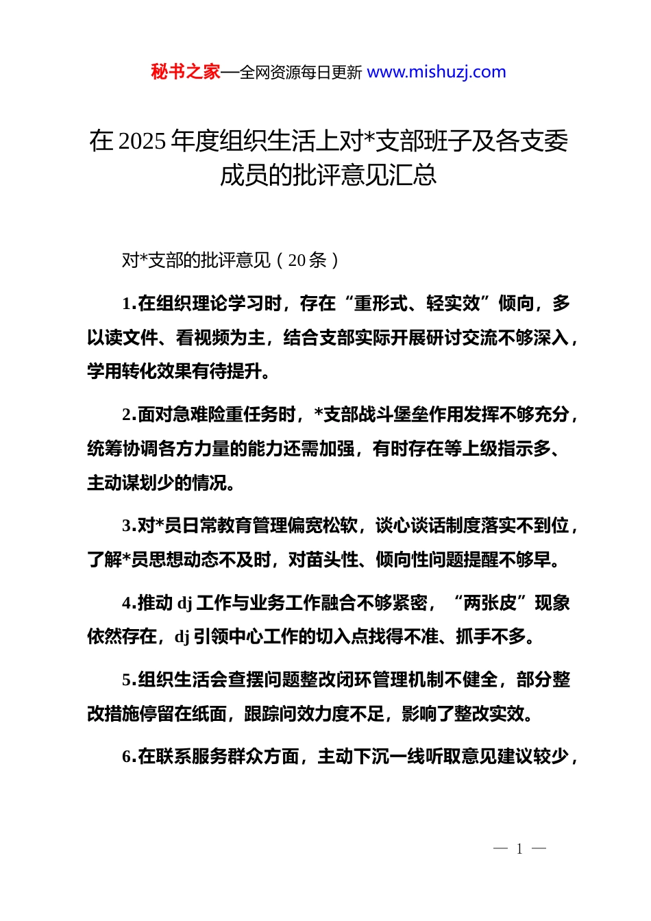 秘书之家—全网资源每日更新 www.mishuzj.com在 2025 年度组织生活上对*支部班子及各支委成员的批评意见汇总对*支部的批评意见(20 条)1.在组织理论学习时,存在“重形式、轻实效”倾向,多以读文件、看视频为主,结合支部实际开展研讨交流不够深入,学用转化效果有待提升。2.面对急难险重任务时,*支部战斗堡垒作用发挥不够充分,统筹协调各方力量的能力还需加强,有时存在等上级指示多、主动谋划少的情况。3.对*员日常教育管理偏宽松软,谈心谈话制度落实不到位,了解*员思想动态不及时,对苗头性、倾向性问题提醒不够早。4.推动 dj 工作与业务工作融合不够紧密,“两张皮”现象依然存在,dj 引领中心工作的切入点找得不准、抓手不多。5.组织生活会查摆问题整改闭环管理机制不健全,部分整改措施停留在纸面,跟踪问效力度不足,影响了整改实效。6.在联系服务群众方面,主动下沉一线听取意见建议较少,— 1 —秘书之家—全网资源每日更新 www.mishuzj.com解决群众急难愁盼问题的回应速度和办理质量有待提高。7.主题*日活动形式较为单一,创新性不足,吸引力不强,个别活动存在“打卡式”参与现象,*员参与积极性未充分调动。8.对青年*员的培养引导不够系统,压担子、搭平台做得不到位,未能有效激发年轻*员的活力和创造力。9.*支部工作计划制订有时脱离实际,目标设定过高或过低,缺乏科学评估和动态调整机制,执行中易打折扣。10.在意识形态领域风险防范上敏感性不足,对网络舆情的关注和应对能力较弱,阵地管理需进一步压实责任。11.支部委员分工协作机制运行不畅,职责边界不够清晰,个别工作出现推诿或重复交叉现象,影响整体效率。12.对流动*员、离退休*员的管理服务措施不够精准,组织覆盖和工作覆盖仍有盲区,关心关爱机制需细化落实。13.*务公开内容更新不及时,信息公开范围有限,*员知情权、参与权保障不够到位,民主氛围有待增强。14.在推动全面从严治*向纵深发展上压力传导不到位,主体责任层层递减,个别*员纪律规矩意识有所松懈。— 2 —秘书之家—全网资源每日更新 www.mishuzj.com15.应对突发事件或重大考验时,应急响应机制不够健全,预案准备不足,快速反应和处置能力有待检验和提升。16.dj 品牌创建缺乏长期规划,亮点工作持续性不强,总结提炼推广不够,示范带动效应未充分显现。17.对上级决策部署的学习传达有时滞后,理解把握不够精准,结合本单位实际制定落实方案的主动性不强。18.在推动绿色发展、节能减排等国家战略落地方面,*支部组织动员作用发挥有限,实际行动举措不多。19.对*员在八小时之外的行为监督缺位,家风建设引导不够,廉洁文化建设载体单一,警示教育震慑力不足。20.年度工作总结重成绩轻问题,自我剖析避实就虚,刀刃向内的勇气不足,未能真正起到红脸出汗、排毒治病的效果。对*支部委员会成员的批评意见(20 条)对*支部书记的批评意见21.作为“第一责任人”,在抓班子带队伍上投入精力不够均衡,对支委成员履职情况督促指导不多,传帮带作用发挥不明显。— 3 —秘书之家—全网资源每日更新 www.mishuzj.com22.工作中有时过于注重程序合规,灵活性不足,面对复杂情况决策略显保守,攻坚克难的锐气需要进一步提振。23.与普通*员面对面交流较少,听取基层声音渠道不畅,对一线实际情况掌握不够全面,导致部分决策针对性不强。24.在推动重点工作落实上,跟踪督办力度不够,存在“开头热、中间松、结尾赶”的现象,过程管控需加强。25.对自身要求标准有时不高,参加双重组织生活会偶尔因公务请假,未能始终以普通*员身份严格要求自己。对组织委员的批评意见26.发展*员工作节奏把控不严,材料审核把关不够细致,偶有返工补录情况,影响整体进度和规范性。27.*员信息台账更新不及时,数据准确性有待提高,信息化管理水平较低,难以满足动态管理需求。28.组织生活记录不完整,会议纪要撰写简略,关键环节缺失,归档资料整理不规范,不利于后期查证和总结。29.在协助书记开展谈心谈话方面主动性不强,仅限于完成规定动作,深度沟通和心理疏导能力有待提升。— 4 —秘书之家—全网资源每日更新 www.mishuzj.com30.对*小组...