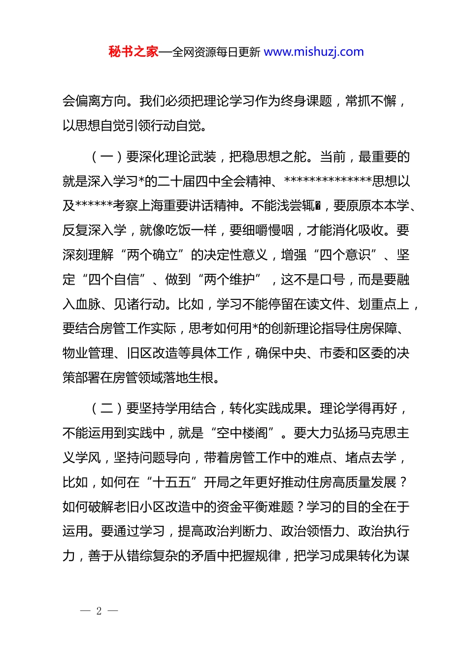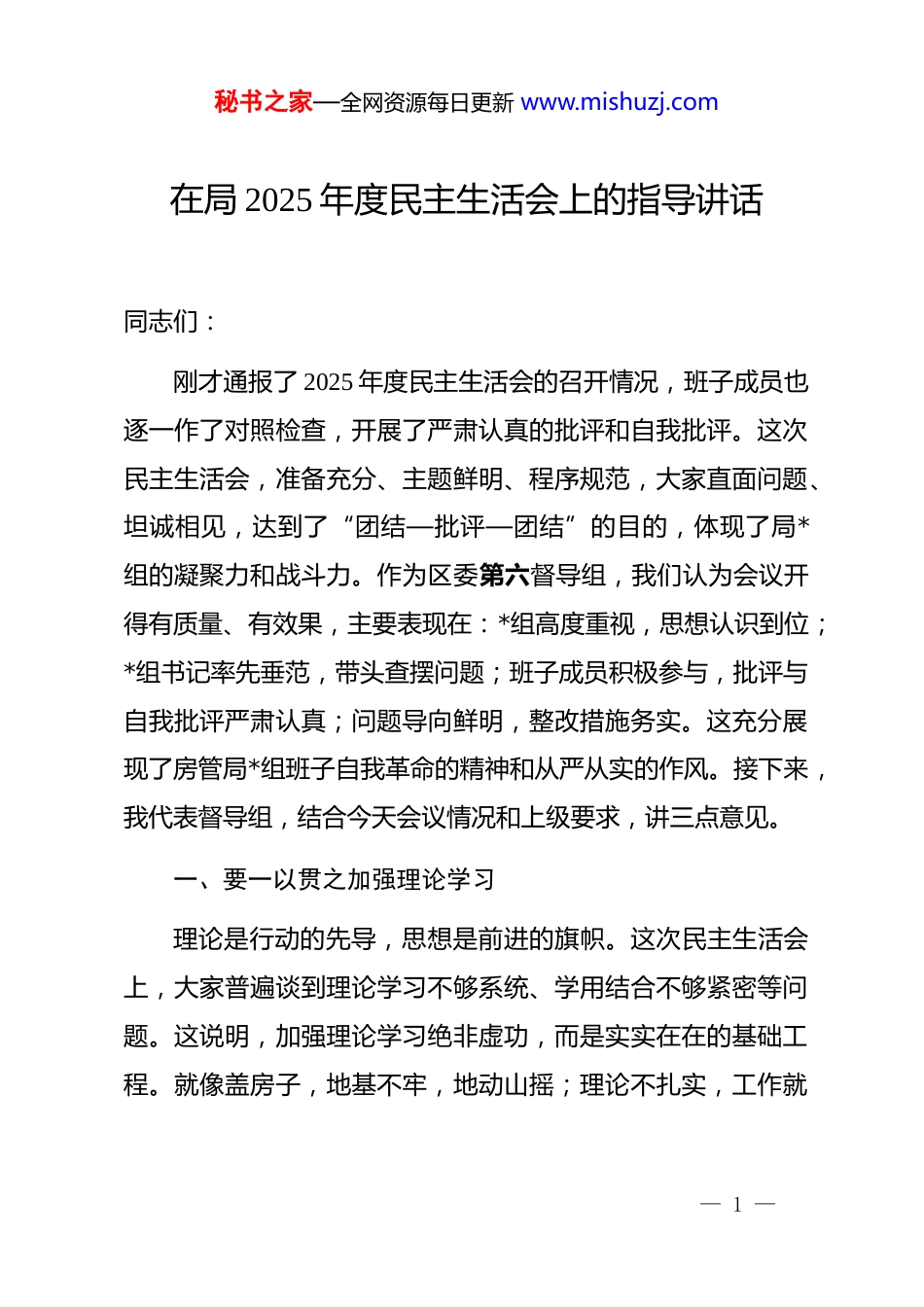 秘书之家—全网资源每日更新 www.mishuzj.com在局 2025 年度民主生活会上的指导讲话同志们:刚才通报了 2025 年度民主生活会的召开情况,班子成员也逐一作了对照检查,开展了严肃认真的批评和自我批评。这次民主生活会,准备充分、主题鲜明、程序规范,大家直面问题、坦诚相见,达到了“团结—批评—团结”的目的,体现了局*组的凝聚力和战斗力。作为区委第六督导组,我们认为会议开得有质量、有效果,主要表现在:*组高度重视,思想认识到位;*组书记率先垂范,带头查摆问题;班子成员积极参与,批评与自我批评严肃认真;问题导向鲜明,整改措施务实。这充分展现了房管局*组班子自我革命的精神和从严从实的作风。接下来,我代表督导组,结合今天会议情况和上级要求,讲三点意见。一、要一以贯之加强理论学习理论是行动的先导,思想是前进的旗帜。这次民主生活会上,大家普遍谈到理论学习不够系统、学用结合不够紧密等问题。这说明,加强理论学习绝非虚功,而是实实在在的基础工程。就像盖房子,地基不牢,地动山摇;理论不扎实,工作就— 1 —秘书之家—全网资源每日更新 www.mishuzj.com会偏离方向。我们必须把理论学习作为终身课题,常抓不懈,以思想自觉引领行动自觉。(一)要深化理论武装,把稳思想之舵。当前,最重要的就是深入学习*的二十届四中全会精神、**************思想以及******考察上海重要讲话精神。不能浅尝辄 ,要原原本本学�、反复深入学,就像吃饭一样,要细嚼慢咽,才能消化吸收。要深刻理解“两个确立”的决定性意义,增强“四个意识”、坚定“四个自信”、做到“两个维护”,这不是口号,而是要融入血脉、见诸行动。比如,学习不能停留在读文件、划重点上,要结合房管工作实际,思考如何用*的创新理论指导住房保障、物业管理、旧区改造等具体工作,确保中央、市委和区委的决策部署在房管领域落地生根。(二)要坚持学用结合,转化实践成果。理论学得再好,不能运用到实践中,就是“空中楼阁”。要大力弘扬马克思主义学风,坚持问题导向,带着房管工作中的难点、堵点去学,比如,如何在“十五五”开局之年更好推动住房高质量发展?如何破解老旧小区改造中的资金平衡难题?学习的目的全在于运用。要通过学习,提高政治判断力、政治领悟力、政治执行力,善于从错综复杂的矛盾中把握规律,把学习成果转化为谋— 2 —秘书之家—全网资源每日更新 www.mishuzj.com划工作的思路、推动发展的举措、服务群众的本领。就像医生看病,理论是医理,实践是临床,二者结合才能药到病除。(三)要健全学习机制,确保常态长效。理论学习不能“三天打鱼,两天晒网”,要形成制度化、常态化的安排。局*组要带头落实“第一议题”制度,中心组学习要更加注重质量,不能流于形式。可以探索“主题联学”“案例研学”等方式,让学习活起来、实起来。同时,要建立学习效果评估机制,看学了之后思路有没有打开、问题有没有解决、工作有没有提升,避免“学用两张皮”。就像体育锻炼,只有坚持经常,才能强身健体;理论学习也一样,贵在坚持,成在持久。二、要一抓到底紧盯突出问题问题是时代的声音,整改是民主生活会的生命线。这次会议查摆出的问题,无论是班子还是个人的,都很有针对性,比如推动住房事业发展动能转化不够快、民生福祉改善与群众期盼还有差距等。找到问题是第一步,解决问题才是关键。我们要有“钉钉子”精神,一锤接着一锤敲,直到问题彻底解决。(一)要精准查摆问题,深挖根源。问题找得准不准,直接关系到整改效果。不能满足于表象,要透过现象看本质,多— 3 —秘书之家—全网资源每日更新 www.mishuzj.com问几个“为什么”。比如,为什么有些工作推进缓慢?是体制机制障碍,还是干部能力不足?要结合巡视巡察反馈、审计发现、群众反映强烈的问题,进行系统梳理,把病灶找准,把根源挖深。就像中医看病,要望闻问切,找到病根,才能对症下药。班子成员要带头把自己摆进去、把职责摆进去、把工作摆进去,敢于触碰深层次矛盾和问题。(二)要狠抓整改落实,务求实效。整改不能“雷声大、雨点小”,要制定详细的整改方案,明确时间表、路线图、责...