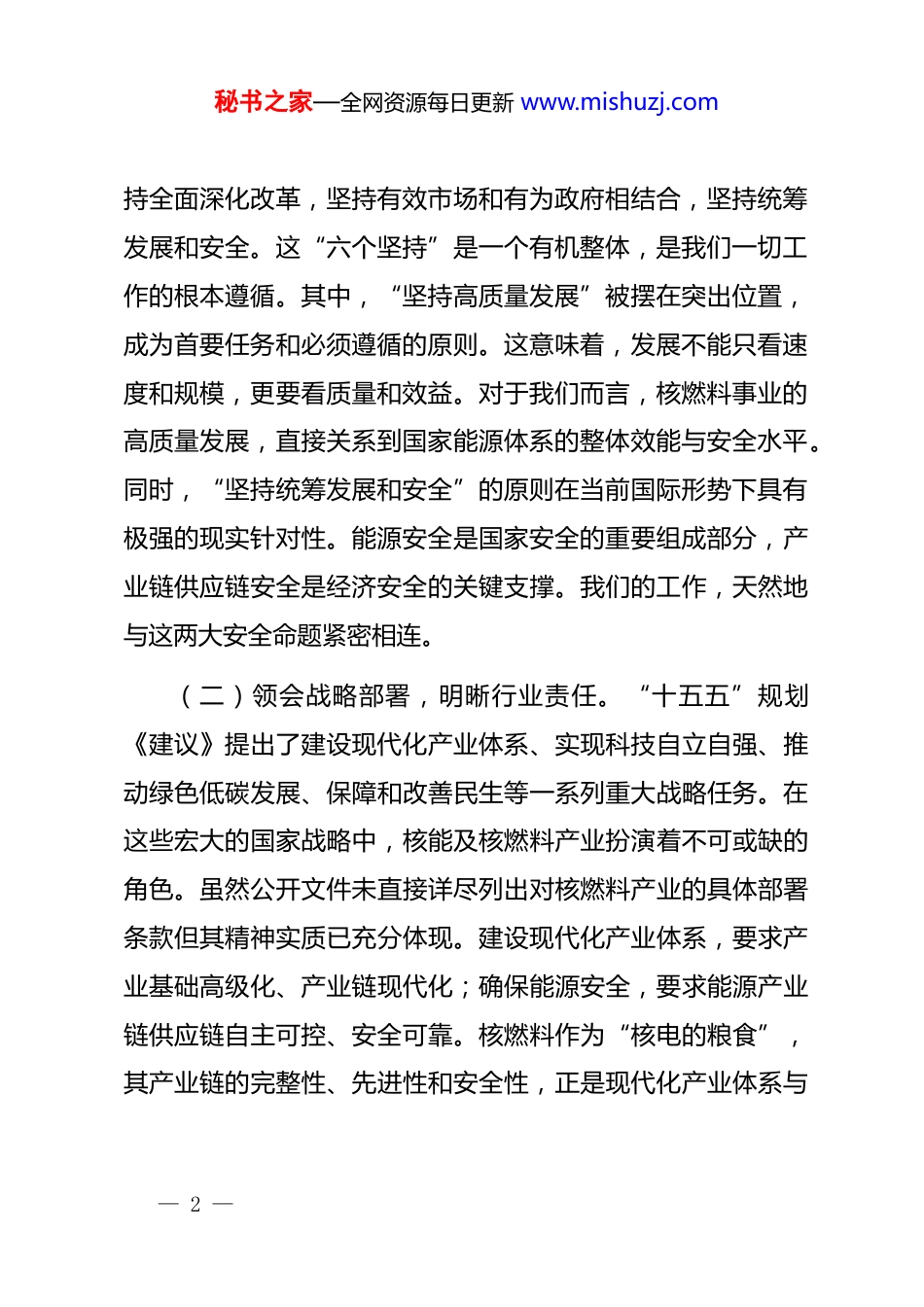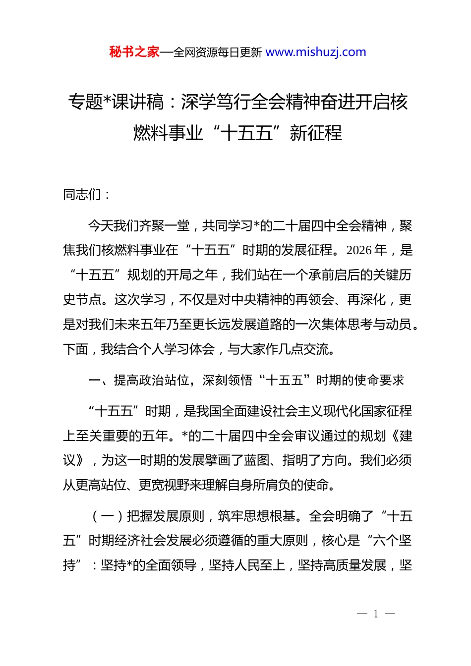 秘书之家—全网资源每日更新 www.mishuzj.com专题*课讲稿:深学笃行全会精神奋进开启核燃料事业“十五五”新征程同志们:今天我们齐聚一堂,共同学习*的二十届四中全会精神,聚焦我们核燃料事业在“十五五”时期的发展征程。2026 年,是“十五五”规划的开局之年,我们站在一个承前启后的关键历史节点。这次学习,不仅是对中央精神的再领会、再深化,更是对我们未来五年乃至更长远发展道路的一次集体思考与动员。下面,我结合个人学习体会,与大家作几点交流。一、提高政治站位,深刻领悟“十五五”时期的使命要求“十五五”时期,是我国全面建设社会主义现代化国家征程上至关重要的五年。*的二十届四中全会审议通过的规划《建议》,为这一时期的发展擘画了蓝图、指明了方向。我们必须从更高站位、更宽视野来理解自身所肩负的使命。(一)把握发展原则,筑牢思想根基。全会明确了“十五五”时期经济社会发展必须遵循的重大原则,核心是“六个坚持”:坚持*的全面领导,坚持人民至上,坚持高质量发展,坚— 1 —秘书之家—全网资源每日更新 www.mishuzj.com持全面深化改革,坚持有效市场和有为政府相结合,坚持统筹发展和安全。这“六个坚持”是一个有机整体,是我们一切工作的根本遵循。其中,“坚持高质量发展”被摆在突出位置,成为首要任务和必须遵循的原则。这意味着,发展不能只看速度和规模,更要看质量和效益。对于我们而言,核燃料事业的高质量发展,直接关系到国家能源体系的整体效能与安全水平。同时,“坚持统筹发展和安全”的原则在当前国际形势下具有极强的现实针对性。能源安全是国家安全的重要组成部分,产业链供应链安全是经济安全的关键支撑。我们的工作,天然地与这两大安全命题紧密相连。(二)领会战略部署,明晰行业责任。“十五五”规划《建议》提出了建设现代化产业体系、实现科技自立自强、推动绿色低碳发展、保障和改善民生等一系列重大战略任务。在这些宏大的国家战略中,核能及核燃料产业扮演着不可或缺的角色。虽然公开文件未直接详尽列出对核燃料产业的具体部署条款但其精神实质已充分体现。建设现代化产业体系,要求产业基础高级化、产业链现代化;确保能源安全,要求能源产业链供应链自主可控、安全可靠。核燃料作为“核电的粮食”,其产业链的完整性、先进性和安全性,正是现代化产业体系与— 2 —秘书之家—全网资源每日更新 www.mishuzj.com能源安全基石的关键一环。有分析指出,核燃料产业是国家军民融合的战略性高科技产业,其产业链的安全可靠是产业体系现代化的重要内涵。因此,深刻领会国家战略,就是要将我们**公司的“十五五”规划,置于国家能源安全和现代化产业体系建设的大局中去审视、去定位、去推进。我们的每一项技术进步、每一次资源拓展、每一份产品保障,都是在为夯实国家安全基础、壮大实体经济根基贡献力量。(三)认清严峻形势,强化忧患意识。进入“十五五”时期,我们面临的外部环境并非坦途。聚焦核燃料供应链,其固有的高度复杂性和集中性带来了显著风险。全球铀矿开采、转化、浓缩等关键环节市场集中度高,地缘政治动荡极易引发供应链中断。2026 年,行业报告预测可能面临结构性的铀供应缺口,进一步加剧供应链紧张。国际原子能机构也计划在 2026 年召开专题会议,探讨核燃料供应链的可持续发展与挑战,这本身就反映了全球对该领域脆弱性的共同关切。这种形势下,国家强调提升产业链供应链韧性和安全水平,对我们而言不是抽象要求,而是迫在眉睫的实战任务。我们能否保障核燃料供应的稳定、可靠、经济,直接关系到我国核电机组能否安全稳定运行,关系到国家能源结构调整战略能否顺利实施。这份沉甸— 3 —秘书之家—全网资源每日更新 www.mishuzj.com甸的责任,容不得我们有丝毫懈怠。二、锚定发展目标,全力以赴完成“十五五”重大任务基于对国家使命和行业形势的深刻认识,我们**公司在“十五五”规划中确立了清晰的发展目标。这些目标并非空中楼阁,而是需要一步一个脚印、攻坚克难去实现的现实任务。(一)聚焦主责主业,实现保障能力新跨越。我们所有工作的核心,归根结底是履行好核燃料保障这一根...