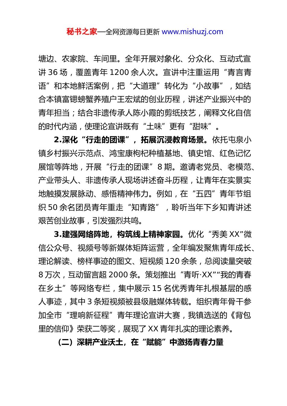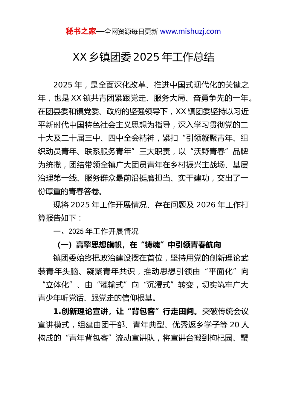 秘书之家—全网资源每日更新 www.mishuzj.comXX 乡镇团委 2025 年工作总结2025 年,是全面深化改革、推进中国式现代化的关键之年,也是 XX 镇共青团紧跟党走、服务大局、奋勇争先的一年。在团县委和镇党委、政府的坚强领导下,XX 镇团委坚持以习近平新时代中国特色社会主义思想为指导,深入学习贯彻党的二十大及二十届三中、四中全会精神,紧扣“引领凝聚青年、组织动员青年、联系服务青年”三大职责,以“沃野青春”品牌为统揽,团结带领全镇广大团员青年在乡村振兴主战场、基层治理第一线、服务群众最前沿挺膺担当、实干建功,交出了一份厚重的青春答卷。现将 2025 年工作开展情况、存在问题及 2026 年工作打算报告如下:一、2025 年工作开展情况(一)高擎思想旗帜,在“铸魂”中引领青春航向镇团委始终把政治建设摆在首位,坚持用党的创新理论武装青年头脑、凝聚青年共识,推动思想引领由“平面化”向“立体化”、由“灌输式”向“沉浸式”转变,切实筑牢广大青少年听党话、跟党走的信仰根基。1.创新理论宣讲,让“背包客”行走田间。突破传统会议宣讲模式,组建由团干部、青年典型、优秀返乡学子等 20 人构成的“青年背包客”流动宣讲队,将宣讲台搬到枸杞园、蟹秘书之家—全网资源每日更新 www.mishuzj.com塘边、农家院、车间里。全年开展对象化、分众化、互动式宣讲 36 场,覆盖青年 1200 余人次。宣讲中注重运用“青言青语”和本地鲜活案例,把“大道理”转化为“小故事”,如结合本镇富锶螃蟹养殖户王宏斌的创业历程,讲述产业振兴中的青年担当;结合非遗传承人陈小霞的剪纸技艺,阐释文化自信的时代内涵,使理论宣讲既有“土味”更有“甜味”。2.深化“行走的团课”,拓展沉浸教育场景。依托屯泉小镇乡村振兴示范点、鸿宝康枸杞种植基地、镇史馆、红色记忆展馆等阵地,开展“行走的团课”8 期。邀请老党员、老模范、产业带头人、非遗传承人现场讲述奋斗历程,让青年在实景实地触摸发展脉动、感悟精神伟力。例如,在“五四”青年节组织 50 余名团员青年重走“知青路”,聆听当年下乡知青讲述艰苦创业故事,引发强烈共鸣。3.建强网络阵地,构筑线上精神家园。优化“秀美 XX”微信公众号、视频号等新媒体矩阵运营,全年编发聚焦青年成长、理论解读、榜样事迹的图文、短视频 120 余条,总阅读量突破8 万次,互动留言超 2000 条。策划推出“青听·XX”“我的青春在乡土”等网络专栏,集中展示 15 名优秀青年扎根基层的感人事迹,其中 3 条短视频被县级融媒体转载。组织青年骨干参加全市“理响新征程”青年理论宣讲大赛,我镇选送的《背包里的信仰》荣获二等奖,展现了 XX 青年扎实的理论素养。(二)深耕产业沃土,在“赋能”中激扬青春力量秘书之家—全网资源每日更新 www.mishuzj.com紧扣高质量发展首要任务,镇团委主动融入全镇“一核两带三园”产业布局,以“青春助农”行动为抓手,推动青年人才、技术、资源向产业链集聚,把论文写在田野大地上。1.精准扶持青年产业带头人。系统摸排本土“特”“优”农业产业,重点围绕富锶螃蟹、南美白对虾、鸿宝康枸杞、设施蔬菜等特色板块,建立青年产业人才库,入库青年创业者、合作社负责人、家庭农场主 43 人。联合镇农业农村综合服务中心、科协,开展水产养殖、电商运营、品牌营销等专题培训6 期,邀请省农科院专家现场把脉问诊。全年新培育青年产业带头人 12 名,其中王宏斌的“蟹公寓”养殖模式获评县级青年创新创业示范项目,带动周边 30 余户农户发展生态养殖。2.提质升级“青年直播间”。投入专项资金对镇电商服务中心“青年直播间”进行硬件升级,配置补光灯、提词器、多机位切换设备,打造专业化直播场景。组建由 10 名机关青年、返乡大学生、本土网红构成的“青耘 XX”助农主播团,围绕蟹肥膏黄、杞红采摘、时令果蔬等节点,策划“蟹逅 XX”“杞福万家”等主题直播 23 场,累计销售额突破 80 万元。创新“团支部+青年互助小组+创业带头人”联动孵化模式,培育本土电商运营、短视频剪辑、网店客服等青年人才 36 名,间接带动灵活就业 460 人,成功助力“XX 乡品...