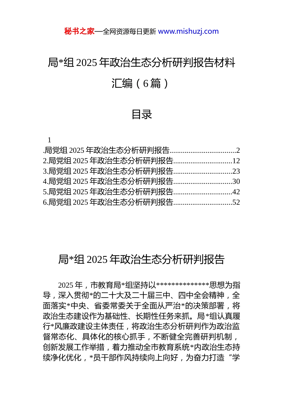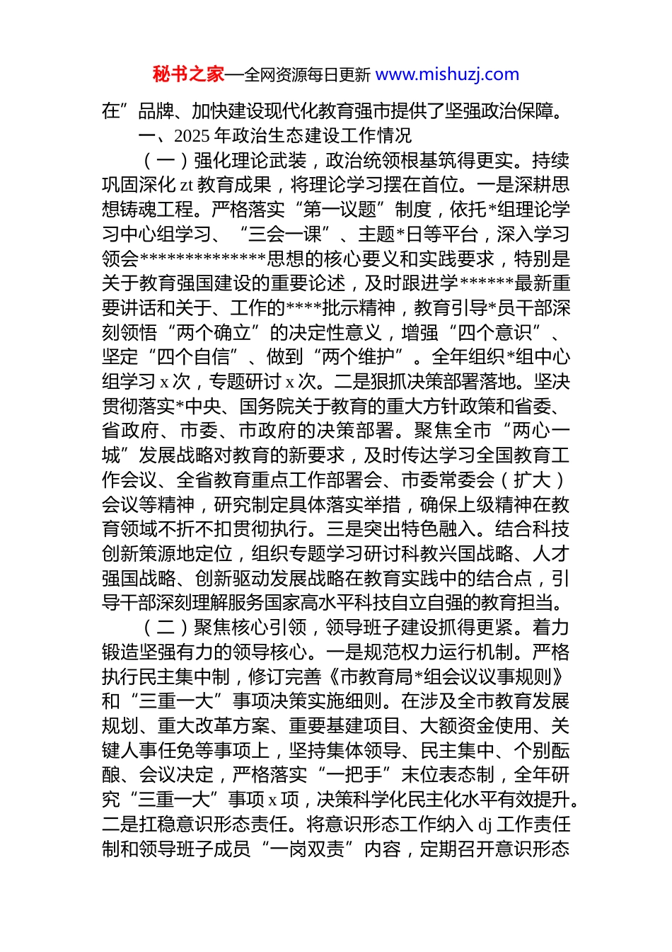 秘书之家—全网资源每日更新 www.mishuzj.com局*组 2025 年政治生态分析研判报告材料汇编(6 篇)目录1.局党组 2025 年政治生态分析研判报告...................................22.局党组 2025 年政治生态分析研判报告...............................123.局党组 2025 年政治生态分析研判报告...............................234.局党组 2025 年政治生态分析研判报告...............................305.局党组 2025 年政治生态分析研判报告...............................426.局党组 2025 年政治生态分析研判报告...............................52局*组 2025 年政治生态分析研判报告2025 年,市教育局*组坚持以**************思想为指导,深入贯彻*的二十大及二十届三中、四中全会精神,全面落实*中央、省委常委关于全面从严治*的决策部署,将政治生态建设作为基础性、长期性任务来抓。局*组认真履行*风廉政建设主体责任,将政治生态分析研判作为政治监督常态化、具体化的核心抓手,不断健全完善研判机制,创新发展工作举措,着力推动全市教育系统*内政治生态持续净化优化,*员干部作风持续向上向好,为奋力打造“学秘书之家—全网资源每日更新 www.mishuzj.com在”品牌、加快建设现代化教育强市提供了坚强政治保障。一、2025 年政治生态建设工作情况(一)强化理论武装,政治统领根基筑得更实。持续巩固深化 zt 教育成果,将理论学习摆在首位。一是深耕思想铸魂工程。严格落实“第一议题”制度,依托*组理论学习中心组学习、“三会一课”、主题*日等平台,深入学习领会**************思想的核心要义和实践要求,特别是关于教育强国建设的重要论述,及时跟进学******最新重要讲话和关于、工作的****批示精神,教育引导*员干部深刻领悟“两个确立”的决定性意义,增强“四个意识”、坚定“四个自信”、做到“两个维护”。全年组织*组中心组学习 x 次,专题研讨 x 次。二是狠抓决策部署落地。坚决贯彻落实*中央、国务院关于教育的重大方针政策和省委、省政府、市委、市政府的决策部署。聚焦全市“两心一城”发展战略对教育的新要求,及时传达学习全国教育工作会议、全省教育重点工作部署会、市委常委会(扩大)会议等精神,研究制定具体落实举措,确保上级精神在教育领域不折不扣贯彻执行。三是突出特色融入。结合科技创新策源地定位,组织专题学习研讨科教兴国战略、人才强国战略、创新驱动发展战略在教育实践中的结合点,引导干部深刻理解服务国家高水平科技自立自强的教育担当。(二)聚焦核心引领,领导班子建设抓得更紧。着力锻造坚强有力的领导核心。一是规范权力运行机制。严格执行民主集中制,修订完善《市教育局*组会议议事规则》和“三重一大”事项决策实施细则。在涉及全市教育发展规划、重大改革方案、重要基建项目、大额资金使用、关键人事任免等事项上,坚持集体领导、民主集中、个别酝酿、会议决定,严格落实“一把手”末位表态制,全年研究“三重一大”事项 x 项,决策科学化民主化水平有效提升。二是扛稳意识形态责任。将意识形态工作纳入 dj 工作责任制和领导班子成员“一岗双责”内容,定期召开意识形态秘书之家—全网资源每日更新 www.mishuzj.com专题会议分析研判形势。高度关注教育领域意识形态风险点,加强对教材、课堂、讲座、网络平台的管理。依托教育云平台、官方新媒体矩阵,大力宣传*的教育方针和教育改革发展成就,讲好教育故事,筑牢意识形态安全防线。三是筑牢基层战斗堡垒。制定实施《2025 年市教育系统 dj工作要点》,扎实推进基层*组织标准化规范化建设。顺利完成直属学校(单位)*支部换届工作。深化“dj+”融合模式,围绕“学在”核心任务,创新开展“一支部一品牌”创建活动,推动 dj 工作与教育教学、教研科研、管理服务深度融合,提升*组织政治功能和组织功能。(三)压实主体责任,管*治*担当扛得更牢。坚定不移推进全面从严治*向纵深发展。一是责任链条拧紧压实。年初召开全市教育系统全面从严治*工作会议,制定印发《2025 年市教育局全面从严治*主体责任清单及任务安排》《*风廉政建设和反腐败...
