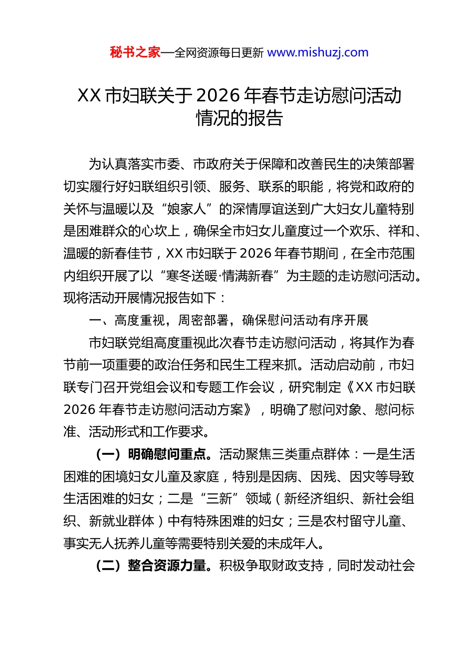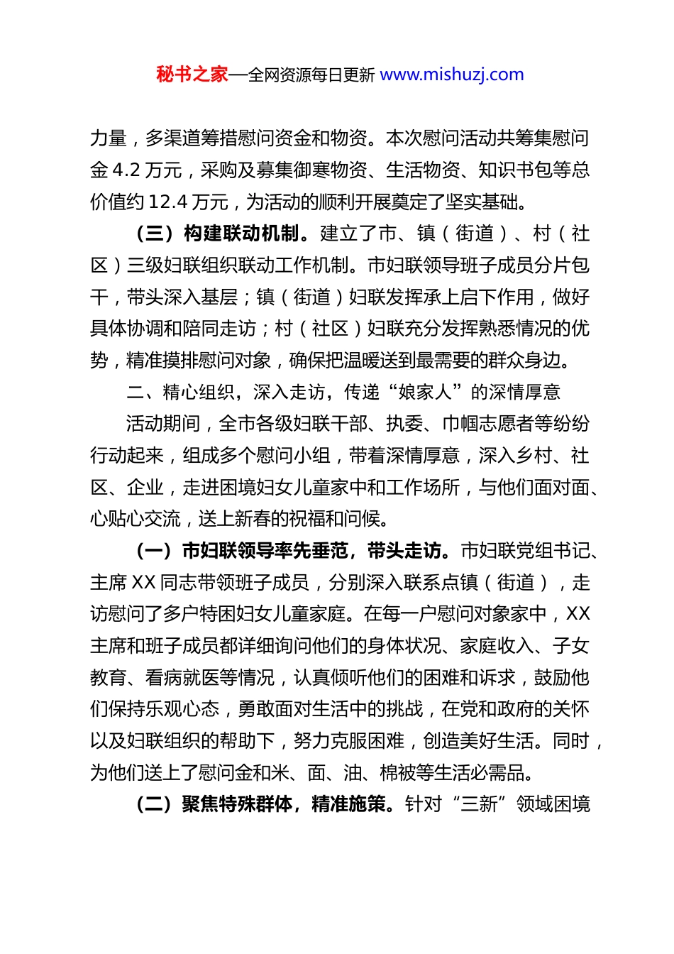 秘书之家—全网资源每日更新 www.mishuzj.comXX 市妇联关于 2026 年春节走访慰问活动情况的报告为认真落实市委、市政府关于保障和改善民生的决策部署切实履行好妇联组织引领、服务、联系的职能,将党和政府的关怀与温暖以及“娘家人”的深情厚谊送到广大妇女儿童特别是困难群众的心坎上,确保全市妇女儿童度过一个欢乐、祥和、温暖的新春佳节,XX 市妇联于 2026 年春节期间,在全市范围内组织开展了以“寒冬送暖·情满新春”为主题的走访慰问活动。现将活动开展情况报告如下:一、高度重视,周密部署,确保慰问活动有序开展市妇联党组高度重视此次春节走访慰问活动,将其作为春节前一项重要的政治任务和民生工程来抓。活动启动前,市妇联专门召开党组会议和专题工作会议,研究制定《XX 市妇联2026 年春节走访慰问活动方案》,明确了慰问对象、慰问标准、活动形式和工作要求。(一)明确慰问重点。活动聚焦三类重点群体:一是生活困难的困境妇女儿童及家庭,特别是因病、因残、因灾等导致生活困难的妇女;二是“三新”领域(新经济组织、新社会组织、新就业群体)中有特殊困难的妇女;三是农村留守儿童、事实无人抚养儿童等需要特别关爱的未成年人。(二)整合资源力量。积极争取财政支持,同时发动社会秘书之家—全网资源每日更新 www.mishuzj.com力量,多渠道筹措慰问资金和物资。本次慰问活动共筹集慰问金 4.2 万元,采购及募集御寒物资、生活物资、知识书包等总价值约 12.4 万元,为活动的顺利开展奠定了坚实基础。(三)构建联动机制。建立了市、镇(街道)、村(社区)三级妇联组织联动工作机制。市妇联领导班子成员分片包干,带头深入基层;镇(街道)妇联发挥承上启下作用,做好具体协调和陪同走访;村(社区)妇联充分发挥熟悉情况的优势,精准摸排慰问对象,确保把温暖送到最需要的群众身边。二、精心组织,深入走访,传递“娘家人”的深情厚意活动期间,全市各级妇联干部、执委、巾帼志愿者等纷纷行动起来,组成多个慰问小组,带着深情厚意,深入乡村、社区、企业,走进困境妇女儿童家中和工作场所,与他们面对面、心贴心交流,送上新春的祝福和问候。(一)市妇联领导率先垂范,带头走访。市妇联党组书记、主席 XX 同志带领班子成员,分别深入联系点镇(街道),走访慰问了多户特困妇女儿童家庭。在每一户慰问对象家中,XX主席和班子成员都详细询问他们的身体状况、家庭收入、子女教育、看病就医等情况,认真倾听他们的困难和诉求,鼓励他们保持乐观心态,勇敢面对生活中的挑战,在党和政府的关怀以及妇联组织的帮助下,努力克服困难,创造美好生活。同时,为他们送上了慰问金和米、面、油、棉被等生活必需品。(二)聚焦特殊群体,精准施策。针对“三新”领域困境秘书之家—全网资源每日更新 www.mishuzj.com妇女,慰问组深入部分企业、家政公司等,看望慰问了坚守岗位但生活困难的女职工,了解她们的工作环境和权益保障情况,为她们送去生活物资,感谢她们为城市发展作出的贡献,并叮嘱她们注意防寒保暖和安全生产。针对留守儿童群体,市妇联联合相关部门和社会组织,不仅送去了御寒棉衣、棉鞋等物资共计 120 余套,还精心挑选了涵盖科普、文学、心理健康等方面的知识书包 30 个,发放到孩子们手中,鼓励他们好好学习,健康成长,用知识改变命运。同时,还特别关注孩子们的心理健康,嘱咐监护人和基层妇联干部多加关心引导。(三)三级妇联联动,实现关爱全覆盖。在市级妇联的带动下,各镇(街道)、村(社区)妇联迅速响应,结合实际开展了形式多样的慰问活动。她们深入到田间地头、居民楼栋,对辖区内登记在册的困境妇女儿童家庭进行走访,确保“不少一户、不落一人”。走访过程中,基层妇联干部不仅送去了物资,还积极宣传党和政府的惠民政策、妇女儿童权益保障相关法律法规,以及冬季用火用电安全知识,实现了物质帮扶与精神关爱、政策宣传的有机结合。三、成效显著,反响热烈,凝聚巾帼奋进力量此次春节走访慰问活动,全市妇联系统累计走访慰问困境妇女儿童及家庭 100 余户,覆盖人数超过 300 人,发放慰问金4.2 万元,各类慰问物资价...