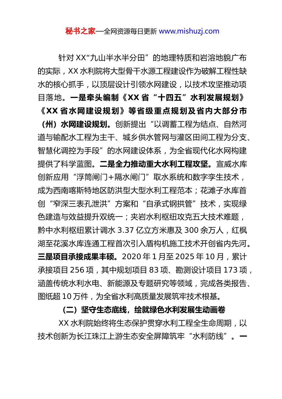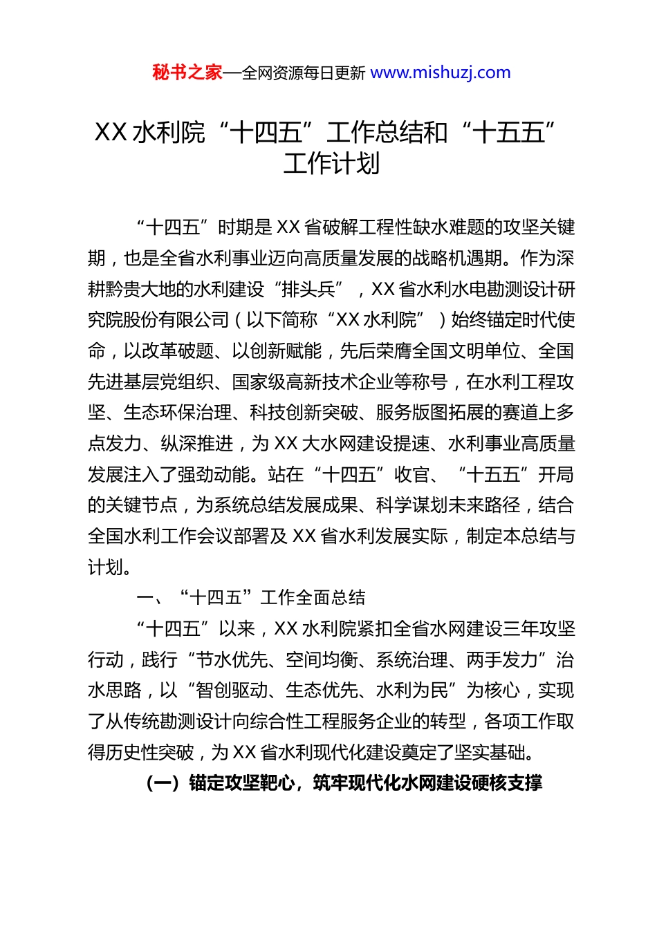 秘书之家—全网资源每日更新 www.mishuzj.comXX 水利院“十四五”工作总结和“十五五”工作计划“十四五”时期是 XX 省破解工程性缺水难题的攻坚关键期,也是全省水利事业迈向高质量发展的战略机遇期。作为深耕黔贵大地的水利建设“排头兵”,XX 省水利水电勘测设计研究院股份有限公司(以下简称“XX 水利院”)始终锚定时代使命,以改革破题、以创新赋能,先后荣膺全国文明单位、全国先进基层党组织、国家级高新技术企业等称号,在水利工程攻坚、生态环保治理、科技创新突破、服务版图拓展的赛道上多点发力、纵深推进,为 XX 大水网建设提速、水利事业高质量发展注入了强劲动能。站在“十四五”收官、“十五五”开局的关键节点,为系统总结发展成果、科学谋划未来路径,结合全国水利工作会议部署及 XX 省水利发展实际,制定本总结与计划。一、“十四五”工作全面总结“十四五”以来,XX 水利院紧扣全省水网建设三年攻坚行动,践行“节水优先、空间均衡、系统治理、两手发力”治水思路,以“智创驱动、生态优先、水利为民”为核心,实现了从传统勘测设计向综合性工程服务企业的转型,各项工作取得历史性突破,为 XX 省水利现代化建设奠定了坚实基础。(一)锚定攻坚靶心,筑牢现代化水网建设硬核支撑秘书之家—全网资源每日更新 www.mishuzj.com针对 XX“九山半水半分田”的地理特质和岩溶地貌广布的实际,XX 水利院将大型骨干水源工程建设作为破解工程性缺水的核心抓手,以顶层设计引领水网建设,以技术攻坚推动项目落地。一是牵头编制《XX 省“十四五”水利发展规划》《XX 省水网建设规划》等省级重点规划及省内大部分市(州)水网建设规划。创新提出“以调蓄工程为结点、自然河道与输配水工程为主干、城乡供水管网与灌区田间工程为分支、智慧化调控为手段”的水网建设体系,为全省现代化水网构建提供了科学蓝图。二是全力推动重大水利工程攻坚。宣威水库创新应用“浮筒闸门+隔水闸门”取水系统和数字孪生技术,成为西南喀斯特地区防洪型大型水利工程范本;花滩子水库首创“窄深三表孔泄洪”方案和“自承式钢拱管”技术,实现绿色建造与效益提升双统一;夹岩水利枢纽攻克五大技术难题,黔中水利枢纽累计调水 3.37 亿立方米惠及 300 余万人,红枫湖至花溪水库连通工程首次引入盾构机施工技术开创省内先河。三是项目承接成果丰硕。2020 年 1 月至 2025 年 10 月,累计承接项目 256 项,其中规划项目 83 项、勘测设计项目 173 项,涵盖传统水利水电、新能源及专题研究等领域,完成各类报告、图纸超 10 万件,为全省水利高质量发展筑牢技术根基。(二)坚守生态底线,绘就绿色水利发展生动画卷XX 水利院始终将生态保护贯穿水利工程全生命周期,以技术创新为长江珠江上游生态安全屏障筑牢“水利防线”。一秘书之家—全网资源每日更新 www.mishuzj.com是推动水利工程与生态保护深度融合。夹岩水利枢纽建成省内首座水利工程过鱼设施,年放流鱼苗 20 万尾维护水生生物多样性;宣威水库构建现代化水库生态管理矩阵,观音水库精准配置水资源既缓解赤水河生态压力又保障酱香白酒核心产区原料供应,白甫河、纳灰河等幸福河湖项目实现“防洪安全、生态健康、景观优美、文脉永续”综合目标。二是做强环保水保EPC 总承包业务。在遵义仙人山、石阡大顶山等风电场植被修复项目中运用自主研发技术让受损山体重披绿装,望安高速公路边坡恢复工程创新“基材喷播+乡土物种”方案,实现植被覆盖率一年内达 90%以上,累计承担各类生态环保项目 200余项,业务范围拓展至云南、新疆、西藏等省区。三是创新生态治理模式。首创“生态体检+系统治理”模式,编制《XX 省河湖健康评价》等文件,推动河湖管理从“治污”向“增美复苏”升级;构建“规划—设计—施工—运维”全链条服务体系,确保生态修复“最后一公里”落地见效。(三)数字赋能转型,打造智慧水利发展新引擎紧跟水利部数智赋能引领水利新质生产力的发展要求,XX 水利院全面推进测绘数字化和数字孪生工程建设,实现水利管理智能化、精准化。一是完成测绘数字化转型。引入华测导航 AA1400 机载 L...