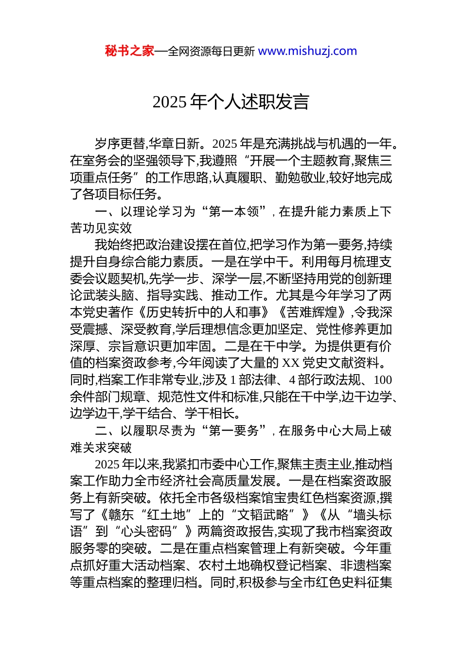 秘书之家—全网资源每日更新 www.mishuzj.com2025 年个人述职发言汇编(6 篇)目录1.2025 年个人述职发言22.2025 年个人述职发言.......................................53.2025 年个人述职发言.......................................84.2025 年个人述职发言.....................................115.2025 年个人述职发言.....................................146.2025 年个人述职发言.....................................17秘书之家—全网资源每日更新 www.mishuzj.com2025 年个人述职发言岁序更替,华章日新。2025 年是充满挑战与机遇的一年。在室务会的坚强领导下,我遵照“开展一个主题教育,聚焦三项重点任务”的工作思路,认真履职、勤勉敬业,较好地完成了各项目标任务。一、以理论学习为“第一本领”,在提升能力素质上下苦功见实效我始终把政治建设摆在首位,把学习作为第一要务,持续提升自身综合能力素质。一是在学中干。利用每月梳理支委会议题契机,先学一步、深学一层,不断坚持用党的创新理论武装头脑、指导实践、推动工作。尤其是今年学习了两本党史著作《历史转折中的人和事》《苦难辉煌》,令我深受震撼、深受教育,学后理想信念更加坚定、党性修养更加深厚、宗旨意识更加牢固。二是在干中学。为提供更有价值的档案资政参考,今年阅读了大量的 XX 党史文献资料。同时,档案工作非常专业,涉及 1 部法律、4 部行政法规、100余件部门规章、规范性文件和标准,只能在干中学,边干边学、边学边干,学干结合、学干相长。二、以履职尽责为“第一要务”,在服务中心大局上破难关求突破2025 年以来,我紧扣市委中心工作,聚焦主责主业,推动档案工作助力全市经济社会高质量发展。一是在档案资政服务上有新突破。依托全市各级档案馆宝贵红色档案资源,撰写了《赣东“红土地”上的“文韬武略”》《从“墙头标语”到“心头密码”》两篇资政报告,实现了我市档案资政服务零的突破。二是在重点档案管理上有新突破。今年重点抓好重大活动档案、农村土地确权登记档案、非遗档案等重点档案的整理归档。同时,积极参与全市红色史料征集秘书之家—全网资源每日更新 www.mishuzj.com和红会文化研究。三是在深改档案建库上有新突破。坚持把档案工作深度融入全市深化改革进程,创新构建“一办八组”协同归档工作机制,推动市委改革办、八个专项协调小组各关键领域 XX 余项改革任务档案的收集整理移交。三、以实干实绩为“第一标尺”,在档案基层基础上出实招开新局2025 年以来,档案科共对 XX 家县级综合档案馆、XX 家机关单位开展了业务指导,持续提升全市档案基层基础能力和水平。一是开展“双评”。开展了 5 年一轮的县级综合档案馆业务建设评价,通过以评促建、以评促改,扎实推进各县(区)综合档案馆抓好业务能力建设。同时,继续对 XX 家机关单位开展了档案工作规范化管理等级评定。截至目前,XX%的市直单位纳入了档案工作规范化建设体系。二是推进“双创”。在去年成功创建首家数字档案室的基础上,今年又推动东乡区档案馆创建数字档案馆、国网 XX 供电公司创建数字档案室,目前都已完成了创建。三是抓好“双提”。继续组织全市档案系统干部参加省档案局在南昌大学举办的“档案速成班”,持续提高全市档案人员专业能力和水平。精心组织“6·9”国际档案日系列宣传活动,扎实开展档案行政执法监督检查,不断提升广大干部职工档案意识。四、以清廉务实为“第一底色”,在科室队伍建设上做文章树形象党办干部的一言一行直接代表了市委的形象,因此,我始终从严要求自己和科室同志,树立对外良好形象。一是更有战斗力。以开展“快稳严准细实”作风专题教育为契机,科室建立了工作任务台账、错情登记台账和每周工作复盘制度,进一步总结工作经验,优化工作流程,工作效能进一步提升。二是更有敬畏心。我们敬畏归档的每一页纸张、每一段影像,因为它们都是不可再生的历史记忆。同时,我们始终敬畏党纪国法,严格按规章程序办事,坚守廉洁底线,维护党办干部良好形象。秘书之家—全网资源每日更新 www.mishuzj.com秘书之家—全网资源每日更新 www.mishuzj.com2025 年个人述职发言今年以来,我主要负...