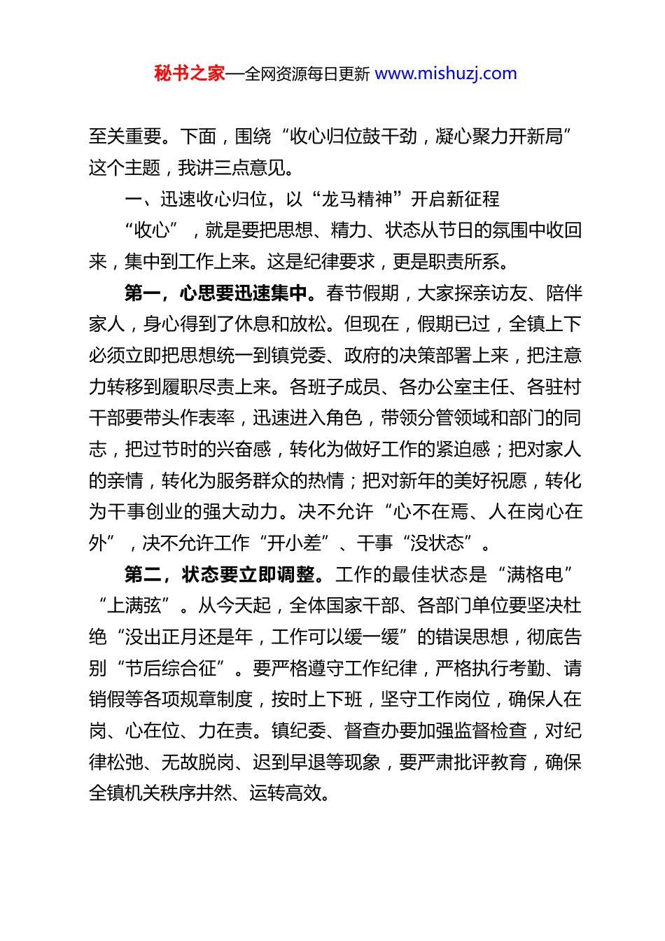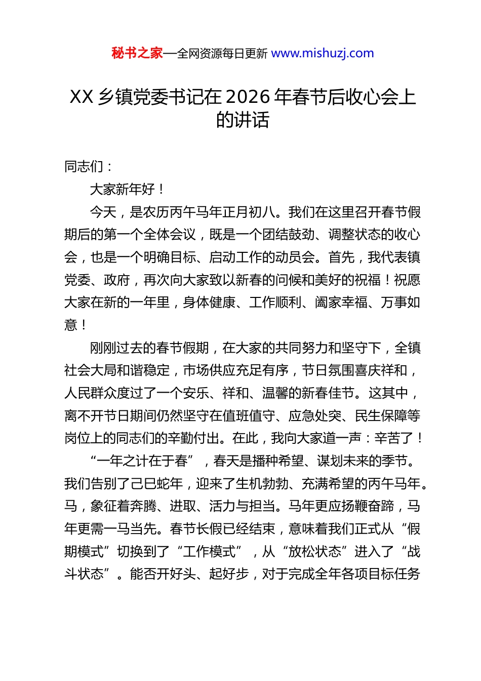 秘书之家—全网资源每日更新 www.mishuzj.comXX 乡镇党委书记在 2026 年春节后收心会上的讲话同志们:大家新年好!今天,是农历丙午马年正月初八。我们在这里召开春节假期后的第一个全体会议,既是一个团结鼓劲、调整状态的收心会,也是一个明确目标、启动工作的动员会。首先,我代表镇党委、政府,再次向大家致以新春的问候和美好的祝福!祝愿大家在新的一年里,身体健康、工作顺利、阖家幸福、万事如意!刚刚过去的春节假期,在大家的共同努力和坚守下,全镇社会大局和谐稳定,市场供应充足有序,节日氛围喜庆祥和,人民群众度过了一个安乐、祥和、温馨的新春佳节。这其中,离不开节日期间仍然坚守在值班值守、应急处突、民生保障等岗位上的同志们的辛勤付出。在此,我向大家道一声:辛苦了!“一年之计在于春”,春天是播种希望、谋划未来的季节。我们告别了己巳蛇年,迎来了生机勃勃、充满希望的丙午马年。马,象征着奔腾、进取、活力与担当。马年更应扬鞭奋蹄,马年更需一马当先。春节长假已经结束,意味着我们正式从“假期模式”切换到了“工作模式”,从“放松状态”进入了“战斗状态”。能否开好头、起好步,对于完成全年各项目标任务秘书之家—全网资源每日更新 www.mishuzj.com至关重要。下面,围绕“收心归位鼓干劲,凝心聚力开新局”这个主题,我讲三点意见。一、迅速收心归位,以“龙马精神”开启新征程“收心”,就是要把思想、精力、状态从节日的氛围中收回来,集中到工作上来。这是纪律要求,更是职责所系。第一,心思要迅速集中。春节假期,大家探亲访友、陪伴家人,身心得到了休息和放松。但现在,假期已过,全镇上下必须立即把思想统一到镇党委、政府的决策部署上来,把注意力转移到履职尽责上来。各班子成员、各办公室主任、各驻村干部要带头作表率,迅速进入角色,带领分管领域和部门的同志,把过节时的兴奋感,转化为做好工作的紧迫感;把对家人的亲情,转化为服务群众的热情;把对新年的美好祝愿,转化为干事创业的强大动力。决不允许“心不在焉、人在岗心在外”,决不允许工作“开小差”、干事“没状态”。第二,状态要立即调整。工作的最佳状态是“满格电”“上满弦”。从今天起,全体国家干部、各部门单位要坚决杜绝“没出正月还是年,工作可以缓一缓”的错误思想,彻底告别“节后综合征”。要严格遵守工作纪律,严格执行考勤、请销假等各项规章制度,按时上下班,坚守工作岗位,确保人在岗、心在位、力在责。镇纪委、督查办要加强监督检查,对纪律松弛、无故脱岗、迟到早退等现象,要严肃批评教育,确保全镇机关秩序井然、运转高效。秘书之家—全网资源每日更新 www.mishuzj.com第三,秩序要及早恢复。各办公室、各中心要迅速恢复正常的工作秩序。办公室环境卫生要打扫整洁,营造一个清爽有序的办公环境;工作流程要迅速理顺,确保各项业务衔接顺畅;工作计划要立即铺开,做到任务明确、责任到人。要形成一种策马扬鞭、换挡提速的浓厚工作氛围,让整个镇机关就像一台加足了油的机器,迅速高效运转起来。二、科学谋划部署,以“骏马奔腾”之势狠抓落实马年要有马的速度和效率。收心是为了更好地干事,归位是为了更快地出发。2026 年,是实施“十四五”规划的关键之年,也是我们 XX 镇抢抓机遇、乘势而上、实现跨越发展的重要一年。目标已经明确,关键在于落实。第一,要锚定目标,理清思路。年前,镇党委已经对全年的重点工作进行了初步谋划。新的一年,我们的目标任务更加繁重,发展压力有增无减。各办公室、各部门要紧紧围绕镇党委、政府的中心工作,结合自身职能,对 2026 年的工作思路进行再梳理、再细化、再完善。要搞清楚“今年干什么、重点抓什么、关键突破什么”。要制定详细的时间表、路线图、任务书,明确完成时限和标准要求,做到心中有数、手里有招。特别是要聚焦乡村振兴、产业发展、项目建设、招商引资、人居环境整治、基层治理、民生保障、安全生产等重点工作,拿出切实可行的具体方案和推进措施。第二,要突出重点,精准发力。工作千头万绪,不能眉毛秘书之家—全网资源每日更新 www.mishuzj.com胡子一把抓。要善于抓住主要...