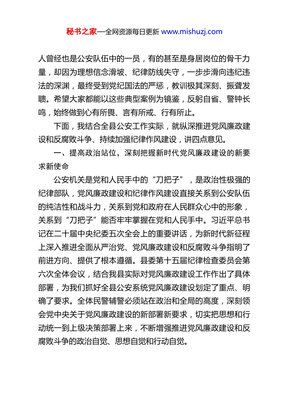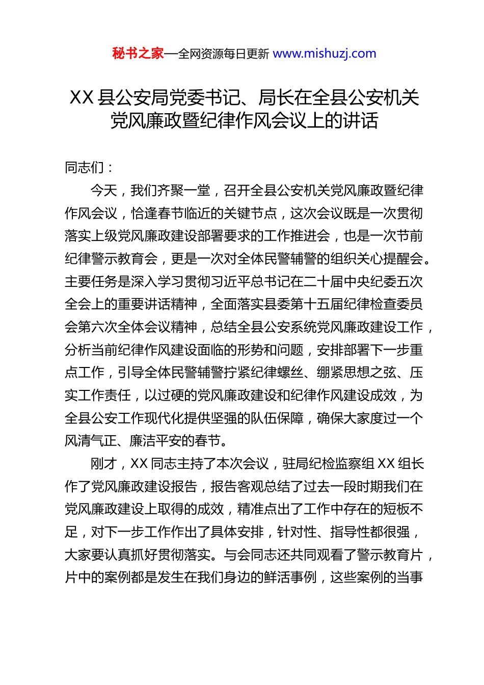 秘书之家—全网资源每日更新 www.mishuzj.comXX 县公安局党委书记、局长在全县公安机关党风廉政暨纪律作风会议上的讲话同志们:今天,我们齐聚一堂,召开全县公安机关党风廉政暨纪律作风会议,恰逢春节临近的关键节点,这次会议既是一次贯彻落实上级党风廉政建设部署要求的工作推进会,也是一次节前纪律警示教育会,更是一次对全体民警辅警的组织关心提醒会。主要任务是深入学习贯彻习近平总书记在二十届中央纪委五次全会上的重要讲话精神,全面落实县委第十五届纪律检查委员会第六次全体会议精神,总结全县公安系统党风廉政建设工作,分析当前纪律作风建设面临的形势和问题,安排部署下一步重点工作,引导全体民警辅警拧紧纪律螺丝、绷紧思想之弦、压实工作责任,以过硬的党风廉政建设和纪律作风建设成效,为全县公安工作现代化提供坚强的队伍保障,确保大家度过一个风清气正、廉洁平安的春节。刚才,XX 同志主持了本次会议,驻局纪检监察组 XX 组长作了党风廉政建设报告,报告客观总结了过去一段时期我们在党风廉政建设上取得的成效,精准点出了工作中存在的短板不足,对下一步工作作出了具体安排,针对性、指导性都很强,大家要认真抓好贯彻落实。与会同志还共同观看了警示教育片,片中的案例都是发生在我们身边的鲜活事例,这些案例的当事秘书之家—全网资源每日更新 www.mishuzj.com人曾经也是公安队伍中的一员,有的甚至是身居岗位的骨干力量,却因为理想信念滑坡、纪律防线失守,一步步滑向违纪违法的深渊,最终受到党纪国法的严惩,教训极其深刻、振聋发聩。希望大家都能以这些典型案例为镜鉴,反躬自省、警钟长鸣,始终做到心有所畏、言有所戒、行有所止。下面,我结合全县公安工作实际,就纵深推进党风廉政建设和反腐败斗争、持续加强纪律作风建设,讲四点意见。一、提高政治站位,深刻把握新时代党风廉政建设的新要求新使命公安机关是党和人民手中的“刀把子”,是政治性极强的纪律部队,党风廉政建设和纪律作风建设直接关系到公安队伍的纯洁性和战斗力,关系到党和政府在人民群众心中的形象,关系到“刀把子”能否牢牢掌握在党和人民手中。习近平总书记在二十届中央纪委五次全会上的重要讲话,为新时代新征程上深入推进全面从严治党、党风廉政建设和反腐败斗争指明了前进方向、提供了根本遵循。县委第十五届纪律检查委员会第六次全体会议,结合我县实际对党风廉政建设工作作出了具体部署,为我们抓好全县公安系统党风廉政建设划定了重点、明确了要求。全体民警辅警必须站在政治和全局的高度,深刻领会党中央关于党风廉政建设的新部署新要求,切实把思想和行动统一到上级决策部署上来,不断增强推进党风廉政建设和反腐败斗争的政治自觉、思想自觉和行动自觉。秘书之家—全网资源每日更新 www.mishuzj.com一是要深刻认识党风廉政建设是公安队伍建设的“生命线”。公安队伍身处执法执勤第一线,面对的诱惑和考验比普通岗位更多、更直接,如果党风廉政建设抓得不紧、纪律作风建设抓得不实,就容易出现违纪违法问题,不仅会损害公安队伍的整体形象,更会影响公安机关依法履行职责,甚至动摇党和人民对公安队伍的信任。从刚才观看的警示教育片可以看到,个别民警辅警就是因为放松了对自己的要求,把纪律规矩抛在脑后,从一顿饭、一瓶酒、一张卡开始,一步步突破纪律底线、触碰法律红线,最终酿成大错。这充分说明,党风廉政建设和纪律作风建设永远在路上,必须时刻保持清醒,常抓不懈、久久为功,把这条“生命线”守牢守好。二是要深刻认识党风廉政建设是履行公安职责的“保障线”。当前,我县正处在高质量发展的关键时期,维护社会治安大局稳定、保障人民群众生命财产安全、护航经济社会发展,是公安机关的核心职责。要完成好这些职责使命,必须有一支政治过硬、业务过硬、责任过硬、纪律过硬、作风过硬的公安队伍。如果队伍中存在作风散漫、纪律松弛、徇私枉法等问题,就不可能做到公正执法、规范执法,不可能有效应对各类风险挑战,更不可能赢得人民群众的支持和认可。只有把党风廉政建设和纪律作风建设抓严抓实,打造一支忠诚干净担当的公安铁军,才能确保公安机...