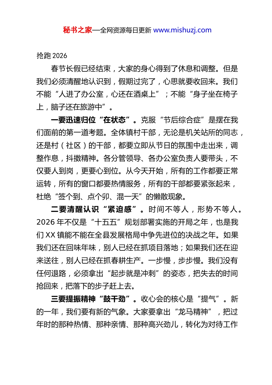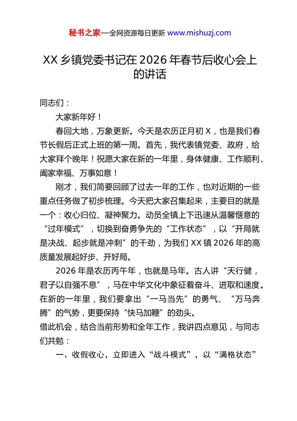 秘书之家—全网资源每日更新 www.mishuzj.comXX 乡镇党委书记在 2026 年春节后收心会上的讲话同志们:大家新年好!春回大地,万象更新。今天是农历正月初 X,也是我们春节长假后正式上班的第一周。首先,我代表镇党委、政府,给大家拜个晚年!祝愿大家在新的一年里,身体健康、工作顺利、阖家幸福、万事如意!刚才,我们简要回顾了过去一年的工作,也对近期的一些重点任务做了初步梳理。今天把大家召集起来,主要目的就是一个:收心归位、凝神聚力。动员全镇上下迅速从温馨惬意的“过年模式”,切换到奋勇争先的“工作状态”,以“开局就是决战、起步就是冲刺”的干劲,为我们 XX 镇 2026 年的高质量发展起好步、开好局。2026 年是农历丙午年,也就是马年。古人讲“天行健,君子以自强不息”,马在中华文化中象征着奋斗、进取和速度。在新的一年里,我们要拿出“一马当先”的勇气、“万马奔腾”的气势,更要保持“快马加鞭”的劲头。借此机会,结合当前形势和全年工作,我讲四点意见,与同志们共勉:一、收假收心,立即进入“战斗模式”,以“满格状态”秘书之家—全网资源每日更新 www.mishuzj.com抢跑 2026春节长假已经结束,大家的身心得到了休息和调整。但是我们必须清醒地认识到,假期过完了,心思就要收回来。我们不能“人进了办公室,心还在酒桌上”;不能“身子坐在椅子上,脑子还在旅游中”。一要迅速归位“在状态”。克服“节后综合症”是摆在我们面前的第一道考题。全体镇村干部,无论是机关站所的同志,还是村(社区)的干部,都要立即从节日的氛围中走出来,调整作息,抖擞精神。各分管领导、各办公室负责人要带头,不仅要人到岗,更要心到位。从今天开始,所有的工作都要正常运转,所有的窗口都要热情服务,所有的干部都要紧张起来,杜绝“签个到、点个卯、混一天”的懒散现象。二要清醒认识“紧迫感”。时间不等人,形势不等人。2026 年不仅是“十五五”规划部署实施的开局之年,也是我们 XX 镇能不能在全县发展格局中争先进位的决战之年。如果我们还在回味年味,别人已经在抓项目落地;如果我们还在迎来送往,别人已经在抓春耕生产。一步慢,步步慢。我们没有任何退路,必须拿出“起步就是冲刺”的姿态,把失去的时间抢回来,把落下的步子赶上去。三要提振精神“鼓干劲”。收心会的核心是“提气”。新的一年,我们要有新的气象。大家要拿出“龙马精神”,把过年时的那种热情、那种亲情、那种高兴劲儿,转化为对待工作秘书之家—全网资源每日更新 www.mishuzj.com的激情、对待群众的真情、对待困难的豪情。要以饱满的精神、提速的节奏、实干的作风,积极投身到新一年的工作中,确保各项工作迅速步入正轨。二、谋篇布局,精准聚焦“重点战场”,以“顶格标准”决胜开门红一年之计在于春。全年工作看开局,一季度“开门红”直接关系到全年的“满堂彩”。我们要围绕镇党委、政府确定的2026 年经济社会发展目标,早谋划、早部署、早行动。一要细化目标“拉满弓”。各分管领导要迅速召集分管站所和联系村(社区),对照上级下达的指标和年初既定的计划,逐项梳理。2026 年,我们的重点任务依然是乡村振兴、产业升级、民生改善和基层治理。具体来说:在产业发展上:我们要紧盯 XX 特色农业的提质增效,抓好春耕备耕,确保粮食安全;要持续优化营商环境,主动对接乡贤老板,争取项目落地。在项目建设上:对在建项目,要倒排工期,确保进度;对拟建项目,要加快手续办理,争取早开工;对储备项目,要加强论证,争取上级资金。在民生保障上:要持续关注“一老一小”,抓好安全生产信访维稳等底线工作,特别是春节后的复工复产安全,绝不能有丝毫马虎。二要攻坚克难“敢亮剑”。回顾过去一年,我们虽然取得秘书之家—全网资源每日更新 www.mishuzj.com了一些成绩,但也存在着短板和弱项,比如部分村的集体经济依然薄弱,人居环境整治的长效机制还不够健全,一些历史遗留问题还没有彻底解决。2026 年,我们不能绕着问题走,而要迎着困难上。要有“明知山有虎、偏向虎山行”的胆识,针对难点堵点,成立专班,逐个击破,确保一季度在难点工作上有突破、在...