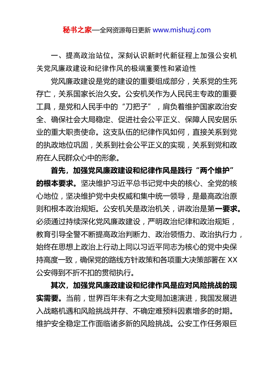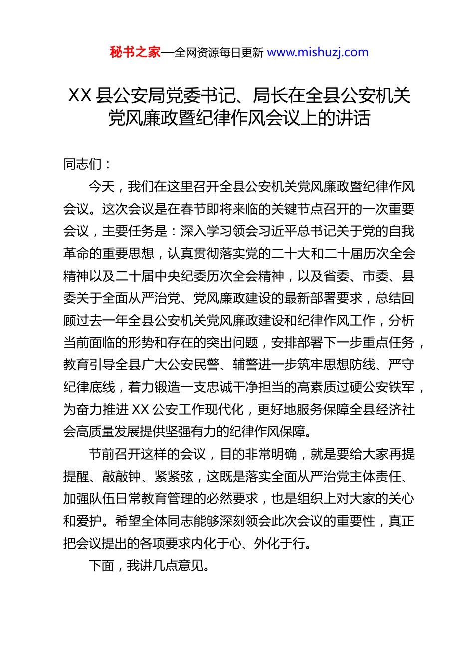 秘书之家—全网资源每日更新 www.mishuzj.comXX 县公安局党委书记、局长在全县公安机关党风廉政暨纪律作风会议上的讲话同志们:今天,我们在这里召开全县公安机关党风廉政暨纪律作风会议。这次会议是在春节即将来临的关键节点召开的一次重要会议,主要任务是:深入学习领会习近平总书记关于党的自我革命的重要思想,认真贯彻落实党的二十大和二十届历次全会精神以及二十届中央纪委历次全会精神,以及省委、市委、县委关于全面从严治党、党风廉政建设的最新部署要求,总结回顾过去一年全县公安机关党风廉政建设和纪律作风工作,分析当前面临的形势和存在的突出问题,安排部署下一步重点任务,教育引导全县广大公安民警、辅警进一步筑牢思想防线、严守纪律底线,着力锻造一支忠诚干净担当的高素质过硬公安铁军,为奋力推进 XX 公安工作现代化,更好地服务保障全县经济社会高质量发展提供坚强有力的纪律作风保障。节前召开这样的会议,目的非常明确,就是要给大家再提提醒、敲敲钟、紧紧弦,这既是落实全面从严治党主体责任、加强队伍日常教育管理的必然要求,也是组织上对大家的关心和爱护。希望全体同志能够深刻领会此次会议的重要性,真正把会议提出的各项要求内化于心、外化于行。下面,我讲几点意见。秘书之家—全网资源每日更新 www.mishuzj.com一、提高政治站位,深刻认识新时代新征程上加强公安机关党风廉政建设和纪律作风的极端重要性和紧迫性党风廉政建设是党的建设的重要组成部分,关系党的生死存亡,关系国家长治久安。公安机关作为人民民主专政的重要工具,是党和人民手中的“刀把子”,肩负着维护国家政治安全、确保社会大局稳定、促进社会公平正义、保障人民安居乐业的重大职责使命。这支队伍的纪律作风如何,直接关系到党的执政地位巩固,关系到社会公平正义的实现,关系到党和政府在人民群众心中的形象。首先,加强党风廉政建设和纪律作风是践行“两个维护”的根本要求。坚决维护习近平总书记党中央的核心、全党的核心地位,坚决维护党中央权威和集中统一领导,是最高政治原则和根本政治规矩。公安机关是政治机关,讲政治是第一要求。必须通过持续深化党风廉政建设,严明政治纪律和政治规矩,教育引导全警不断提高政治判断力、政治领悟力、政治执行力,始终在思想上政治上行动上同以习近平同志为核心的党中央保持高度一致,确保党的路线方针政策和各项重大决策部署在 XX公安得到不折不扣的贯彻执行。其次,加强党风廉政建设和纪律作风是应对风险挑战的现实需要。当前,世界百年未有之大变局加速演进,我国发展进入战略机遇和风险挑战并存、不确定难预料因素增多的时期。维护安全稳定工作面临诸多新的风险挑战。公安工作任务艰巨秘书之家—全网资源每日更新 www.mishuzj.com繁重,队伍面临的考验更加严峻复杂。社会上形形色色的诱惑和“围猎”风险无处不在,稍有不慎就可能滑入违纪违法的深渊。只有时刻保持清醒头脑,持之以恒正风肃纪反腐,才能有效防范化解各种风险,确保队伍始终保持旺盛的斗志和强大的战斗力,在关键时刻能够拉得出、冲得上、打得赢。再次,加强党风廉政建设和纪律作风是回应人民群众新期待的必然选择。随着我国社会主要矛盾的变化,人民群众对民主、法治、公平、正义、安全、环境等方面的要求日益增长。公安机关执法办案、管理服务的水平,民警的一言一行,都处在人民群众的监督之下。任何一起执法不公、不廉的行为,都会严重损害警民关系,侵蚀党的执政根基。我们必须牢固树立以人民为中心的发展思想,通过加强纪律作风建设,下大力气整治群众反映强烈的突出问题,不断提升执法公信力和群众满意度,让人民群众切实感受到公平正义就在身边。第四,加强党风廉政建设和纪律作风是推进 XX 公安工作现代化的内在要求。公安工作现代化不仅是技术装备的现代化,更是理念、机制、能力、作风的现代化。没有过硬的纪律作风作保障,再好的蓝图也难以实现。当前,我们正在奋力推进 XX公安工作现代化建设的征程中,必然会遇到许多难啃的硬骨头,需要攻克许多体制机制障碍。这就要求我们必须有一支纪律严明、作风优良、敢于担当、善于作为的公安队...