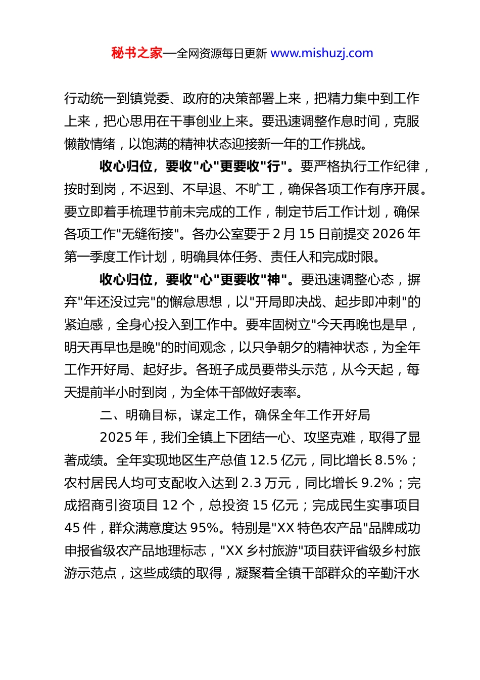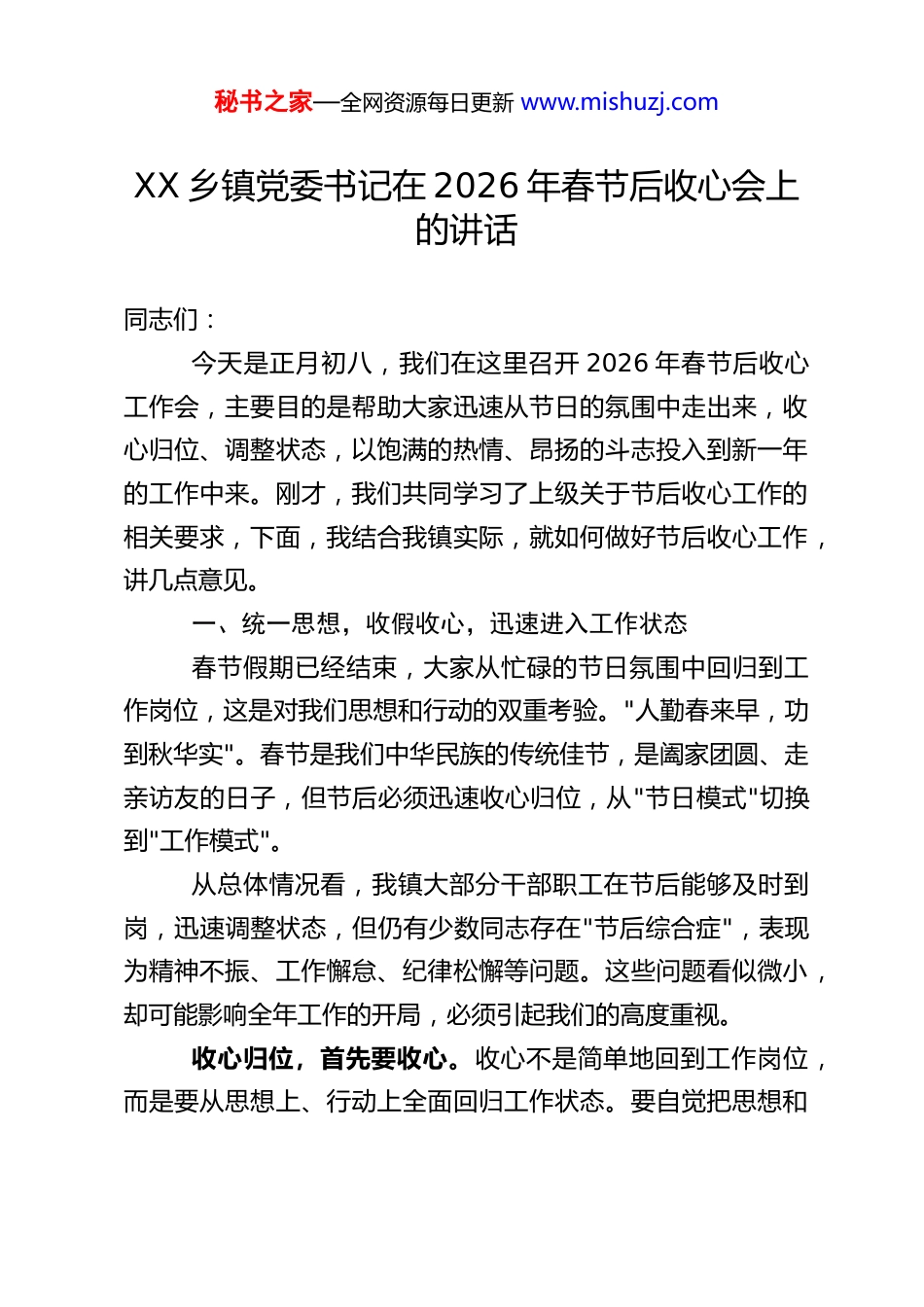秘书之家—全网资源每日更新 www.mishuzj.comXX 乡镇党委书记在 2026 年春节后收心会上的讲话同志们:今天是正月初八,我们在这里召开 2026 年春节后收心工作会,主要目的是帮助大家迅速从节日的氛围中走出来,收心归位、调整状态,以饱满的热情、昂扬的斗志投入到新一年的工作中来。刚才,我们共同学习了上级关于节后收心工作的相关要求,下面,我结合我镇实际,就如何做好节后收心工作,讲几点意见。一、统一思想,收假收心,迅速进入工作状态春节假期已经结束,大家从忙碌的节日氛围中回归到工作岗位,这是对我们思想和行动的双重考验。"人勤春来早,功到秋华实"。春节是我们中华民族的传统佳节,是阖家团圆、走亲访友的日子,但节后必须迅速收心归位,从"节日模式"切换到"工作模式"。从总体情况看,我镇大部分干部职工在节后能够及时到岗,迅速调整状态,但仍有少数同志存在"节后综合症",表现为精神不振、工作懈怠、纪律松懈等问题。这些问题看似微小,却可能影响全年工作的开局,必须引起我们的高度重视。收心归位,首先要收心。收心不是简单地回到工作岗位,而是要从思想上、行动上全面回归工作状态。要自觉把思想和秘书之家—全网资源每日更新 www.mishuzj.com行动统一到镇党委、政府的决策部署上来,把精力集中到工作上来,把心思用在干事创业上来。要迅速调整作息时间,克服懒散情绪,以饱满的精神状态迎接新一年的工作挑战。收心归位,要收"心"更要收"行"。要严格执行工作纪律,按时到岗,不迟到、不早退、不旷工,确保各项工作有序开展。要立即着手梳理节前未完成的工作,制定节后工作计划,确保各项工作"无缝衔接"。各办公室要于 2 月 15 日前提交 2026 年第一季度工作计划,明确具体任务、责任人和完成时限。收心归位,要收"心"更要收"神"。要迅速调整心态,摒弃"年还没过完"的懈怠思想,以"开局即决战、起步即冲刺"的紧迫感,全身心投入到工作中。要牢固树立"今天再晚也是早,明天再早也是晚"的时间观念,以只争朝夕的精神状态,为全年工作开好局、起好步。各班子成员要带头示范,从今天起,每天提前半小时到岗,为全体干部做好表率。二、明确目标,谋定工作,确保全年工作开好局2025 年,我们全镇上下团结一心、攻坚克难,取得了显著成绩。全年实现地区生产总值 12.5 亿元,同比增长 8.5%;农村居民人均可支配收入达到 2.3 万元,同比增长 9.2%;完成招商引资项目 12 个,总投资 15 亿元;完成民生实事项目45 件,群众满意度达 95%。特别是"XX 特色农产品"品牌成功申报省级农产品地理标志,"XX 乡村旅游"项目获评省级乡村旅游示范点,这些成绩的取得,凝聚着全镇干部群众的辛勤汗水秘书之家—全网资源每日更新 www.mishuzj.com和智慧结晶。2026 年,是实施"十五五"规划的开局之年,也是我们推动高质量发展的攻坚之年。我们要紧紧围绕"产业兴旺、生态宜居、乡风文明、治理有效、生活富裕"的总要求,重点抓好以下几方面工作:第一,聚焦乡村振兴,打造产业新高地。我们要立足镇域资源禀赋,大力发展特色农业、乡村旅游、农村电商等产业。重点推进 XX 农业产业园建设,引进 XX 农业科技公司,打造集种植、加工、销售于一体的产业链,预计带动周边农户 1500人就业,人均增收 5000 元。同时,要大力发展乡村旅游,打造"XX 乡村游"品牌,力争全年接待游客 30 万人次,实现旅游收入 2000 万元。第二,聚焦民生改善,提升群众幸福感。要持续推进农村人居环境整治,完成 12 个村的"厕所革命",新建、改建农村公路 35 公里。要加大教育、医疗、养老等公共服务投入,确保每项民生实事落到实处、见到实效。我们将实施"乡村温暖工程",重点解决农村老人"吃饭难"问题,计划在全镇新建 5 个农村幸福院,为 1200 名农村老人提供助餐服务。同时,开展"乡村夜话"活动,每周组织干部与群众面对面交流,了解群众需求,解决实际问题。第三,聚焦基层治理,构建和谐新家园。要深化"枫桥经验",完善矛盾纠纷多元化解机制,确保小事不出村、大事不出秘书之家—全网资源每日更新 www.mishuzj.com镇。要推进智慧乡村建设,提升基层治理现...