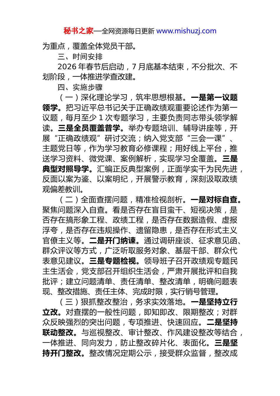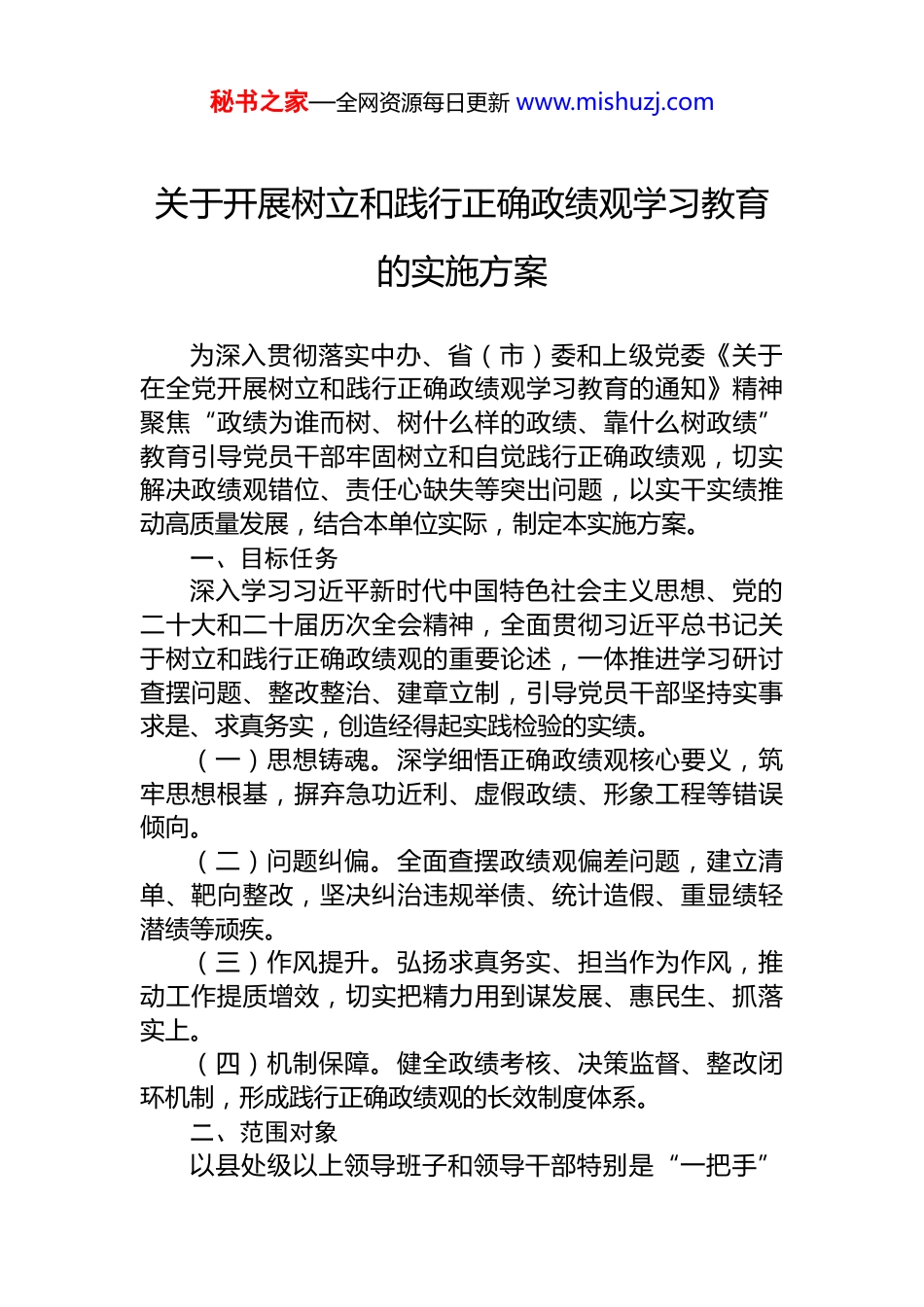 秘书之家—全网资源每日更新 www.mishuzj.com关于开展树立和践行正确政绩观学习教育的实施方案为深入贯彻落实中办、省(市)委和上级党委《关于在全党开展树立和践行正确政绩观学习教育的通知》精神聚焦“政绩为谁而树、树什么样的政绩、靠什么树政绩”教育引导党员干部牢固树立和自觉践行正确政绩观,切实解决政绩观错位、责任心缺失等突出问题,以实干实绩推动高质量发展,结合本单位实际,制定本实施方案。一、目标任务深入学习习近平新时代中国特色社会主义思想、党的二十大和二十届历次全会精神,全面贯彻习近平总书记关于树立和践行正确政绩观的重要论述,一体推进学习研讨查摆问题、整改整治、建章立制,引导党员干部坚持实事求是、求真务实,创造经得起实践检验的实绩。(一)思想铸魂。深学细悟正确政绩观核心要义,筑牢思想根基,摒弃急功近利、虚假政绩、形象工程等错误倾向。(二)问题纠偏。全面查摆政绩观偏差问题,建立清单、靶向整改,坚决纠治违规举债、统计造假、重显绩轻潜绩等顽疾。(三)作风提升。弘扬求真务实、担当作为作风,推动工作提质增效,切实把精力用到谋发展、惠民生、抓落实上。(四)机制保障。健全政绩考核、决策监督、整改闭环机制,形成践行正确政绩观的长效制度体系。二、范围对象以县处级以上领导班子和领导干部特别是“一把手”秘书之家—全网资源每日更新 www.mishuzj.com为重点,覆盖全体党员干部。三、时间安排2026 年春节后启动,7 月底基本结束,不分批次、不划阶段,一体推进学查改建。四、实施步骤(一)深化理论学习,筑牢思想根基。一是第一议题领学。把习近平总书记关于正确政绩观重要论述作为第一议题,每月至少 1 次专题学习,主要负责同志带头领学解读。三是全员覆盖普学。举办专题培训、辅导讲座等,开展“正确政绩观”研讨交流;纳入党支部“三会一课”、主题党日等,作为学习教育必修课程;用好线上平台,推送学习资料、微党课、案例解析,实现学习全覆盖。三是典型对照导学。汇编正反典型案例,正面学实干为民先进,反面以案为鉴、以案明纪,开展警示教育,深刻汲取政绩观偏差教训。(二)全面查摆问题,精准检视剖析。一是对标自查。聚焦问题深入自查。看是否存在盲目蛮干、短视决策,是否存在搞形象工程、政绩工程,是否存在数据造假、虚报浮夸,是否存在违规操作、遗留隐患,是否存在形式主义官僚主义等。二是开门纳谏。通过调研座谈、征求意见函、群众评议等方式,广泛听取服务对象、基层干部、群众代表意见建议。三是专题检视。领导班子召开政绩观专题民主生活会,党支部召开组织生活会,严肃开展批评和自我批评;建立问题清单、责任清单、整改清单,明确问题表现、整改措施、责任主体、完成时限,实行销号管理。(三)狠抓整改整治,务求实效落地。一是坚持立行立改。对查摆的一般性问题,即知即改、限期整改;对群众反映强烈的突出问题,专项推进、快速回应。二是坚持联动整改。与巡视整改、审计整改、作风建设整改等结合,一体推进、同向发力,防止整改碎片化、表面化。三是坚持开门整改。整改情况定期公示,接受群众监督,整改成秘书之家—全网资源每日更新 www.mishuzj.com效由群众评判,确保改到位、改彻底。(四)健全长效机制,巩固教育成果。一是完善政绩考核机制。优化考核指标,坚持高质量发展、风险防范、群众满意度,淡化数字排名导向。二是规范科学决策机制。严格执行民主集中制,落实重大事项请示报告、风险评估审计审查,防止拍脑袋决策。三是强化监督问责机制。加强对政绩观偏差问题的监督,对搞虚假政绩、造成损失的严肃追责问责。五、组织保障(一)加强组织领导。党组织书记履行第一责任人职责,班子成员履行“一岗双责”,统筹推进日常工作,激励干部敢担当、善作为,确保有序开展。(二)强化督促指导。采取随机抽查、调研访谈、列席会议等方式,加强对各部门、各支部的督促指导,及时发现解决问题,防止形式主义、走过场。(三)注重统筹结合。把学习教育与中心工作、年度任务、队伍建设结合,以学习教育促工作提升,以工作实绩检验学习教育成效,做到两手抓、两促进。(四)营造浓...