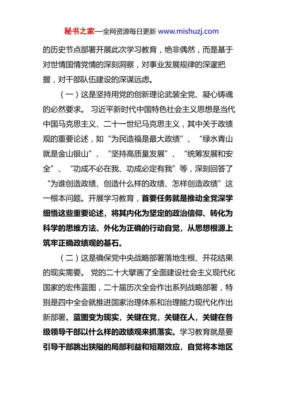 秘书之家—全网资源每日更新 www.mishuzj.com筑牢政绩观“压舱石” 挺起实干担当“硬脊梁”——关于在全党深入开展树立和践行正确政绩观学习教育的深度解读与实践指南在全党全国各族人民意气风发踏上以中国式现代化全面推进强国建设、民族复兴新征程的关键时期,中共中央办公厅印发《关于在全党开展树立和践行正确政绩观学习教育的通知》(以下简称《通知》),这是党中央着眼新时代新征程党的使命任务,深化党的自我革命、推进全面从严治党向纵深发展的重大战略举措,是教育引导全党同志特别是领导干部统一思想、统一意志、统一行动的迫切需要,更是确保“十五五”开好局起好步、推动高质量发展行稳致远的根本政治保证。深入学习领会《通知》精神,全面准确把握其核心要义与实践要求,对于确保学习教育高起点开局、高标准推进、高质量见效,具有至关重要的意义。一、 提高政治站位,深刻认识开展学习教育的时代必然性与极端重要性政绩观是党员干部从政、干事、创业的“总开关”,反映党性、体现作风、决定作为。在承前启后、继往开来秘书之家—全网资源每日更新 www.mishuzj.com的历史节点部署开展此次学习教育,绝非偶然,而是基于对世情国情党情的深刻洞察,对事业发展规律的深邃把握,对干部队伍建设的深谋远虑。(一)这是坚持用党的创新理论武装全党、凝心铸魂的必然要求。 习近平新时代中国特色社会主义思想是当代中国马克思主义、二十一世纪马克思主义,其中关于政绩观的重要论述,如“为民造福是最大政绩”、“绿水青山就是金山银山”、“坚持高质量发展”、“统筹发展和安全”、“功成不必在我、功成必定有我”等,深刻回答了“为谁创造政绩、创造什么样的政绩、怎样创造政绩”这一根本问题。开展学习教育,首要任务就是推动全党深学细悟这些重要论述,将其内化为坚定的政治信仰、转化为科学的思维方法、外化为正确的行动自觉,从思想根源上筑牢正确政绩观的基石。(二)这是确保党中央战略部署落地生根、开花结果的现实需要。 党的二十大擘画了全面建设社会主义现代化国家的宏伟蓝图,二十届历次全会作出系列战略部署,特别是四中全会就推进国家治理体系和治理能力现代化作出新部署。蓝图变为现实,关键在党,关键在人,关键在各级领导干部以什么样的政绩观来抓落实。学习教育就是要引导干部跳出狭隘的局部利益和短期效应,自觉将本地区秘书之家—全网资源每日更新 www.mishuzj.com本部门工作置于党和国家事业全局中谋划推进,确保执行党中央决策部署不偏向、不变通、不走样,以实实在在的政绩为强国复兴伟业添砖加瓦。(三)这是推动高质量发展、扎实推进中国式现代化的关键之举。 高质量发展是全面建设社会主义现代化国家的首要任务。当前,发展不平衡不充分问题仍然突出,科技创新能力有待加强,重点领域改革还有不少硬骨头要啃,防范化解重大风险任务艰巨。这些都对领导干部的政绩观提出了新的更高要求。学习教育旨在推动全党完整、准确、全面贯彻新发展理念,摆脱“速度情结”、“路径依赖”,破除“GDP 崇拜”,引导干部追求创新成为第一动力、协调成为内生特点、绿色成为普遍形态、开放成为必由之路、共享成为根本目的的高质量发展政绩。(四)这是深化全面从严治党、锻造过硬干部队伍的治本之策。 干部队伍的政绩观,是其党性修养、宗旨意识、纪律作风的集中体现。现实中,仍有少数干部政绩观存在偏差:有的急功近利、好大喜功,搞劳民伤财的“形象工程”、“政绩工程”;有的为了短期数据好看,不惜弄虚作假、竭泽而渔;有的“新官不理旧账”,缺乏“一张蓝图绘到底”的韧劲;有的不愿做打基础、利长远的“潜绩”,只想摘“显绩”的果子……这些偏差,损害党的秘书之家—全网资源每日更新 www.mishuzj.com形象,贻误事业发展,侵蚀执政根基。学习教育就是要以自我革命精神,来一次思想大扫除、党性大锤炼、作风大检视,教育引导干部牢记“三个务必”,永葆清正廉洁的政治本色,成为可堪大用、能担重任的栋梁之才。二、 把握核心要义,全面领会正确政绩观的丰富内涵与实践指向树立和践行正确政绩观,必须深刻理解其科学内涵和精神实质。《通知》明...