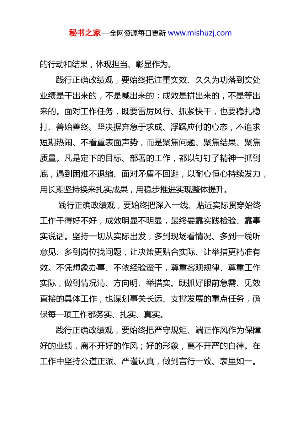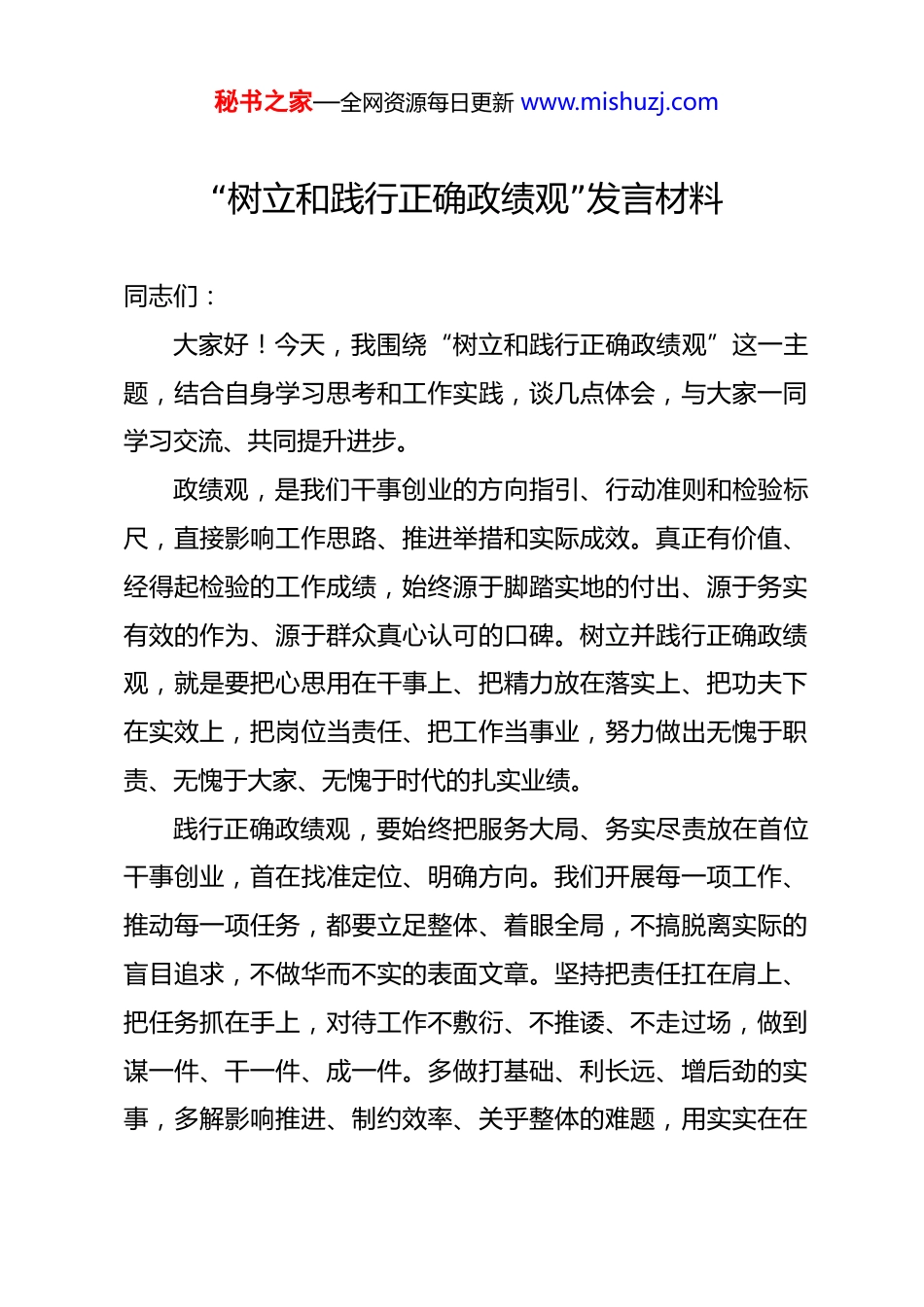 秘书之家—全网资源每日更新 www.mishuzj.com“”树立和践行正确政绩观 发言材料同志们:大家好!今天,我围绕“树立和践行正确政绩观”这一主题,结合自身学习思考和工作实践,谈几点体会,与大家一同学习交流、共同提升进步。政绩观,是我们干事创业的方向指引、行动准则和检验标尺,直接影响工作思路、推进举措和实际成效。真正有价值、经得起检验的工作成绩,始终源于脚踏实地的付出、源于务实有效的作为、源于群众真心认可的口碑。树立并践行正确政绩观,就是要把心思用在干事上、把精力放在落实上、把功夫下在实效上,把岗位当责任、把工作当事业,努力做出无愧于职责、无愧于大家、无愧于时代的扎实业绩。践行正确政绩观,要始终把服务大局、务实尽责放在首位干事创业,首在找准定位、明确方向。我们开展每一项工作、推动每一项任务,都要立足整体、着眼全局,不搞脱离实际的盲目追求,不做华而不实的表面文章。坚持把责任扛在肩上、把任务抓在手上,对待工作不敷衍、不推诿、不走过场,做到谋一件、干一件、成一件。多做打基础、利长远、增后劲的实事,多解影响推进、制约效率、关乎整体的难题,用实实在在秘书之家—全网资源每日更新 www.mishuzj.com的行动和结果,体现担当、彰显作为。践行正确政绩观,要始终把注重实效、久久为功落到实处业绩是干出来的,不是喊出来的;成效是拼出来的,不是等出来的。面对工作任务,既要雷厉风行、抓紧快干,也要稳扎稳打、善始善终。坚决摒弃急于求成、浮躁应付的心态,不追求短期热闹、不看重表面声势,而是聚焦问题、聚焦结果、聚焦质量。凡是定下的目标、部署的工作,都以钉钉子精神一抓到底,遇到困难不退缩、面对矛盾不回避,以耐心恒心持续发力,用长期坚持换来扎实成果,用稳步推进实现整体提升。 践行正确政绩观,要始终把深入一线、贴近实际贯穿始终工作干得好不好,成效明显不明显,最终要靠实践检验、靠事实说话。坚持一切从实际出发,多到现场看情况、多到一线听意见、多到岗位找问题,让决策更贴合实际、让举措更精准有效。不凭想象办事、不依经验蛮干,尊重客观规律、尊重工作实际,做到情况清、方向明、举措实。既抓好眼前急需、见效直接的具体工作,也谋划事关长远、支撑发展的重点任务,确保每一项工作都务实、扎实、真实。践行正确政绩观,要始终把严守规矩、端正作风作为保障好的业绩,离不开好的作风;好的形象,离不开严的自律。在工作中坚持公道正派、严谨认真,做到言行一致、表里如一。秘书之家—全网资源每日更新 www.mishuzj.com严格遵守各项规章制度和工作纪律,保持清醒自觉、守住行为底线,做到心有所畏、言有所戒、行有所止。自觉净化工作圈、生活圈,保持简单清爽、健康向上的人际关系,以端正的作风、务实的形象,带动形成干事创业、风清气正的良好氛围,为高质量推进各项工作提供坚强保障。树立正确政绩观,不是一时一事的要求,而是长期坚持的必修课;不是一句口号,而是具体实在的行动。新时代新征程,任务更重、要求更高,更需要我们端正心态、摆正姿态、保持状态,把正确政绩观内化于心、外化于行。让我们以更加坚定的自觉、更加务实的作风、更加有力的举措,坚持务实重干、坚持精益求精、坚持担当尽责,用心用情干好每一项工作、做实每一件事情,以扎实业绩展现新作为、以优良作风树立新形象,奋力推动各项工作再上新台阶、再创新佳绩!