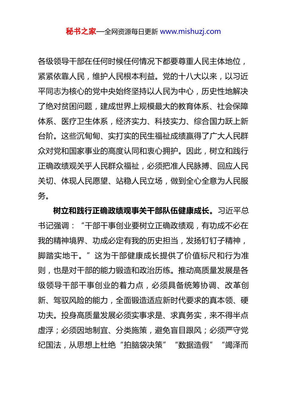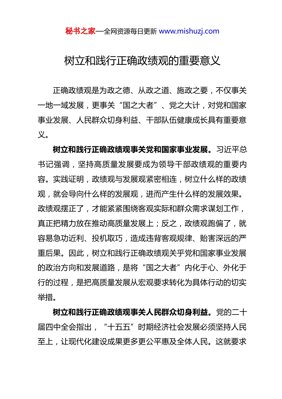 秘书之家—全网资源每日更新 www.mishuzj.com树立和践行正确政绩观的重要意义正确政绩观是为政之德、从政之道、施政之要,不仅事关一地一域发展,更事关“国之大者”、党之大计,对党和国家事业发展、人民群众切身利益、干部队伍健康成长具有重要意义。树立和践行正确政绩观事关党和国家事业发展。习近平总书记强调,坚持高质量发展要成为领导干部政绩观的重要内容。实践证明,政绩观与发展观紧密相连,树立什么样的政绩观,就会导向什么样的发展观,进而产生什么样的发展效果。政绩观摆正了,才能紧紧围绕客观实际和群众需求谋划工作,真正把精力放在推动高质量发展上;反之,政绩观跑偏了,就容易急功近利、投机取巧,造成违背客观规律、贻害深远的严重后果。因此,树立和践行正确政绩观关乎党和国家事业发展的政治方向和发展道路,是将“国之大者”内化于心、外化于行的过程,是把高质量发展从宏观要求转化为具体行动的切实举措。树立和践行正确政绩观事关人民群众切身利益。党的二十届四中全会指出,“十五五”时期经济社会发展必须坚持人民至上,让现代化建设成果更多更公平惠及全体人民。这就要求秘书之家—全网资源每日更新 www.mishuzj.com各级领导干部在任何时候任何情况下都要尊重人民主体地位,紧紧依靠人民,维护人民根本利益。党的十八大以来,以习近平同志为核心的党中央始终坚持以人民为中心,历史性地解决了绝对贫困问题,建成世界上规模最大的教育体系、社会保障体系、医疗卫生体系,经济实力、科技实力、综合国力跃上新台阶。这些沉甸甸、实打实的民生福祉成绩赢得了广大人民群众对党和国家事业的高度认同和衷心拥护。因此,树立和践行正确政绩观关乎人民群众福祉,必须把准人民脉搏、回应人民关切、体现人民愿望、站稳人民立场,做到全心全意为人民服务。树立和践行正确政绩观事关干部队伍健康成长。习近平总书记强调:“干部干事创业要树立正确政绩观,有功成不必在我的精神境界、功成必定有我的历史担当,发扬钉钉子精神,脚踏实地干。”这为干部健康成长提供了价值标尺和行为准则,也是对干部的能力锻造和政治历练。推动高质量发展是各级领导干部干事创业的着力点,必须具备统筹协调、改革创新、驾驭风险的能力,全面锻造适应新时代要求的真本领、硬功夫。投身高质量发展必须实事求是、求真务实,来不得半点虚浮;必须因地制宜、分类施策,避免盲目跟风;必须严守党纪国法,从思想上杜绝“拍脑袋决策”“数据造假”“竭泽而秘书之家—全网资源每日更新 www.mishuzj.com渔”等行为。因此,树立和践行正确政绩观关乎干部队伍的战斗力、凝聚力和精气神,有助于全党形成“靠实干创实绩、以实绩论英雄”的鲜明导向。政绩观正确与否,不仅影响着干部个人的健康成长,更关系党和人民事业发展。不树立正确政绩观,不仅高质量发展无从谈起,而且会劳民伤财、贻害子孙。新征程上,树立和践行正确政绩观,有利于完整准确全面贯彻新发展理念,加快构建新发展格局,实现高质量发展和高水平安全的良性互动,进而更好地推进强国建设、民族复兴伟业。一、树立和践行正确政绩观是以新发展理念引领高质量发展的必然要求习近平总书记指出:“理念是行动的先导,一定的发展实践都是由一定的发展理念来引领的。发展理念是否对头,从根本上决定着发展成效乃至成败。实践告诉我们,发展是一个不断变化的进程,发展环境不会一成不变,发展条件不会一成不变,发展理念自然也不会一成不变。”坚持创新、协调、绿色、开放、共享的新发展理念,集中反映了我们党对经济社会发展规律认识的深化,是关系我国发展全局的一场深刻变革。其中,创新发展注重的是解决发展动力问题,协调发展注重的是解决发展不平衡问题,绿色发展注重的是解决人与自然和谐秘书之家—全网资源每日更新 www.mishuzj.com问题,开放发展注重的是解决发展内外联动问题,共享发展注重的是解决社会公平正义问题。贯彻落实新发展理念既涉及一系列思维方式、行为方式、工作方式的变革,又涉及一系列工作关系、社会关系、利益关系的调整。正确政绩观与新发展理念在本质上是相通的,两者都强调以人民为中心,都追求高质量...