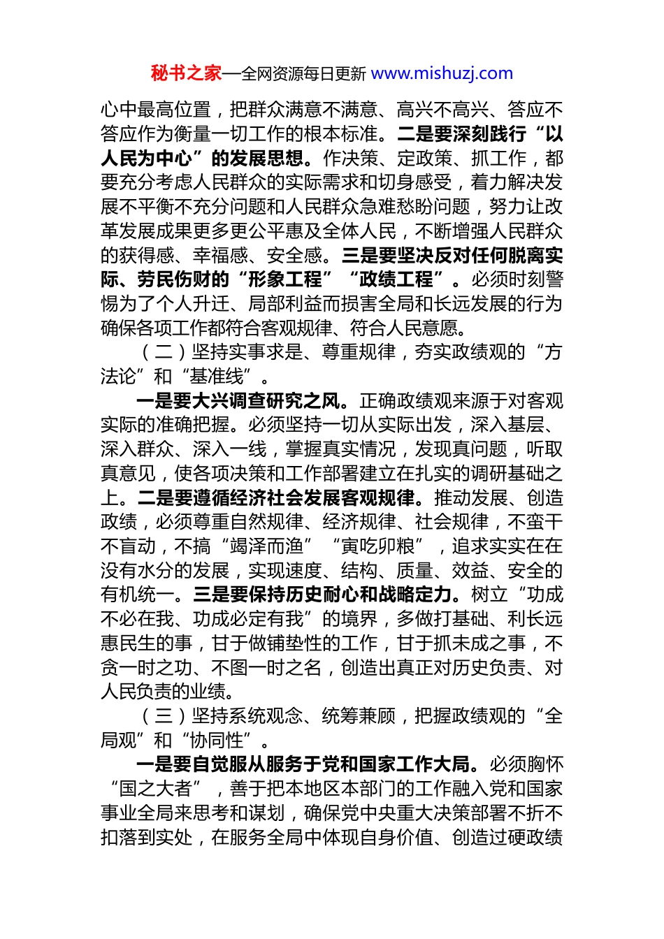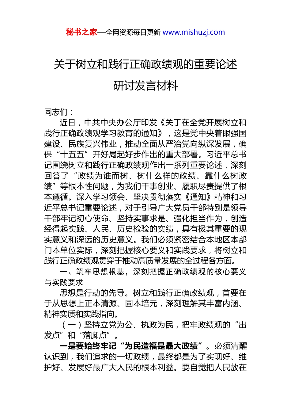 秘书之家—全网资源每日更新 www.mishuzj.com关于树立和践行正确政绩观的重要论述研讨发言材料同志们:近日,中共中央办公厅印发《关于在全党开展树立和践行正确政绩观学习教育的通知》,这是党中央着眼强国建设、民族复兴伟业,推动全面从严治党向纵深发展,确保“十五五”开好局起好步作出的重大部署。习近平总书记围绕树立和践行正确政绩观作出一系列重要论述,深刻回答了“政绩为谁而树、树什么样的政绩、靠什么树政绩”等根本性问题,为我们干事创业、履职尽责提供了根本遵循。深入学习领会、坚决贯彻落实《通知》精神和习近平总书记重要论述,对于引导广大党员干部特别是领导干部牢记初心使命、坚持实事求是、强化担当作为,创造经得起实践、人民、历史检验的实绩,具有极其重要的现实意义和深远的历史意义。我们必须紧密结合本地区本部门本单位实际,深刻把握核心要义和实践要求,将树立和践行正确政绩观贯穿于推动高质量发展的全过程各方面。一、筑牢思想根基,深刻把握正确政绩观的核心要义与实践要求思想是行动的先导。树立和践行正确政绩观,首要在于从思想上正本清源、固本培元,深刻理解其丰富内涵、精神实质和实践指向。(一)坚持立党为公、执政为民,把牢政绩观的“出发点”和“落脚点”。一是要始终牢记“为民造福是最大政绩”。必须清醒认识到,我们追求的一切政绩,最终都是为了实现好、维护好、发展好最广大人民的根本利益。要自觉把人民放在秘书之家—全网资源每日更新 www.mishuzj.com心中最高位置,把群众满意不满意、高兴不高兴、答应不答应作为衡量一切工作的根本标准。二是要深刻践行“以人民为中心”的发展思想。作决策、定政策、抓工作,都要充分考虑人民群众的实际需求和切身感受,着力解决发展不平衡不充分问题和人民群众急难愁盼问题,努力让改革发展成果更多更公平惠及全体人民,不断增强人民群众的获得感、幸福感、安全感。三是要坚决反对任何脱离实际、劳民伤财的“形象工程”“政绩工程”。必须时刻警惕为了个人升迁、局部利益而损害全局和长远发展的行为确保各项工作都符合客观规律、符合人民意愿。(二)坚持实事求是、尊重规律,夯实政绩观的“方法论”和“基准线”。一是要大兴调查研究之风。正确政绩观来源于对客观实际的准确把握。必须坚持一切从实际出发,深入基层、深入群众、深入一线,掌握真实情况,发现真问题,听取真意见,使各项决策和工作部署建立在扎实的调研基础之上。二是要遵循经济社会发展客观规律。推动发展、创造政绩,必须尊重自然规律、经济规律、社会规律,不蛮干不盲动,不搞“竭泽而渔”“寅吃卯粮”,追求实实在在没有水分的发展,实现速度、结构、质量、效益、安全的有机统一。三是要保持历史耐心和战略定力。树立“功成不必在我、功成必定有我”的境界,多做打基础、利长远惠民生的事,甘于做铺垫性的工作,甘于抓未成之事,不贪一时之功、不图一时之名,创造出真正对历史负责、对人民负责的业绩。(三)坚持系统观念、统筹兼顾,把握政绩观的“全局观”和“协同性”。一是要自觉服从服务于党和国家工作大局。必须胸怀“国之大者”,善于把本地区本部门的工作融入党和国家事业全局来思考和谋划,确保党中央重大决策部署不折不扣落到实处,在服务全局中体现自身价值、创造过硬政绩秘书之家—全网资源每日更新 www.mishuzj.com二是要完整、准确、全面贯彻新发展理念。将创新、协调、绿色、开放、共享的发展理念作为一个整体贯穿于政绩创造全过程,不能畸轻畸重,不能以牺牲环境、浪费资源、损害社会公平为代价换取经济增长。三是要注重工作的整体性和关联性。处理好当前与长远、局部与全局、发展与安全、重点与一般等重大关系,加强前瞻性思考、全局性谋划、战略性布局、整体性推进,实现发展质量、结构、规模、速度、效益、安全相统一。二、聚焦突出问题,深入查摆在政绩观上存在的偏差与不足对照《通知》要求和习近平总书记重要论述,我们必须坚持问题导向,发扬自我革命精神,深入查摆本地区本部门本单位在政绩观方面可能存在的偏差和深层次问题。(一)深入查摆是否存在“出发点”偏移的问题。一是查摆是否...