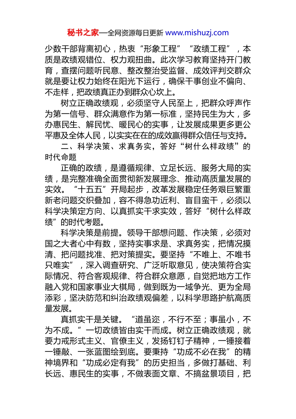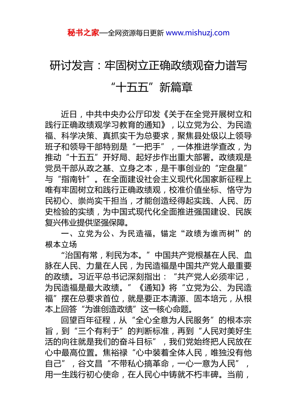秘书之家—全网资源每日更新 www.mishuzj.com研讨发言:牢固树立正确政绩观奋力谱写“十五五”新篇章近日,中共中央办公厅印发《关于在全党开展树立和践行正确政绩观学习教育的通知》,以立党为公、为民造福、科学决策、真抓实干为总要求,聚焦县处级以上领导班子和领导干部特别是“一把手”,一体推进学查改,为推动“十五五”开好局、起好步作出重大部署。政绩观是党员干部从政之基、立身之本,是干事创业的“定盘星”与“指南针”。在全面建设社会主义现代化国家新征程上唯有牢固树立和践行正确政绩观,校准价值坐标、恪守为民初心、崇尚实干担当,才能创造经得起实践、人民、历史检验的实绩,为中国式现代化全面推进强国建设、民族复兴伟业提供坚强保障。一、立党为公、为民造福,锚定“政绩为谁而树”的根本立场“治国有常,利民为本。”中国共产党根基在人民、血脉在人民、力量在人民,为民造福是中国共产党人最重要的政绩。习近平总书记深刻指出:“共产党人必须牢记,为民造福是最大政绩。”《通知》将“立党为公、为民造福”摆在总要求首位,就是要正本清源、固本培元,从根本上回答“为谁创造政绩”这一核心命题。回望百年征程,从“全心全意为人民服务”的根本宗旨,到“三个有利于”的判断标准,再到“人民对美好生活的向往就是我们的奋斗目标”,我们党始终把人民放在心中最高位置。焦裕禄“心中装着全体人民,唯独没有他自己”,谷文昌“不带私心搞革命,一心一意为人民”,用一生践行初心使命,在人民心中铸就不朽丰碑。当前,秘书之家—全网资源每日更新 www.mishuzj.com少数干部背离初心,热衷“形象工程”“政绩工程”,本质是政绩观错位、权力观扭曲。此次学习教育坚持开门教育,查摆问题听民意、整改整治受监督、成效评判交群众就是要让权力始终在阳光下运行,确保干事创业不偏向、不走样,把政绩真正办到群众心坎上。树立正确政绩观,必须坚守人民至上,把群众呼声作为第一信号、群众满意作为第一标准,坚持民生为大,多办惠民生、解民忧、暖民心的实事,让发展成果更多更公平惠及全体人民,以实实在在的成效赢得群众信任与支持。二、科学决策、求真务实,答好“树什么样政绩”的时代命题正确的政绩,是遵循规律、立足长远、服务大局的实绩,是完整准确全面贯彻新发展理念、推动高质量发展的实效。“十五五”开局起步,改革发展稳定任务艰巨繁重新老问题交织叠加,容不得急功近利、盲目蛮干,必须以科学决策定方向、以真抓实干求实效,答好“树什么样政绩”的时代考题。科学决策是前提。领导干部想问题、作决策,必须对国之大者心中有数,坚持实事求是、求真务实,把情况摸清、把问题找准、把对策提实。要坚持“不唯上、不唯书只唯实”,深入调查研究、广泛听取意见,使决策符合实际情况、符合客观规律、符合群众意愿,自觉把地方工作融入党和国家事业大棋局,做到既为一域争光、更为全局添彩,坚决防范和纠治政绩观偏差,以科学思路护航高质量发展。真抓实干是关键。“道虽迩,不行不至;事虽小,不为不成。”一切政绩皆由实干而成。树立正确政绩观,就要力戒形式主义、官僚主义,发扬钉钉子精神,一锤接着一锤敲、一张蓝图绘到底。要秉持“功成不必在我”的精神境界和“功成必定有我”的历史担当,多做打基础、利长远、惠民生的实事,不做表面文章、不搞盆景项目,把秘书之家—全网资源每日更新 www.mishuzj.com党中央决策部署与“十五五”规划实施紧密结合,转化为推动发展的具体行动,确保各项任务落地生根、开花结果。三、严字当头、一体推进,夯实“靠什么树政绩”的实践保障树立和践行正确政绩观,关键在领导干部、重点在关键少数、要害在常态长效。此次学习教育以县处级以上领导班子和领导干部特别是“一把手”为重点,抓住了引领示范的核心;以一体推进学查改为抓手,突出了问题导向与系统观念,为端正政绩观、创造真政绩提供坚实保障。善禁者,先禁其身而后人。领导干部尤其是“一把手”的政绩观,直接影响一个地方、一个单位的发展导向与干事生态。其身正,不令而行;其身不正,虽令不从。各级领导干部要带头深学细悟习近平总书记关于树立和践...