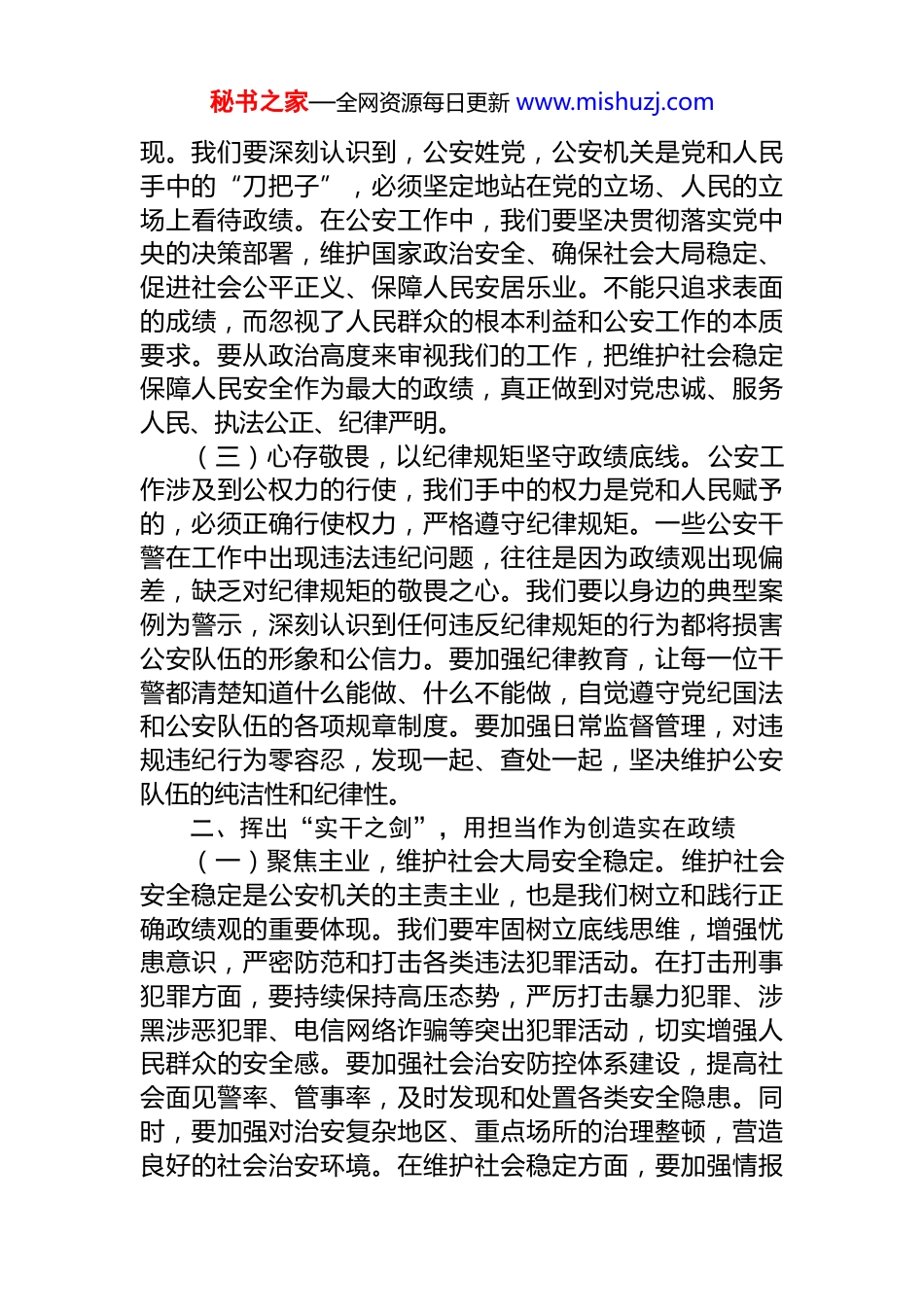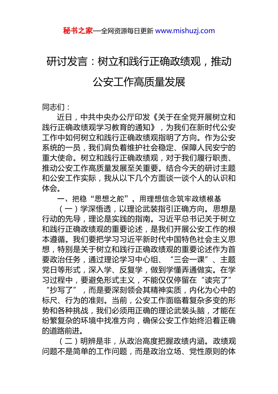 秘书之家—全网资源每日更新 www.mishuzj.com研讨发言:树立和践行正确政绩观,推动公安工作高质量发展同志们:近日,中共中央办公厅印发《关于在全党开展树立和践行正确政绩观学习教育的通知》,为我们在新时代公安工作中如何树立和践行正确政绩观指明了方向。作为公安系统的一员,我们肩负着维护社会稳定、保障人民安宁的重大使命。树立和践行正确政绩观,对于我们履行职责、推动公安工作高质量发展至关重要。结合今天的研讨主题和公安工作实际,我从以下几个方面谈一谈个人的认识和体会。一、把稳“思想之舵”,用理想信念筑牢政绩根基(一)学深悟透,以理论武装指引正确方向。思想是行动的先导,理论是实践的指南。习近平总书记关于树立和践行正确政绩观的重要论述,是我们开展公安工作的根本遵循。我们要把学习习近平新时代中国特色社会主义思想,特别是关于树立和践行正确政绩观的重要论述作为首要政治任务,通过理论学习中心组、“三会一课”、主题党日等形式,深入学、反复学,做到学懂弄通做实。在学习过程中,要避免形式主义,不能仅仅停留在“读完了”“抄写了”,而是要深刻领会其精神实质,内化为心中的标尺、行为的准则。当前,公安工作面临着复杂多变的形势和各种挑战,我们必须用正确的理论武装头脑,才能在纷繁复杂的环境中找准方向,确保公安工作始终沿着正确的道路前进。(二)明辨是非,从政治高度把握政绩内涵。政绩观问题不是简单的工作问题,而是政治立场、党性原则的体秘书之家—全网资源每日更新 www.mishuzj.com现。我们要深刻认识到,公安姓党,公安机关是党和人民手中的“刀把子”,必须坚定地站在党的立场、人民的立场上看待政绩。在公安工作中,我们要坚决贯彻落实党中央的决策部署,维护国家政治安全、确保社会大局稳定、促进社会公平正义、保障人民安居乐业。不能只追求表面的成绩,而忽视了人民群众的根本利益和公安工作的本质要求。要从政治高度来审视我们的工作,把维护社会稳定保障人民安全作为最大的政绩,真正做到对党忠诚、服务人民、执法公正、纪律严明。(三)心存敬畏,以纪律规矩坚守政绩底线。公安工作涉及到公权力的行使,我们手中的权力是党和人民赋予的,必须正确行使权力,严格遵守纪律规矩。一些公安干警在工作中出现违法违纪问题,往往是因为政绩观出现偏差,缺乏对纪律规矩的敬畏之心。我们要以身边的典型案例为警示,深刻认识到任何违反纪律规矩的行为都将损害公安队伍的形象和公信力。要加强纪律教育,让每一位干警都清楚知道什么能做、什么不能做,自觉遵守党纪国法和公安队伍的各项规章制度。要加强日常监督管理,对违规违纪行为零容忍,发现一起、查处一起,坚决维护公安队伍的纯洁性和纪律性。二、挥出“实干之剑”,用担当作为创造实在政绩(一)聚焦主业,维护社会大局安全稳定。维护社会安全稳定是公安机关的主责主业,也是我们树立和践行正确政绩观的重要体现。我们要牢固树立底线思维,增强忧患意识,严密防范和打击各类违法犯罪活动。在打击刑事犯罪方面,要持续保持高压态势,严厉打击暴力犯罪、涉黑涉恶犯罪、电信网络诈骗等突出犯罪活动,切实增强人民群众的安全感。要加强社会治安防控体系建设,提高社会面见警率、管事率,及时发现和处置各类安全隐患。同时,要加强对治安复杂地区、重点场所的治理整顿,营造良好的社会治安环境。在维护社会稳定方面,要加强情报秘书之家—全网资源每日更新 www.mishuzj.com信息工作,及时掌握社会动态和不稳定因素,做到提前预警、主动防范。要妥善处置各类突发事件和群体性事件,依法维护社会秩序,确保社会大局稳定。(二)服务群众,提升人民群众满意度。人民公安为人民,服务群众是公安机关的根本宗旨。我们要把人民群众的满意度作为衡量公安工作政绩的重要标准,不断改进服务方式,提高服务质量。要加强户籍管理、出入境管理交通管理等窗口服务工作,简化办事流程,提高办事效率为群众提供更加便捷、高效、优质的服务。要深入开展“我为群众办实事”实践活动,积极主动为群众排忧解难解决群众关心的热点难点问题。同时,要加强与群众的沟通交流,倾听群众的意见和...