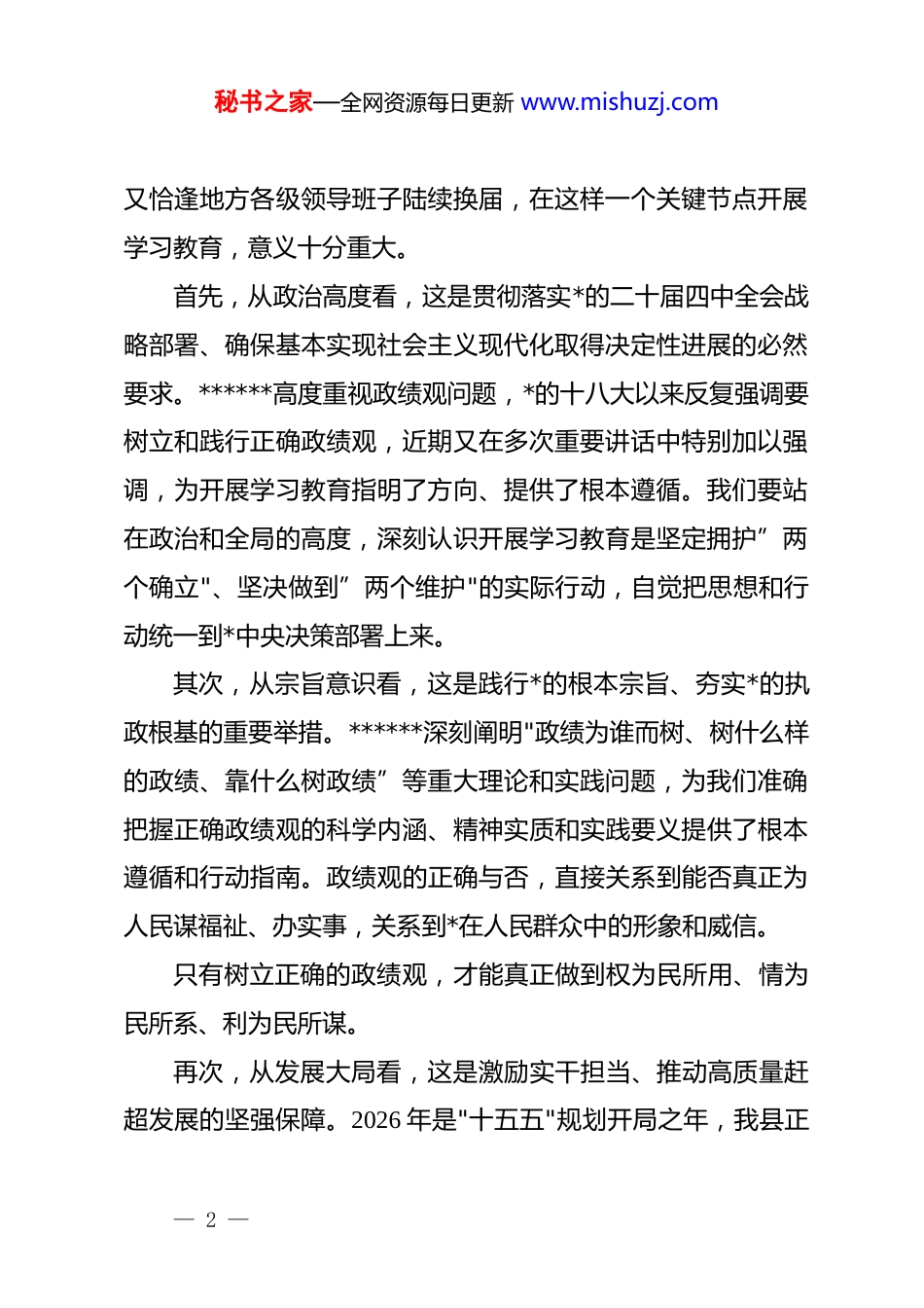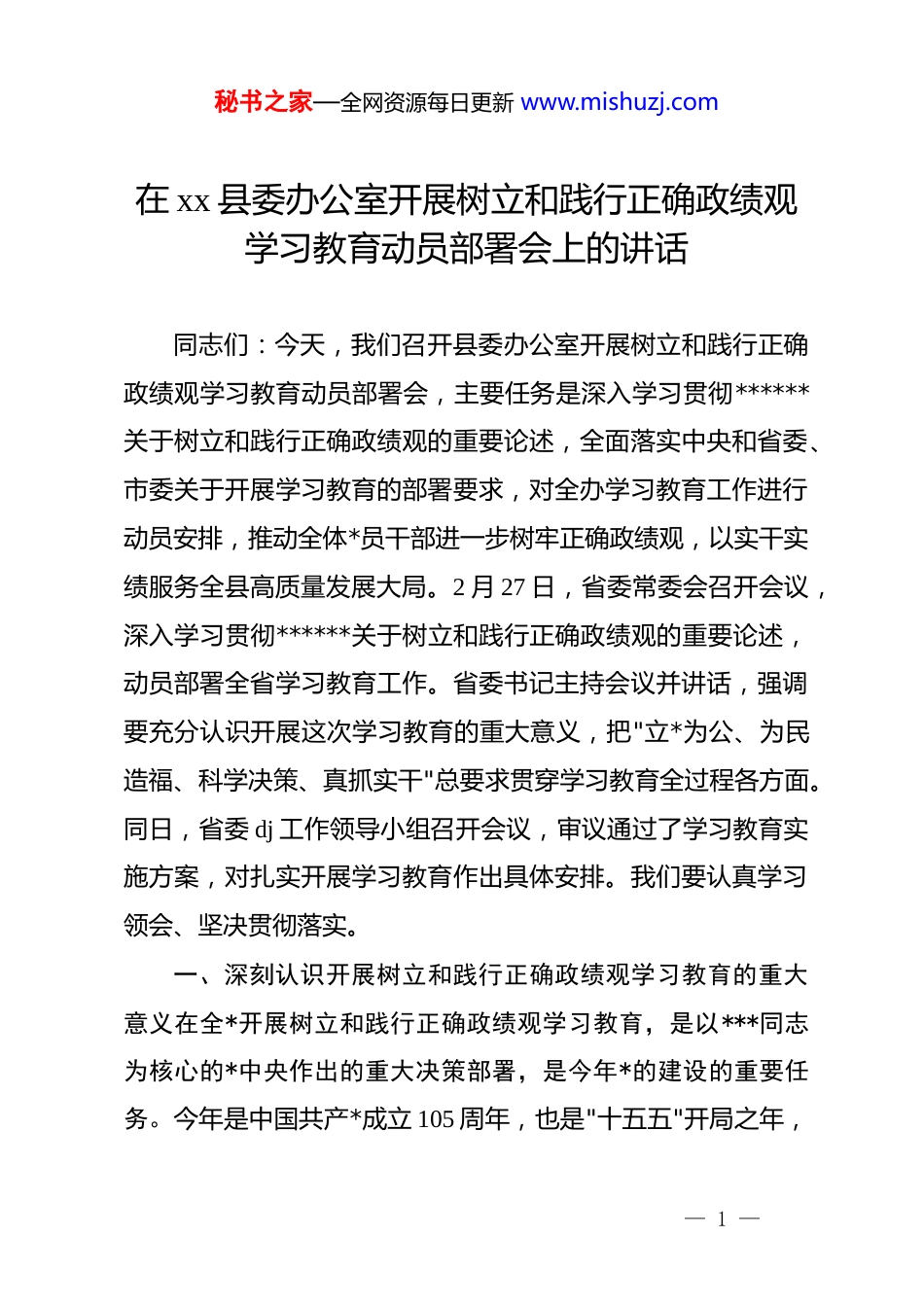 秘书之家—全网资源每日更新 www.mishuzj.com在 xx 县委办公室开展树立和践行正确政绩观学习教育动员部署会上的讲话同志们:今天,我们召开县委办公室开展树立和践行正确政绩观学习教育动员部署会,主要任务是深入学习贯彻******关于树立和践行正确政绩观的重要论述,全面落实中央和省委、市委关于开展学习教育的部署要求,对全办学习教育工作进行动员安排,推动全体*员干部进一步树牢正确政绩观,以实干实绩服务全县高质量发展大局。2 月 27 日,省委常委会召开会议,深入学习贯彻******关于树立和践行正确政绩观的重要论述,动员部署全省学习教育工作。省委书记主持会议并讲话,强调要充分认识开展这次学习教育的重大意义,把"立*为公、为民造福、科学决策、真抓实干"总要求贯穿学习教育全过程各方面。同日,省委 dj 工作领导小组召开会议,审议通过了学习教育实施方案,对扎实开展学习教育作出具体安排。我们要认真学习领会、坚决贯彻落实。一、深刻认识开展树立和践行正确政绩观学习教育的重大意义在全*开展树立和践行正确政绩观学习教育,是以***同志为核心的*中央作出的重大决策部署,是今年*的建设的重要任务。今年是中国共产*成立 105 周年,也是"十五五"开局之年,— 1 —秘书之家—全网资源每日更新 www.mishuzj.com又恰逢地方各级领导班子陆续换届,在这样一个关键节点开展学习教育,意义十分重大。首先,从政治高度看,这是贯彻落实*的二十届四中全会战略部署、确保基本实现社会主义现代化取得决定性进展的必然要求。******高度重视政绩观问题,*的十八大以来反复强调要树立和践行正确政绩观,近期又在多次重要讲话中特别加以强调,为开展学习教育指明了方向、提供了根本遵循。我们要站在政治和全局的高度,深刻认识开展学习教育是坚定拥护”两个确立"、坚决做到”两个维护"的实际行动,自觉把思想和行动统一到*中央决策部署上来。其次,从宗旨意识看,这是践行*的根本宗旨、夯实*的执政根基的重要举措。******深刻阐明"政绩为谁而树、树什么样的政绩、靠什么树政绩”等重大理论和实践问题,为我们准确把握正确政绩观的科学内涵、精神实质和实践要义提供了根本遵循和行动指南。政绩观的正确与否,直接关系到能否真正为人民谋福祉、办实事,关系到*在人民群众中的形象和威信。只有树立正确的政绩观,才能真正做到权为民所用、情为民所系、利为民所谋。再次,从发展大局看,这是激励实干担当、推动高质量赶超发展的坚强保障。2026 年是"十五五"规划开局之年,我县正— 2 —秘书之家—全网资源每日更新 www.mishuzj.com处于经济社会发展的关键时期,围绕”一心五城"目标,推进城市建设、产业发展、生态保护、乡村振兴、民生保障等重点工作任—2—务繁重。只有树立和践行正确政绩观,才能引导广大*员干部坚持实事求是、求真务实,创造经得起实践、人民、历史检验的实绩,推动"十五五"开好局、起好步。最后,从*的建设看,这是巩固拓展*内集中学习教育成果、持之以恒推进全面从严治*的有效途径。近年来,我们先后开展了*的群众路线教育实践活动、"三严三实"专题教育、"两学一做"学习教育、"不忘初心、牢记使命”zt 教育、*史学习教育等一系列学习教育,取得了显著成效。开展树立和践行正确政绩观学习教育,是*内集中学习教育的延续和深化,对于推进全面从严治*向纵深发展具有重大意义。县委办公室作为县委的综合办事机构,处于承上启下、协调左右的中枢位置,承担着服务县委决策、统筹协调各方、督促检查落实等重要职能,在全县工作大局中地位特殊、责任重大。办公室*员干部的政绩观正确与否,不仅直接关系到办公室各项工作质量和效率,更关系到县委决策部署的贯彻落实,关系到全县改革发展稳定大局。全办*员干部要从讲政治的高度,深刻认识开展学习教育的重大意义,切实增强思想自觉、政治自觉、行动自觉,以高度负责的态度把学习教育组织好、开展— 3 —秘书之家—全网资源每日更新 www.mishuzj.com好、实施好。二、准确把握学习教育的目标要求和工作安排开展树立和践行正确政绩观学习教育,要坚持以**************思想为指导,深入贯彻*的二十大和...