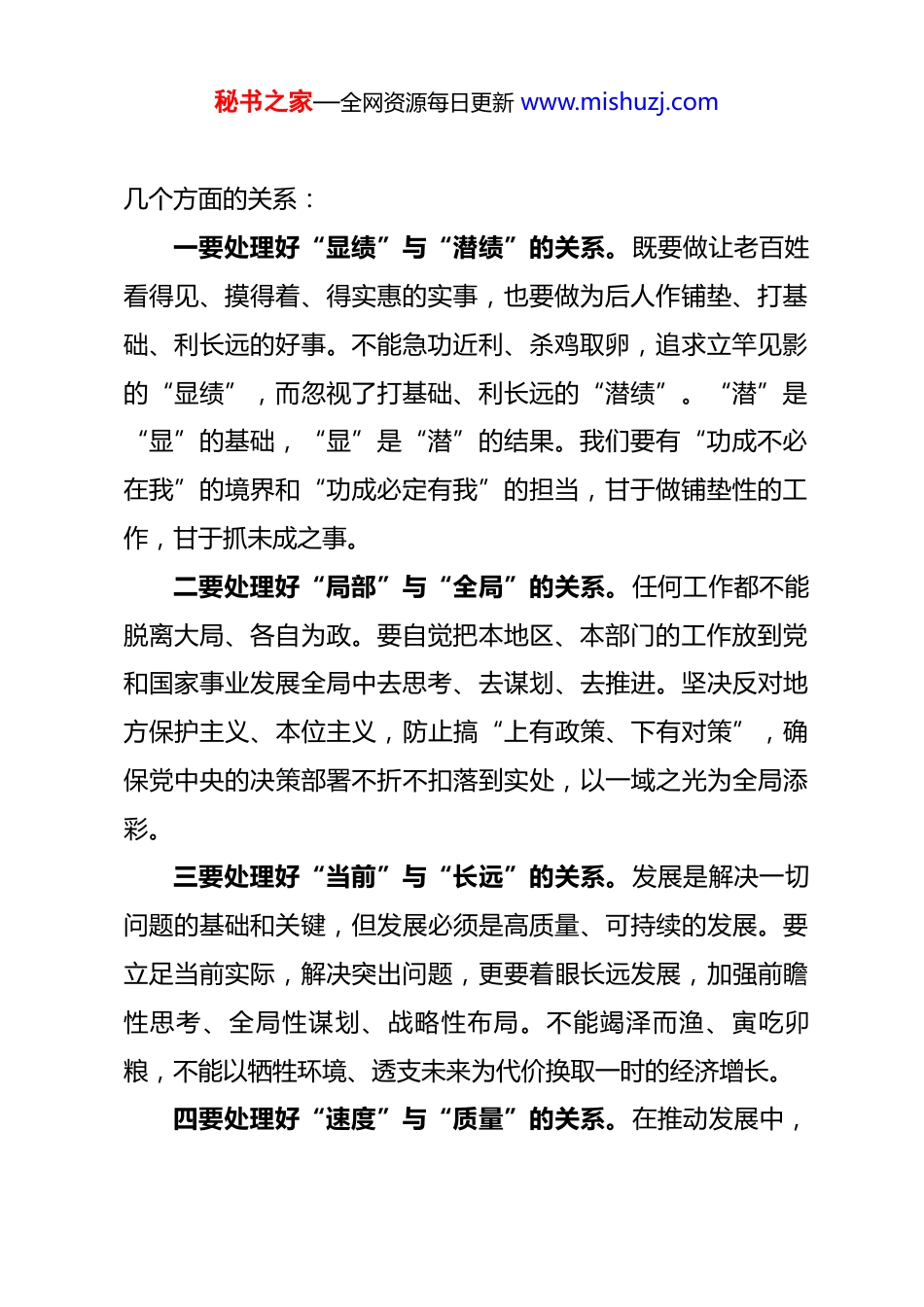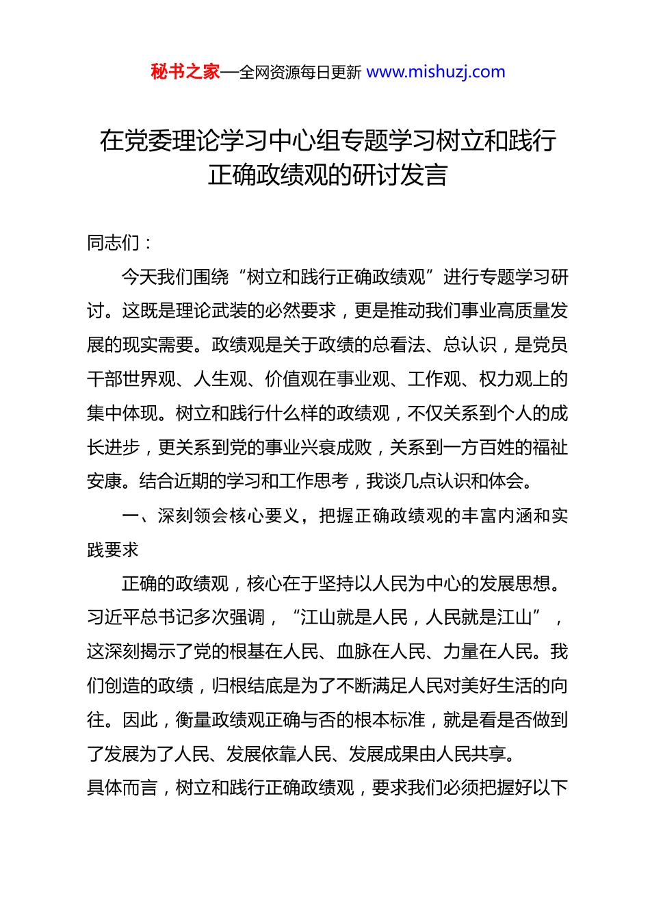 秘书之家—全网资源每日更新 www.mishuzj.com在党委理论学习中心组专题学习树立和践行正确政绩观的研讨发言同志们:今天我们围绕“树立和践行正确政绩观”进行专题学习研讨。这既是理论武装的必然要求,更是推动我们事业高质量发展的现实需要。政绩观是关于政绩的总看法、总认识,是党员干部世界观、人生观、价值观在事业观、工作观、权力观上的集中体现。树立和践行什么样的政绩观,不仅关系到个人的成长进步,更关系到党的事业兴衰成败,关系到一方百姓的福祉安康。结合近期的学习和工作思考,我谈几点认识和体会。一、深刻领会核心要义,把握正确政绩观的丰富内涵和实践要求正确的政绩观,核心在于坚持以人民为中心的发展思想。习近平总书记多次强调,“江山就是人民,人民就是江山”,这深刻揭示了党的根基在人民、血脉在人民、力量在人民。我们创造的政绩,归根结底是为了不断满足人民对美好生活的向往。因此,衡量政绩观正确与否的根本标准,就是看是否做到了发展为了人民、发展依靠人民、发展成果由人民共享。具体而言,树立和践行正确政绩观,要求我们必须把握好以下秘书之家—全网资源每日更新 www.mishuzj.com几个方面的关系:一要处理好“显绩”与“潜绩”的关系。既要做让老百姓看得见、摸得着、得实惠的实事,也要做为后人作铺垫、打基础、利长远的好事。不能急功近利、杀鸡取卵,追求立竿见影的“显绩”,而忽视了打基础、利长远的“潜绩”。“潜”是“显”的基础,“显”是“潜”的结果。我们要有“功成不必在我”的境界和“功成必定有我”的担当,甘于做铺垫性的工作,甘于抓未成之事。二要处理好“局部”与“全局”的关系。任何工作都不能脱离大局、各自为政。要自觉把本地区、本部门的工作放到党和国家事业发展全局中去思考、去谋划、去推进。坚决反对地方保护主义、本位主义,防止搞“上有政策、下有对策”,确保党中央的决策部署不折不扣落到实处,以一域之光为全局添彩。三要处理好“当前”与“长远”的关系。发展是解决一切问题的基础和关键,但发展必须是高质量、可持续的发展。要立足当前实际,解决突出问题,更要着眼长远发展,加强前瞻性思考、全局性谋划、战略性布局。不能竭泽而渔、寅吃卯粮,不能以牺牲环境、透支未来为代价换取一时的经济增长。四要处理好“速度”与“质量”的关系。在推动发展中,秘书之家—全网资源每日更新 www.mishuzj.com要保持一定的增长速度,但绝不能唯 GDP 论英雄。要完整、准确、全面贯彻新发展理念,把发展质量问题摆在更为突出的位置,着力推动创新发展、协调发展、绿色发展、开放发展、共享发展,努力实现更高质量、更有效率、更加公平、更可持续、更为安全的发展。二、坚持问题导向,深刻检视政绩观方面存在的偏差和不足对照正确政绩观的要求,我们必须清醒地认识到,在实际工作中,一些党员干部在政绩观上还存在这样那样的问题,需要我们高度重视、深刻反思、切实加以纠正。一要检视否存在“急功近利”的倾向。有的干部热衷于搞“短平快”项目,喜欢做“显山露水”的事,对周期长、见效慢的基础性工作缺乏耐心和恒心,甚至搞“形象工程”、“政绩工程”,追求表面的轰轰烈烈,不顾实际效果和群众感受。二要检视是否存在“重硬轻软”的倾向。有的干部把主要精力放在看得见、摸得着的硬件建设上,对优化营商环境、提升治理效能、涵养文明风尚等“软实力”建设重视不够、投入不足,导致发展不平衡、不协调。三要检视是否存在“重上轻下”的倾向。有的干部只注重对上负责,看上级眼色行事,热衷于搞“亮点”、出“经秘书之家—全网资源每日更新 www.mishuzj.com验”,希望得到上级的肯定和表扬,而对群众的急难愁盼问题关心不够、解决不力,甚至脱离实际、脱离群众。四要检视是否存在“因循守旧”的倾向。有的干部思想不够解放,习惯于按部就班、墨守成规,缺乏改革创新、攻坚克难的锐气和担当,面对新形势新任务新要求,办法不多、措施不实,工作打不开局面。五要检视是否存在“统计造假”的倾向。有的干部为了追求所谓的“政绩”,在数据上动脑筋、做文章,虚报浮夸、弄虚作假,不仅误导决策,更严重损害了党和...
