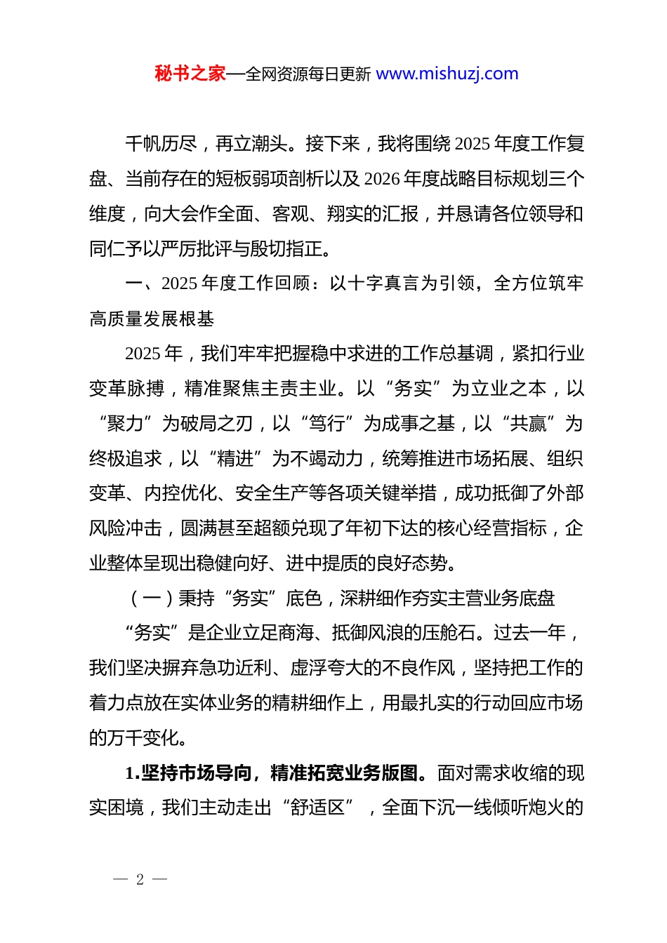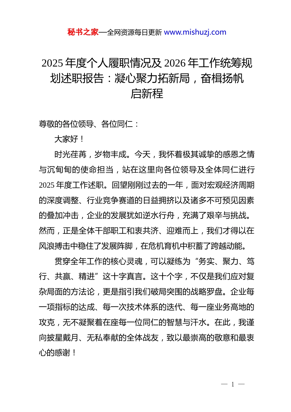 秘书之家—全网资源每日更新 www.mishuzj.com2025 年度个人履职情况及 2026 年工作统筹规划述职报告:凝心聚力拓新局,奋楫扬帆启新程尊敬的各位领导、各位同仁:大家好!时光荏苒,岁物丰成。今天,我怀着极其诚挚的感恩之情与沉甸甸的使命担当,站在这里向各位领导及全体同仁进行2025 年度工作述职。回望刚刚过去的一年,面对宏观经济周期的深度调整、行业竞争赛道的日益拥挤以及诸多不可预见因素的叠加冲击,企业的发展犹如逆水行舟,充满了艰辛与挑战。然而,正是全体干部职工和衷共济、迎难而上,我们才得以在风浪搏击中稳住了发展阵脚,在危机育机中积蓄了跨越动能。贯穿全年工作的核心灵魂,可以凝练为“务实、聚力、笃行、共赢、精进”这十字真言。这十个字,不仅是我们应对复杂局面的方法论,更是指引我们破局突围的战略罗盘。企业每一项指标的达成、每一次技术体系的迭代、每一座业务高地的攻克,无不凝聚着在座每一位同仁的智慧与汗水。在此,我谨向披星戴月、无私奉献的全体战友,致以最崇高的敬意和最衷心的感谢!— 1 —秘书之家—全网资源每日更新 www.mishuzj.com千帆历尽,再立潮头。接下来,我将围绕 2025 年度工作复盘、当前存在的短板弱项剖析以及 2026 年度战略目标规划三个维度,向大会作全面、客观、翔实的汇报,并恳请各位领导和同仁予以严厉批评与殷切指正。一、2025 年度工作回顾:以十字真言为引领,全方位筑牢高质量发展根基2025 年,我们牢牢把握稳中求进的工作总基调,紧扣行业变革脉搏,精准聚焦主责主业。以“务实”为立业之本,以“聚力”为破局之刃,以“笃行”为成事之基,以“共赢”为终极追求,以“精进”为不竭动力,统筹推进市场拓展、组织变革、内控优化、安全生产等各项关键举措,成功抵御了外部风险冲击,圆满甚至超额兑现了年初下达的核心经营指标,企业整体呈现出稳健向好、进中提质的良好态势。(一)秉持“务实”底色,深耕细作夯实主营业务底盘“务实”是企业立足商海、抵御风浪的压舱石。过去一年,我们坚决摒弃急功近利、虚浮夸大的不良作风,坚持把工作的着力点放在实体业务的精耕细作上,用最扎实的行动回应市场的万千变化。1.坚持市场导向,精准拓宽业务版图。面对需求收缩的现实困境,我们主动走出“舒适区”,全面下沉一线倾听炮火的— 2 —秘书之家—全网资源每日更新 www.mishuzj.com声音。年内专项抽调精锐力量组建了 xx 个深度调研突击队,横向拉通上下游产业链条,纵向深挖细分领域的潜在高价值需求。通过科学研判市场走势,我们果断优化了产品线供应结构,剔除了低效产能。经过一年的艰苦鏖战,全年成功拓展优质战略合作伙伴 xx 家,核心主力产品在区域市场的占有率逆势上扬 xx个百分点;全年累计实现营业总收入突破 xx 万元大关,较上一年度强劲增长 xx%,不仅超额完成了年度挑战目标,更在局部市场形成了压倒性的竞争优势。2.强化控本增效,全面优化供应链条。在开源的同时,我们秉持“精打细算、极限降本”的管理哲学,向内部运营要效益。全面重塑了物资采购与供应链管理体系,引入了更为严苛的供应商准入与分级动态评价机制。通过扩大集中采购规模、签订长期战略锁价协议等前瞻性举措,大幅压降了核心生产要素的采购单价。此外,我们大刀阔斧地开展了内部流程“瘦身”行动,坚决砍掉一切不产生增值效益的冗余环节,实施全口径预算刚性约束。数据显示,2025 年企业整体运营成本率同比下降了 xx%,真正实现了营收规模与净利润水平的“双轮驱动”与同步拉升。这种脚踏实地的务实作风,为企业储备了充沛的现金流“越冬粮”。(二)激活“聚力”引擎,多措并举锻造高效协同战队— 3 —秘书之家—全网资源每日更新 www.mishuzj.com单丝不成线,独木不成林。“聚力”二字,揭示了现代企业组织效能倍增的底层密码。2025 年,我们将打破组织孤岛、凝聚全员意志作为内部人力资源管理的重中之重,力求打造一支指战一体、无坚不摧的铁军。1.破除部门藩篱,构建跨界协同机制。针对以往内部协作中存在的“部门墙”厚重、推诿扯皮现象,我们大刀阔斧地推进了组织机制再造。建立健全了跨域融合的...