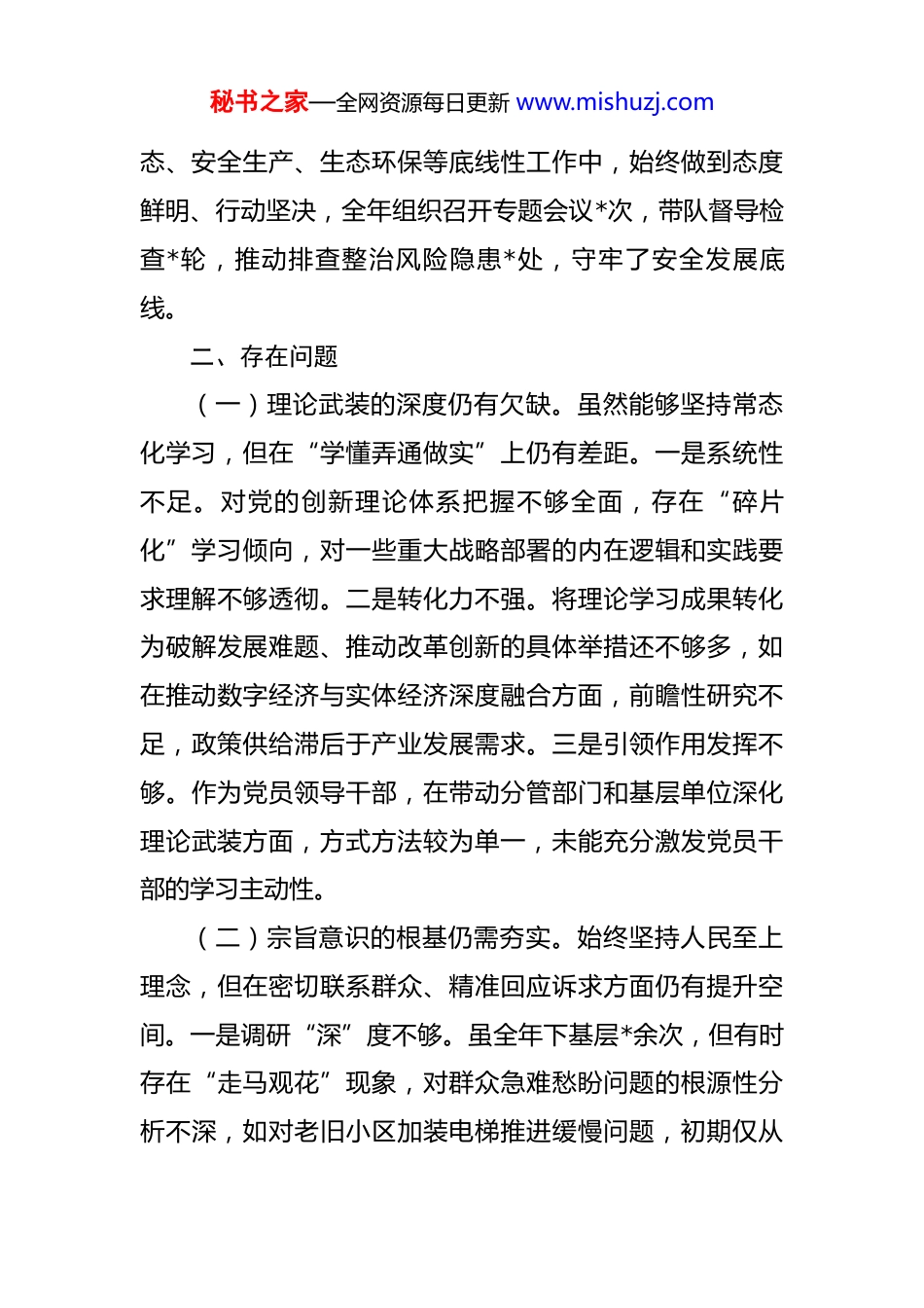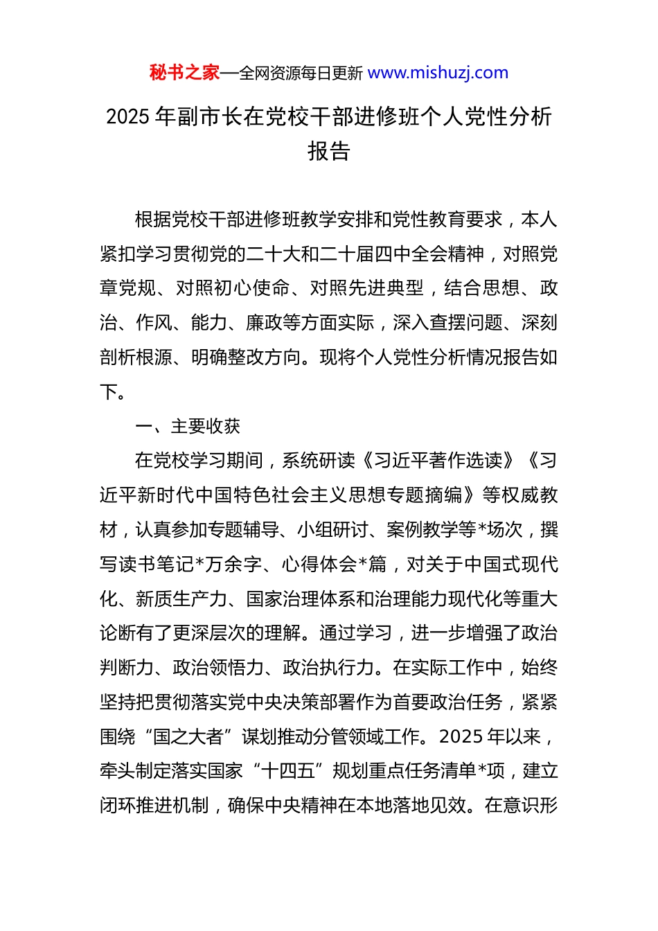 秘书之家—全网资源每日更新 www.mishuzj.com2025 年副市长在党校干部进修班个人党性分析报告 根据党校干部进修班教学安排和党性教育要求,本人紧扣学习贯彻党的二十大和二十届四中全会精神,对照党章党规、对照初心使命、对照先进典型,结合思想、政治、作风、能力、廉政等方面实际,深入查摆问题、深刻剖析根源、明确整改方向。现将个人党性分析情况报告如下。一、主要收获在党校学习期间,系统研读《习近平著作选读》《习近平新时代中国特色社会主义思想专题摘编》等权威教材,认真参加专题辅导、小组研讨、案例教学等*场次,撰写读书笔记*万余字、心得体会*篇,对关于中国式现代化、新质生产力、国家治理体系和治理能力现代化等重大论断有了更深层次的理解。通过学习,进一步增强了政治判断力、政治领悟力、政治执行力。在实际工作中,始终坚持把贯彻落实党中央决策部署作为首要政治任务,紧紧围绕“国之大者”谋划推动分管领域工作。2025 年以来,牵头制定落实国家“十四五”规划重点任务清单*项,建立闭环推进机制,确保中央精神在本地落地见效。在意识形秘书之家—全网资源每日更新 www.mishuzj.com态、安全生产、生态环保等底线性工作中,始终做到态度鲜明、行动坚决,全年组织召开专题会议*次,带队督导检查*轮,推动排查整治风险隐患*处,守牢了安全发展底线。二、存在问题(一)理论武装的深度仍有欠缺。虽然能够坚持常态化学习,但在“学懂弄通做实”上仍有差距。一是系统性不足。对党的创新理论体系把握不够全面,存在“碎片化”学习倾向,对一些重大战略部署的内在逻辑和实践要求理解不够透彻。二是转化力不强。将理论学习成果转化为破解发展难题、推动改革创新的具体举措还不够多,如在推动数字经济与实体经济深度融合方面,前瞻性研究不足,政策供给滞后于产业发展需求。三是引领作用发挥不够。作为党员领导干部,在带动分管部门和基层单位深化理论武装方面,方式方法较为单一,未能充分激发党员干部的学习主动性。(二)宗旨意识的根基仍需夯实。始终坚持人民至上理念,但在密切联系群众、精准回应诉求方面仍有提升空间。一是调研“深”度不够。虽全年下基层*余次,但有时存在“走马观花”现象,对群众急难愁盼问题的根源性分析不深,如对老旧小区加装电梯推进缓慢问题,初期仅从秘书之家—全网资源每日更新 www.mishuzj.com资金、审批层面考虑,未充分听取低层住户意见,导致部分项目推进受阻。二是服务“实”效不足。在推动民生项目落地中,存在重“建设完成”、轻“使用体验”倾向,如某社区养老服务中心建成后,因运营机制不健全,服务供给与老人实际需求存在错配。三是回应“速”度不快。对通过 12345 热线、信访平台等渠道反映的问题,虽建立交办机制,但个别事项跟踪督办不够及时,群众满意度未达预期。(三)担当作为的锐气仍需提升。面对高质量发展新形势新任务,攻坚克难的闯劲和韧劲有待加强。一是在破解历史遗留问题上存在“求稳”心态。如对某工业园区环保整改问题,因涉及多方利益,前期推进力度不够,存在“等一等、看一看”思想,直到纳入省级督办后才加快节奏。二是在推动改革创新上存在“路径依赖”。面对新经济新业态带来的治理挑战,如平台用工权益保障、数据要素市场化配置等,习惯沿用传统管理思维,制度创新步伐滞后。三是在统筹发展和安全上存在“短板意识”不强。对极端天气、公共卫生等突发风险的预判和应急准备不足,应急预案实操性有待提升。(四)纪律作风的堤坝仍需加固。能够严格遵守党的政治纪律和政治规矩,但在细节小节上自我要求不够严秘书之家—全网资源每日更新 www.mishuzj.com苛。一是形式主义顽疾仍未根除。在文件会议精简方面,虽较上年下降*%,但个别工作仍存在以“留痕”代替落实现象,如对基层报表要求过多,增加一线负担。二是斗争精神有所弱化。对分管领域个别干部存在的“躺平”“佛系”现象,批评教育多、动真碰硬少,未能有效激发队伍活力。三是家风建设重视不够。对配偶、子女的日常教育提醒多停留在“不违规”层面,对其社会交往、职业选择等深层次引导不足。(五)能力本领的恐慌仍需正视。面对新...