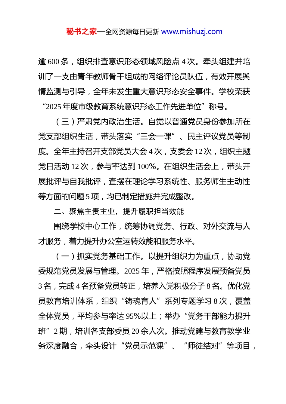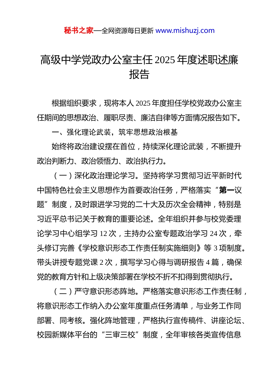 秘书之家—全网资源每日更新 www.mishuzj.com高级中学党政办公室主任 2025 年度述职述廉报告 根据组织要求,现将本人 2025 年度担任学校党政办公室主任期间的思想政治、履职尽责、廉洁自律等方面情况报告如下。一、强化理论武装,筑牢思想政治根基始终将政治建设摆在首位,持续深化理论武装,不断提升政治判断力、政治领悟力、政治执行力。(一)深化政治理论学习。坚持将学习贯彻习近平新时代中国特色社会主义思想作为首要政治任务,严格落实“第一议题”制度,及时跟进学习党的二十大及历次全会精神,特别是习近平总书记关于教育的重要论述。全年组织并参与校党委理论学习中心组学习 12 次,主持办公室专题政治学习 24 次,牵头修订完善《学校意识形态工作责任制实施细则》等 3 项制度。带头讲授专题党课 2 次,撰写学习心得与调研报告 4 篇,确保党的教育方针和上级决策部署在学校不折不扣得到贯彻执行。(二)严守意识形态阵地。严格落实意识形态工作责任制,将意识形态工作纳入办公室年度重点任务清单,与业务工作同部署、同考核。强化阵地管理,严格执行宣传稿件、讲座论坛、校园新媒体平台的“三审三校”制度,全年审核各类宣传信息秘书之家—全网资源每日更新 www.mishuzj.com逾 600 条,组织排查意识形态领域风险点 4 次。牵头组建并培训了一支由青年教师骨干组成的网络评论员队伍,有效开展舆情监测与引导,全年未发生重大意识形态安全事件。学校荣获“2025 年度市级教育系统意识形态工作先进单位”称号。(三)严肃党内政治生活。自觉以普通党员身份参加所在党支部组织生活,带头落实“三会一课”、民主评议党员等制度。全年主持召开支部党员大会 4 次,支委会 12 次,组织主题党日活动 12 次,参与率达到 100%。在组织生活会上,带头开展批评与自我批评,查摆在理论学习系统性、服务师生主动性等方面的问题 5 项,均已制定措施并完成整改。二、聚焦主责主业,提升履职担当效能围绕学校中心工作,统筹协调党务、行政、对外交流与人才服务,着力提升办公室运转效能和服务水平。(一)抓实党务基础工作。以提升组织力为重点,协助党委规范党员发展与管理。2025 年,严格按照程序发展预备党员3 名,完成 4 名预备党员转正,培养入党积极分子 8 名。优化党员教育培训体系,组织“铸魂育人”系列专题学习 8 次,覆盖全体党员,平均参与率达 95%以上;举办“党务干部能力提升班”2 期,培训各支部委员 20 余人次。推动党建与教育教学业务深度融合,牵头设计“党员示范课”、“师徒结对”等项目,秘书之家—全网资源每日更新 www.mishuzj.com将党员先锋模范作用量化考核,相关案例入选市级中小学党建创新案例库。(二)优化办公室行政运转。致力于提升行政效能,大力推动办公数字化转型。全面启用协同办公(OA)系统与电子档案系统,实现公文流转、审批、归档全流程线上办理。2025 年度,通过 OA 系统处理各类文件通知 1250 余份,线上审批流程平均耗时缩短至 1.5 个工作日,效率提升约 40%;归档电子文件逾 3000 份,纸质文件印刷量同比减少 35%。推行会议统筹与精简计划,利用数字化会议室管理系统,全年统筹组织校级重大会议、行政例会、专题协调会等共计 68 场,会议筹备效率提升约 50%,校内发文数量较上年压减 10%。规范档案管理,完成历年重要文书档案数字化扫描归档工作。(三)拓展对外交流合作。积极担当学校对外联络的窗口角色。2025 年,成功策划并接待国内外教育考察团、高校及兄弟学校来访 12 批次。实质性推进与**外国语大学、**师范大学附属中学等机构的合作协议落实,新增“学生互访研学”、“教师跟岗研修”等项目 2 个。组织师生代表团参与“模拟联合国”、“国际青年科创论坛”等对外交流活动 4 次,并与韩国**高中、澳大利亚**中学建立了线上友好交流机制,拓展了师生国际视野。秘书之家—全网资源每日更新 www.mishuzj.com(四)服务人才队伍建设。配合校党委和人事部门,做好人才引进与服务的协调保障工作。参与修订《学校高层次人才引进与管理办法》,优化引才流程。全年协助完成...